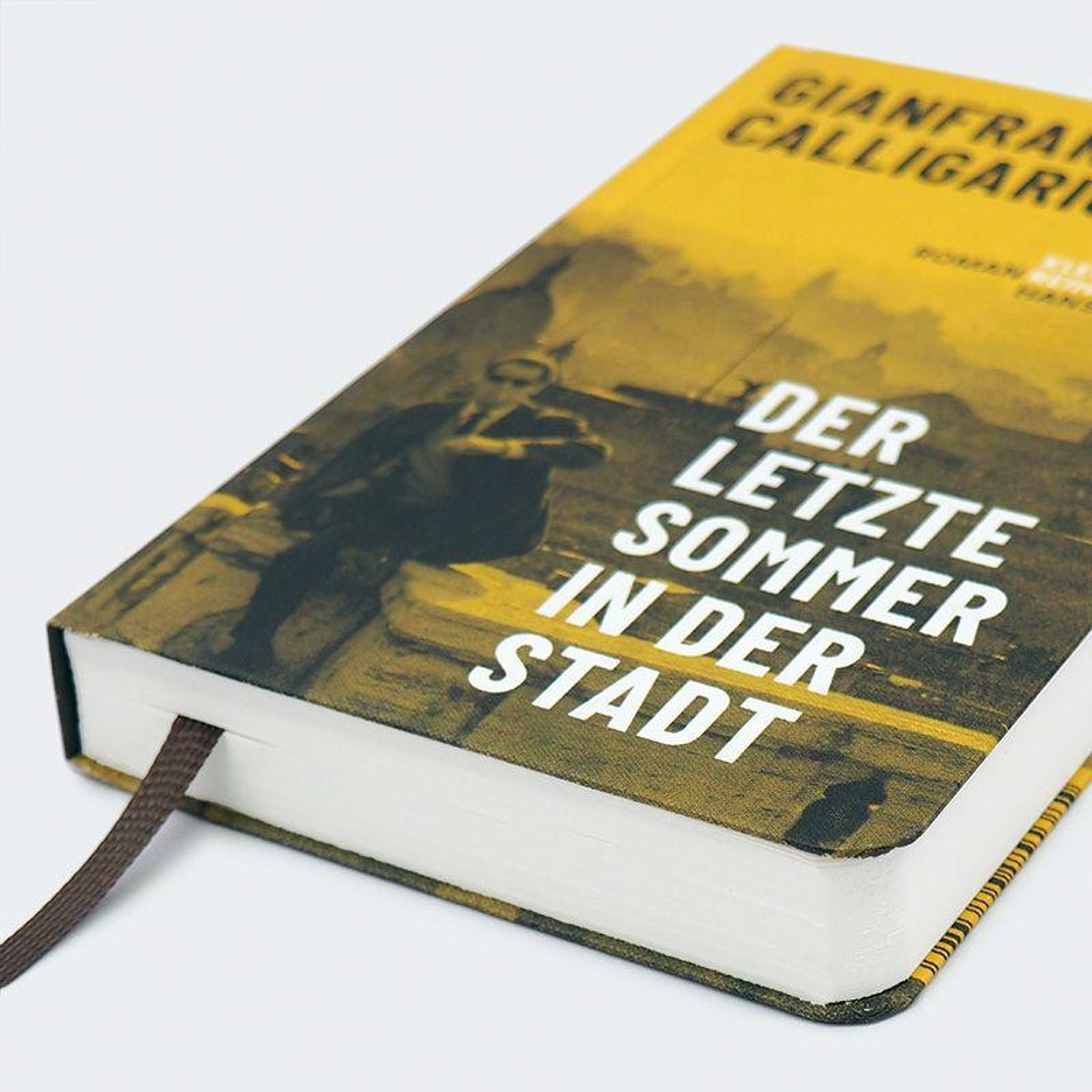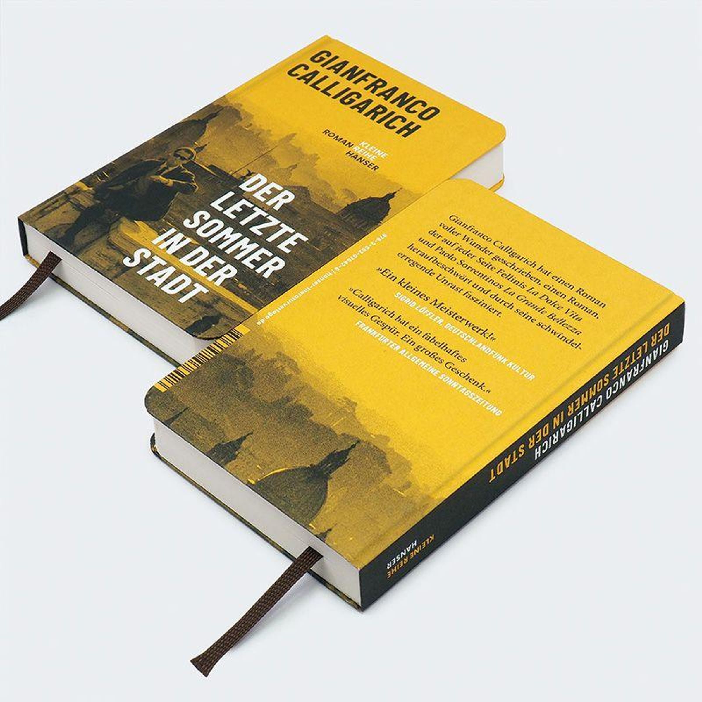 Text: "GIANFRANCO CALLIGARICH", "KLEINE ROMAN REIHE HANSER", "DER LETZTE SOMMER IN DER STADT". Skyline mit Mann in Anzug., Buch