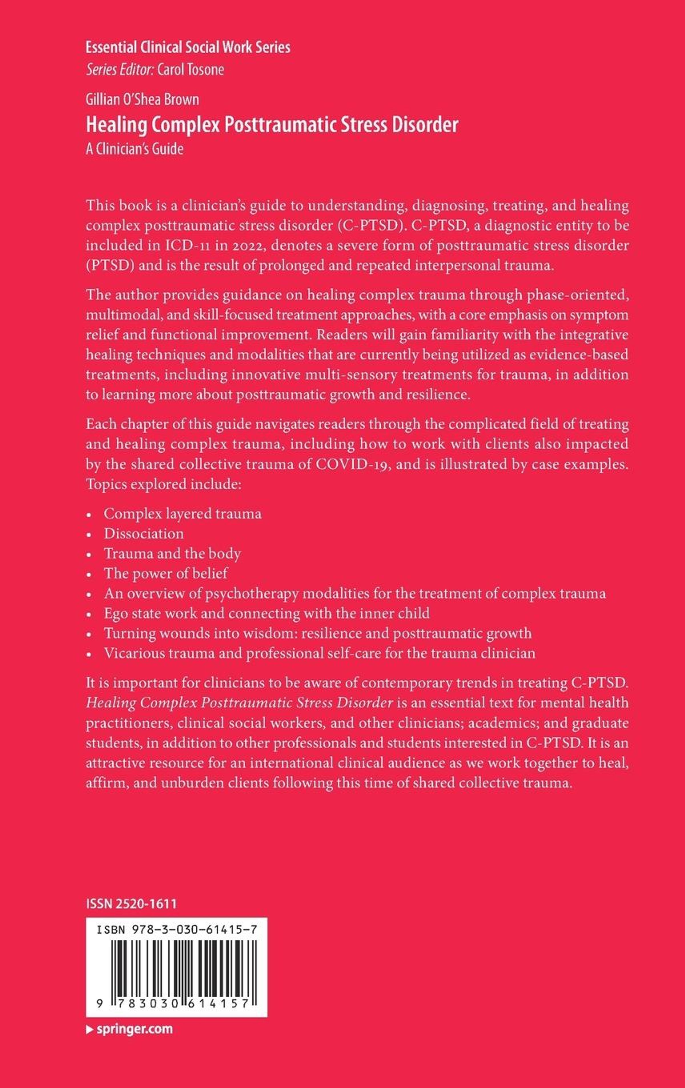 It is important for clinicians to be aware of contemporary trends in treating C-PTSD. Healing Complex Posttraumatic Stress Disorder is an essential text for mental health practitioners, clinical social workers, and other clinicians; academics; and graduate students, in addition to other professionals and students interested in C-PTSD. It is an attractive resource for an international clinical audience as we work togetherto heal, affirm, and unburden clients following this time of shared collective trauma.