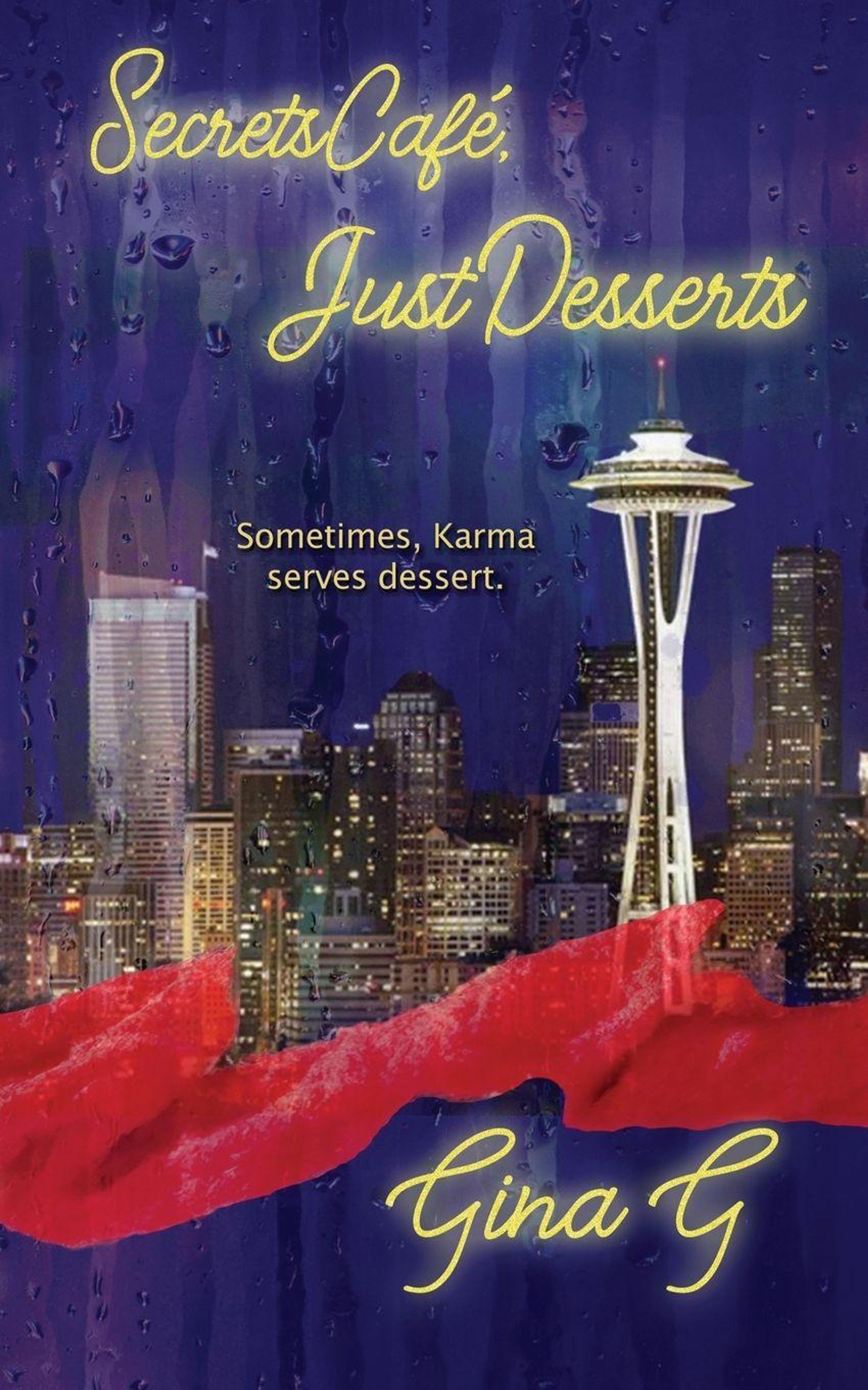 "Secrets Café, Just Desserts," "Sometimes, Karma serves dessert," "Gina G"; Nächtliche Skyline mit Space Needle, Regen., Buch