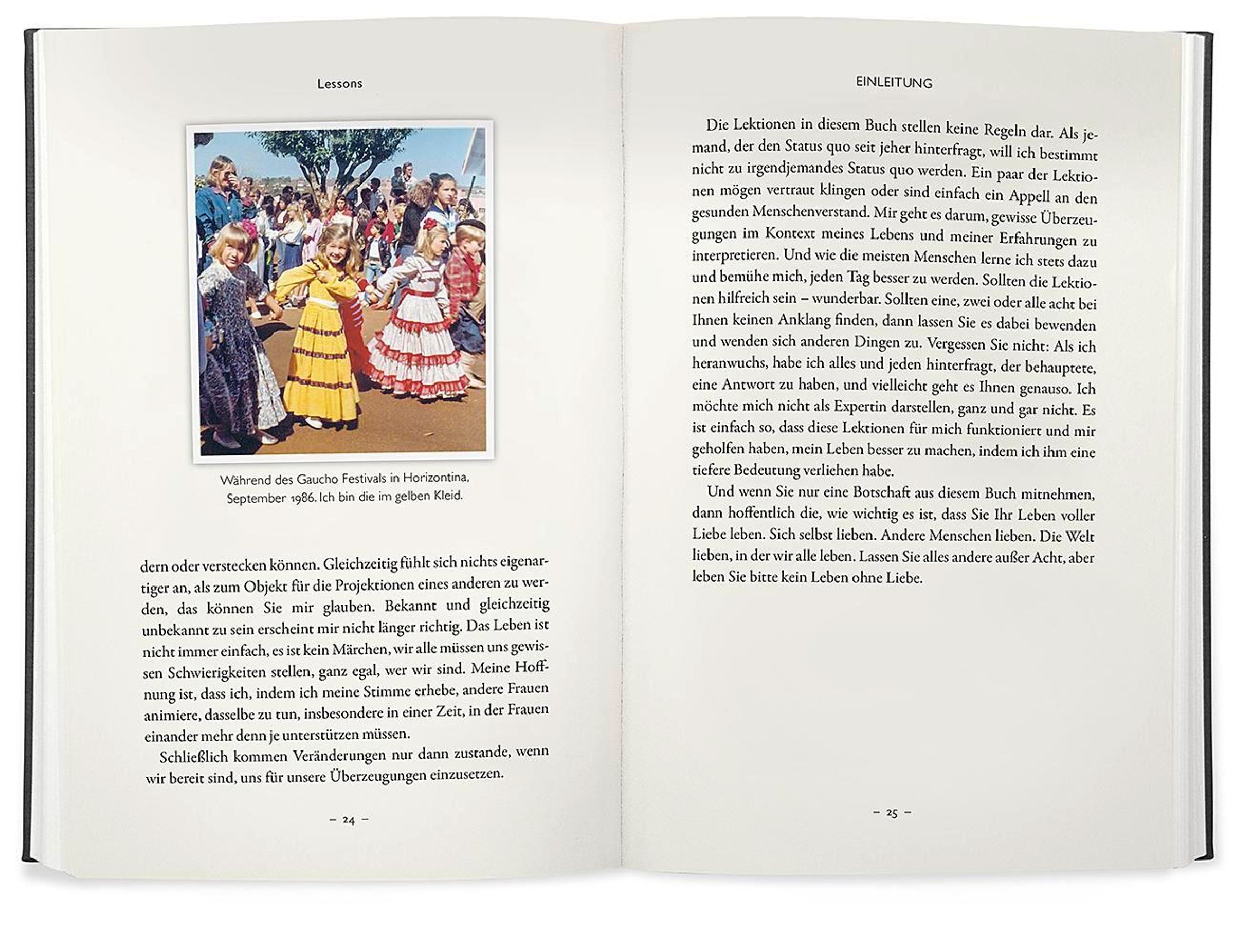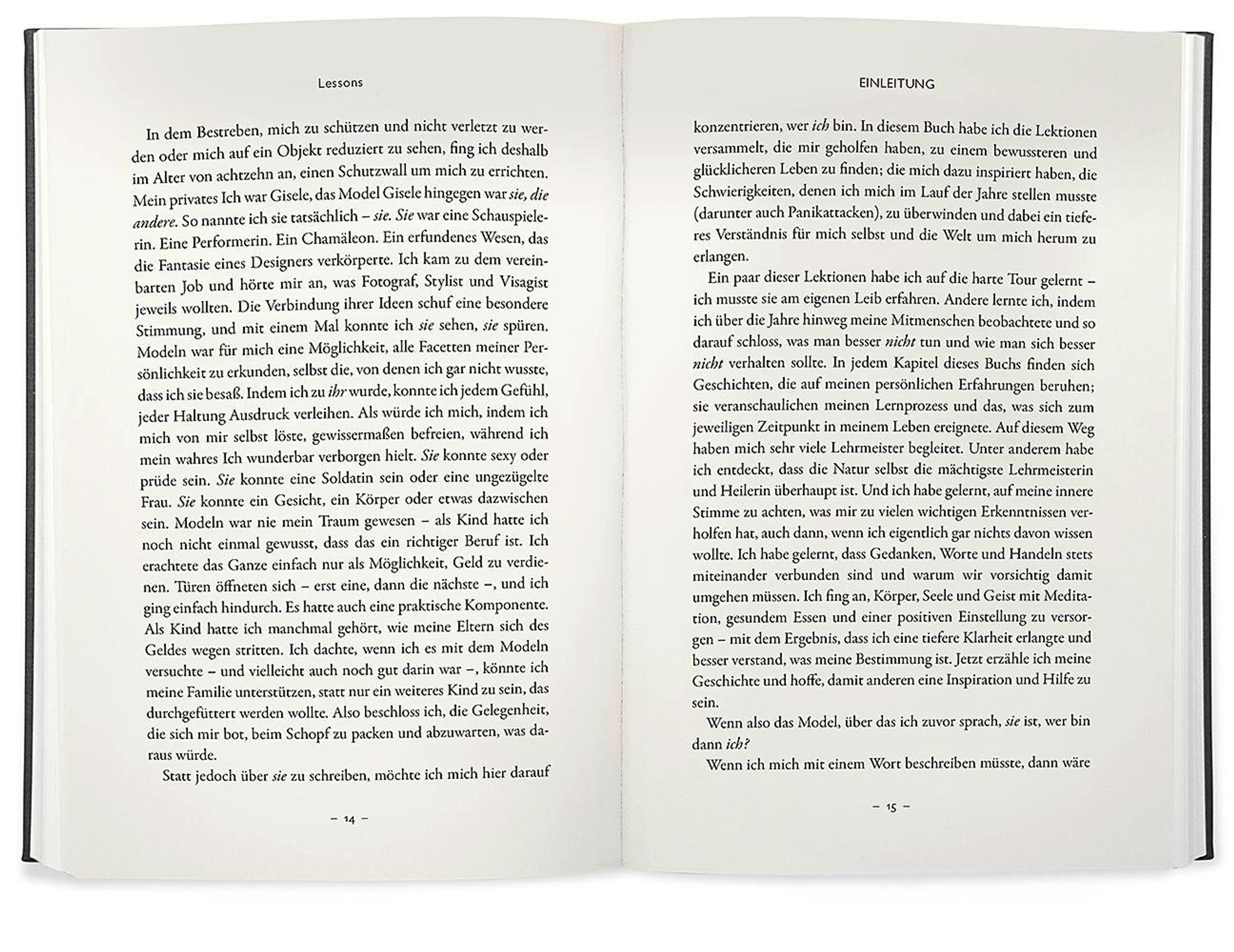 Doch bis heute kennen nur wenige Giseles wahres Gesicht. Das einer Frau, deren Privatleben in Kontrast zu ihrem öffentlichen Image steht. In ihrem ersten Buch "Lessons" erzählt sie, wie sie durch die Herausforderungen ihres Lebens zu einem spirituellen Menschen wurde. Dazu gehören heute nicht nur die morgendliche Meditation und Yoga-Praxis, sondern auch eine bewusste Lebensweise und ein engagiertes Handeln für eine bessere Zukunft. Ihre persönlichen Lektionen, z. B. die Schilderung ihrer Panikattacken, berühren tief im Herzen und geben zugleich den Impuls, auf sich selbst zu vertrauen.