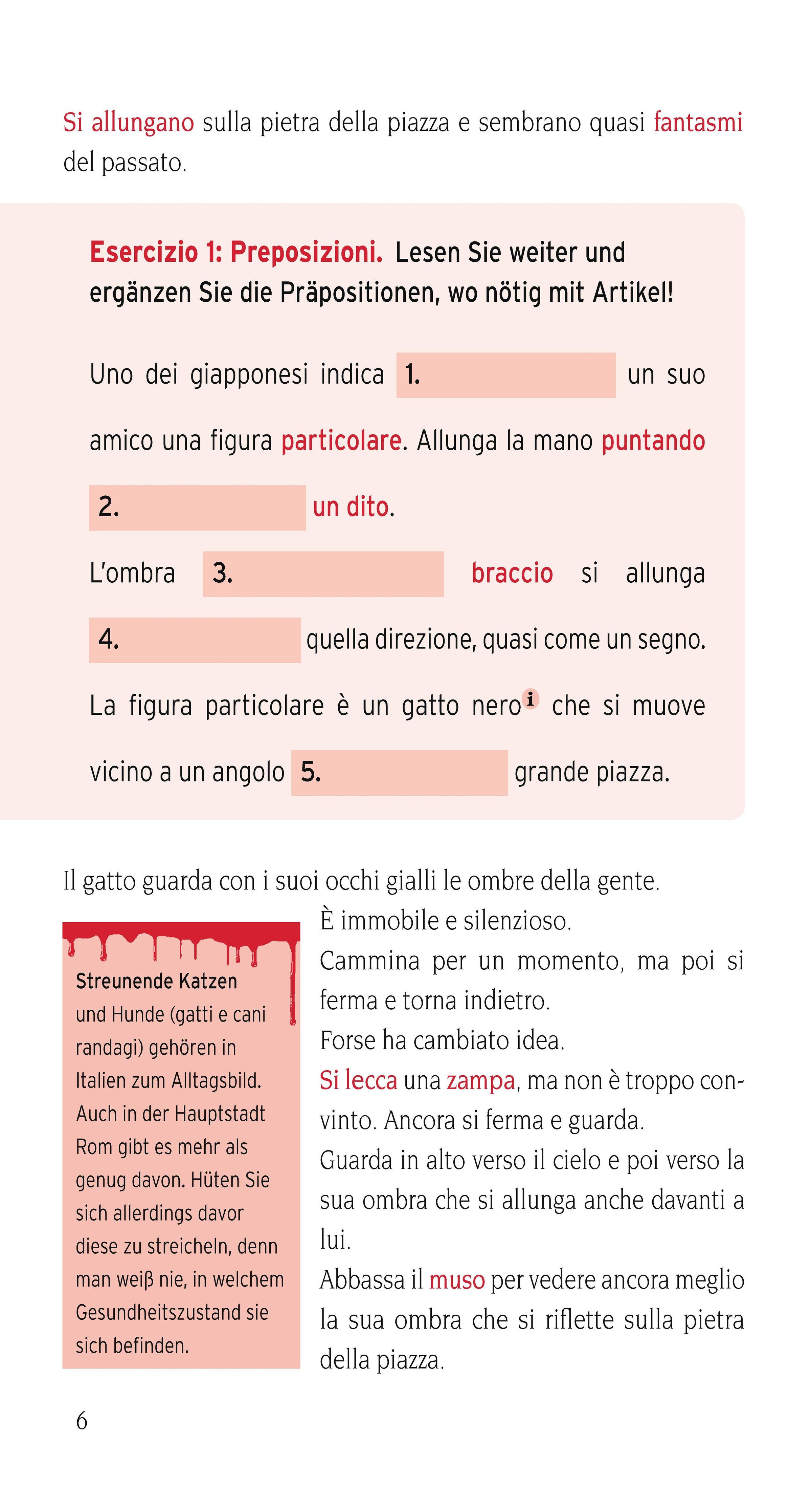 - Infokästen zu Sprache und Grammatik: Zusätzliche Informationen, Tipps und Wissenswertes zu Sprache, Grammatik und Landeskunde runden den Lernkrimi Thriller "Vendetta al Vaticano" ab.