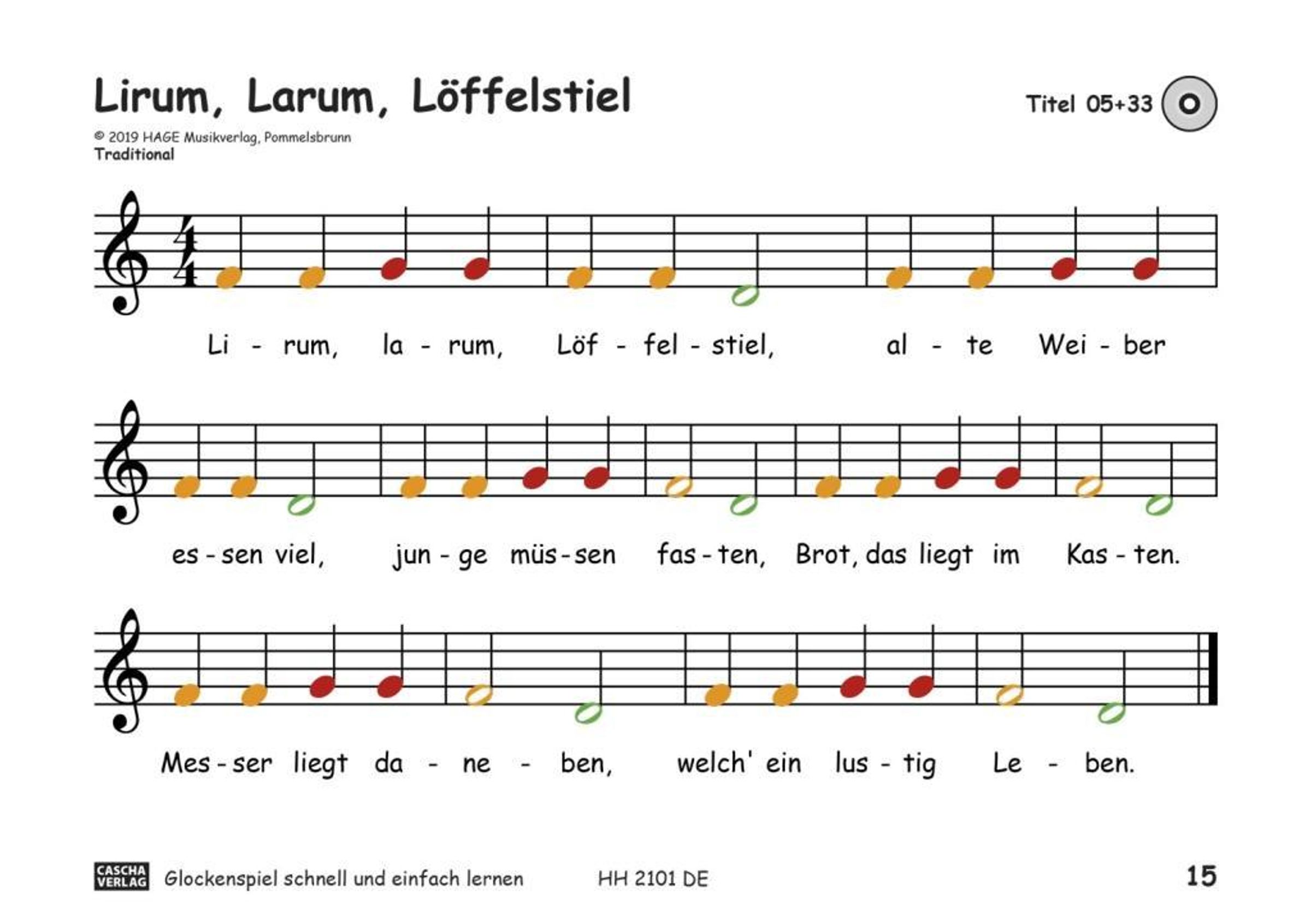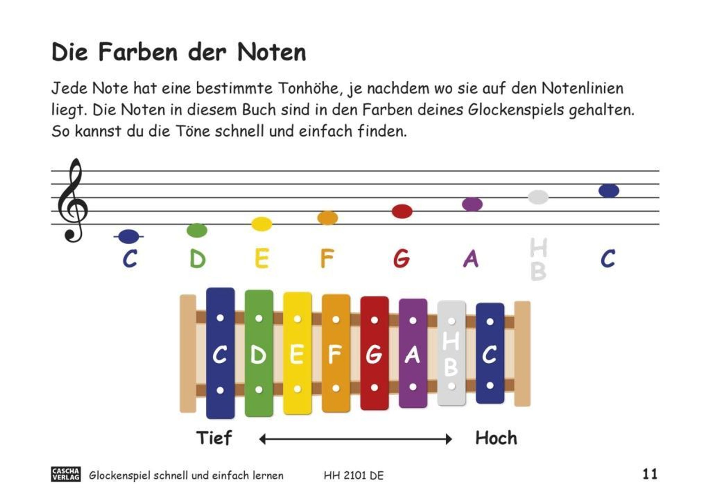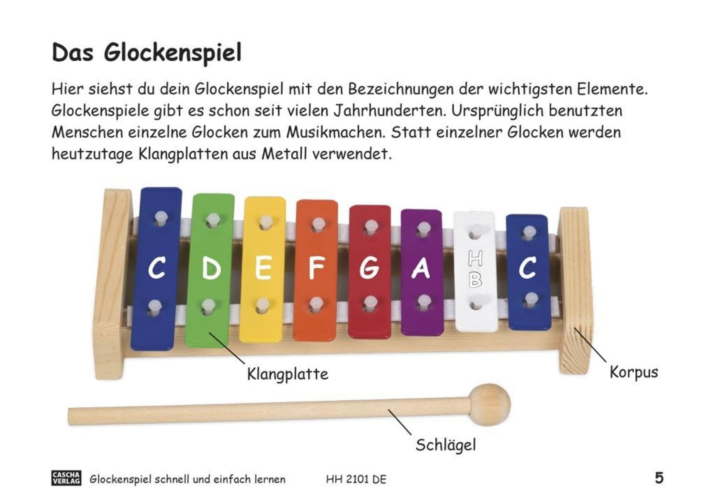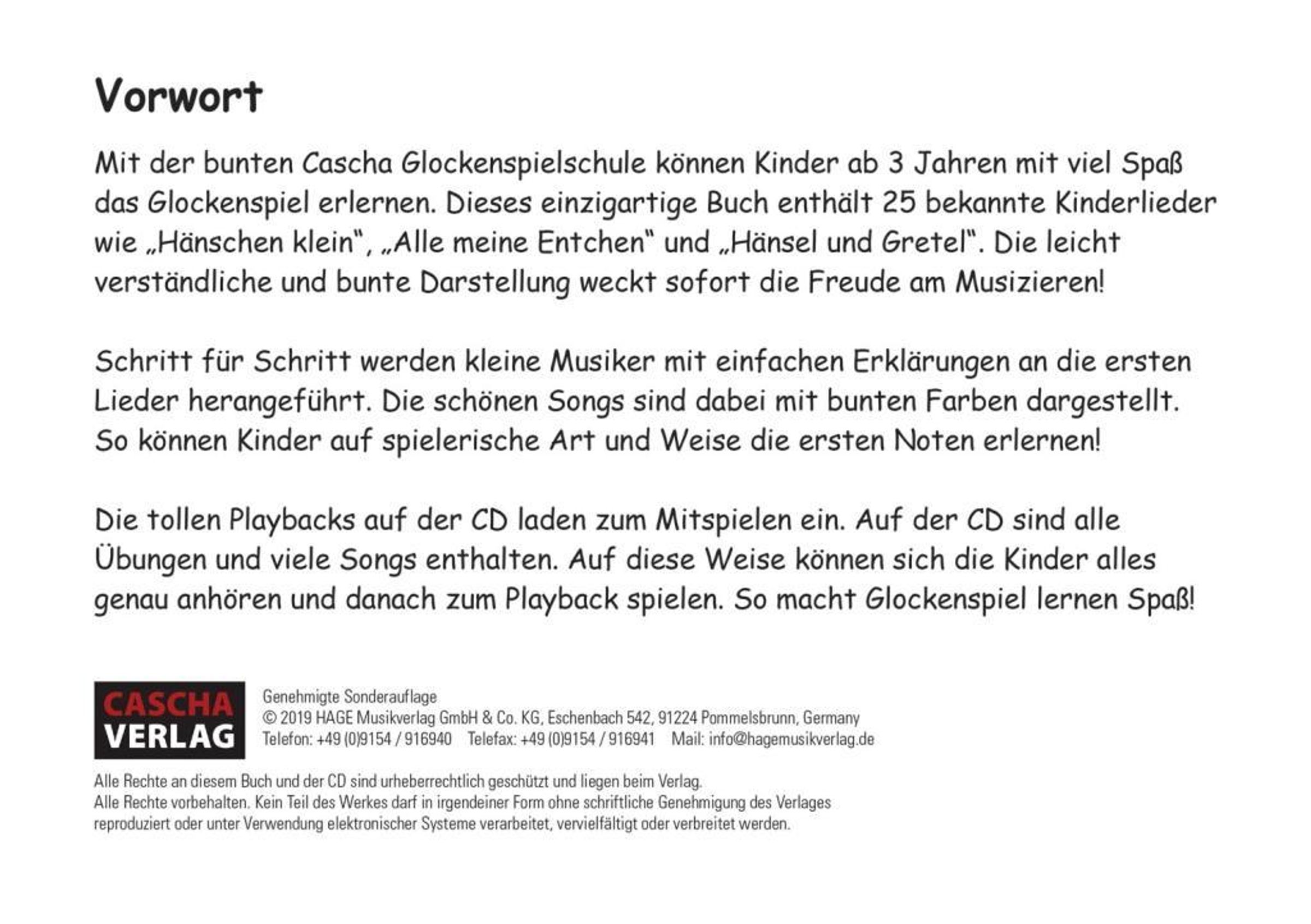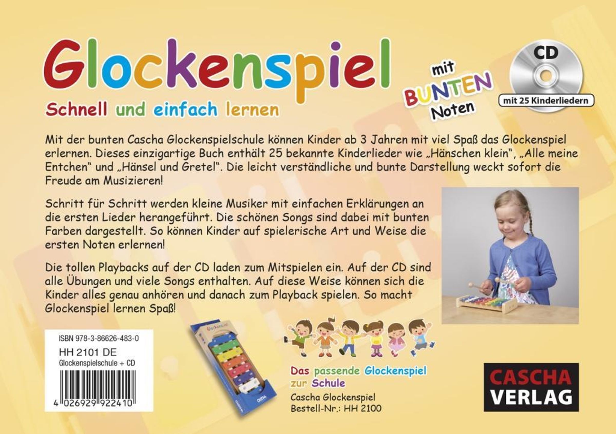 Mit der bunten Cascha Glockenspielschule können Kinder ab 3 Jahren mit viel Spaß das Glockenspiel erlernen. Dieses einzigartige Buch enthält 25 bekannte Kinderlieder wie "Hänschen klein", "Alle meine Entchen" und "Hänsel und Gretel". Die leicht verständliche und bunte Darstellung weckt sofort die Freude am Musizieren.