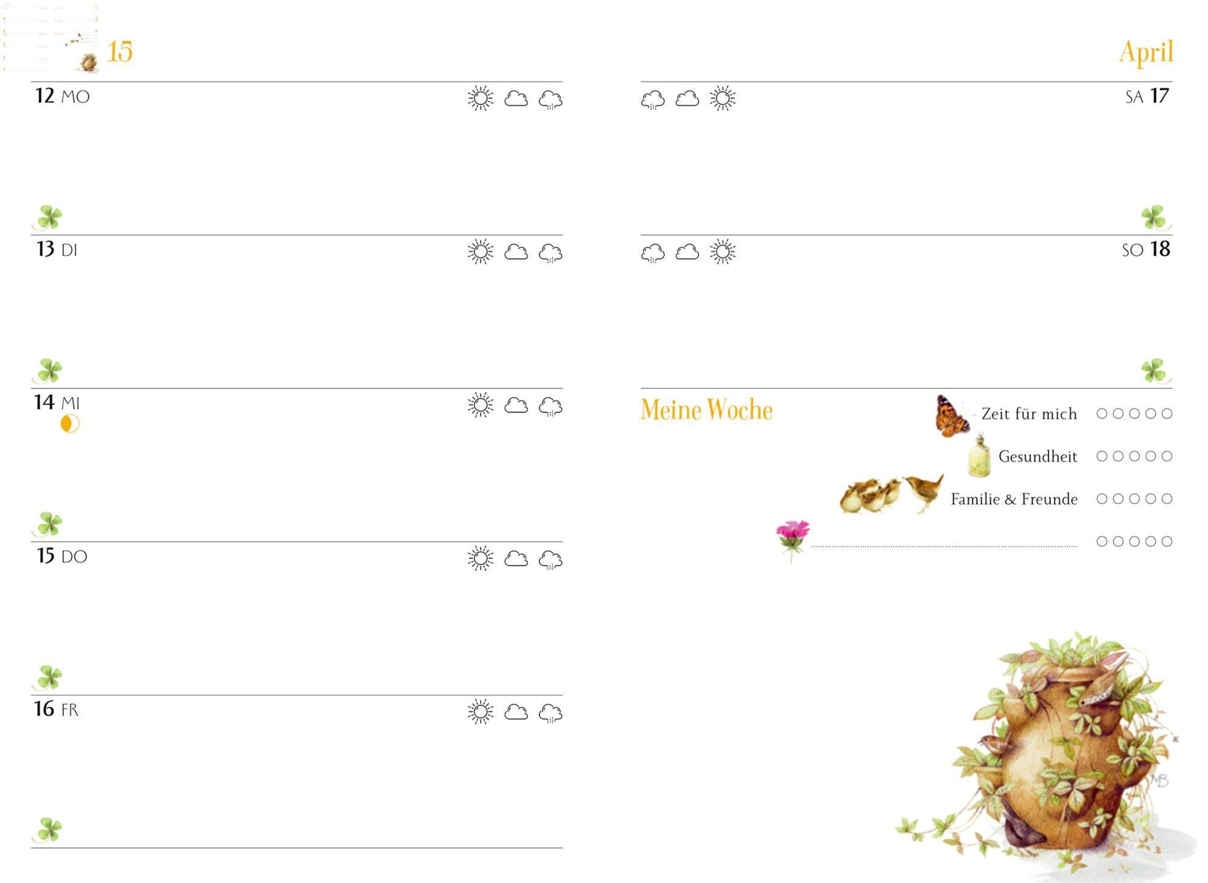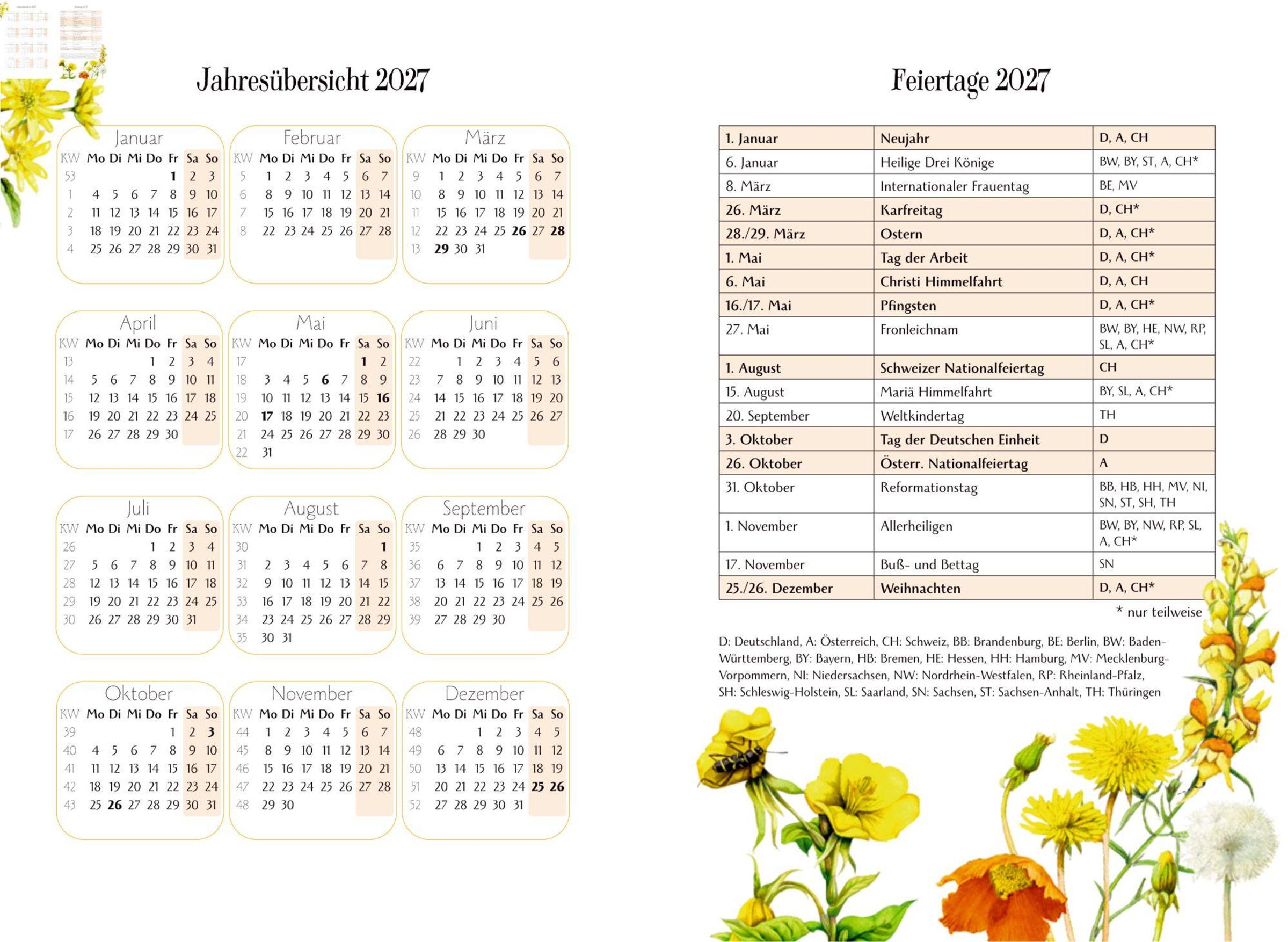 Dein besonderer Kalender für 2027 - mit zauberhaften Illustrationen von Marjolein Bastin! Dieser hochwertige GlücksKalender ist mehr als nur ein Wochenplaner - hier können die schönen Erlebnisse des Alltags festgehalten werden und einzigartige Illustrationen der Künstlerin Marjolein Bastin begleiten durch das ganze Jahr. Auf einer liebevoll gestalteten Doppelseite pro Woche finden neben den Terminen auch noch die aktuelle Stimmung und der Glücksmoment des Tages Platz. Das Kalendarium wird durch Feiertage, Mondphasen und Sternzeichen ergänzt und machen diesen GlücksKalender zum perfekten Begleiter für das Jahr 2027.