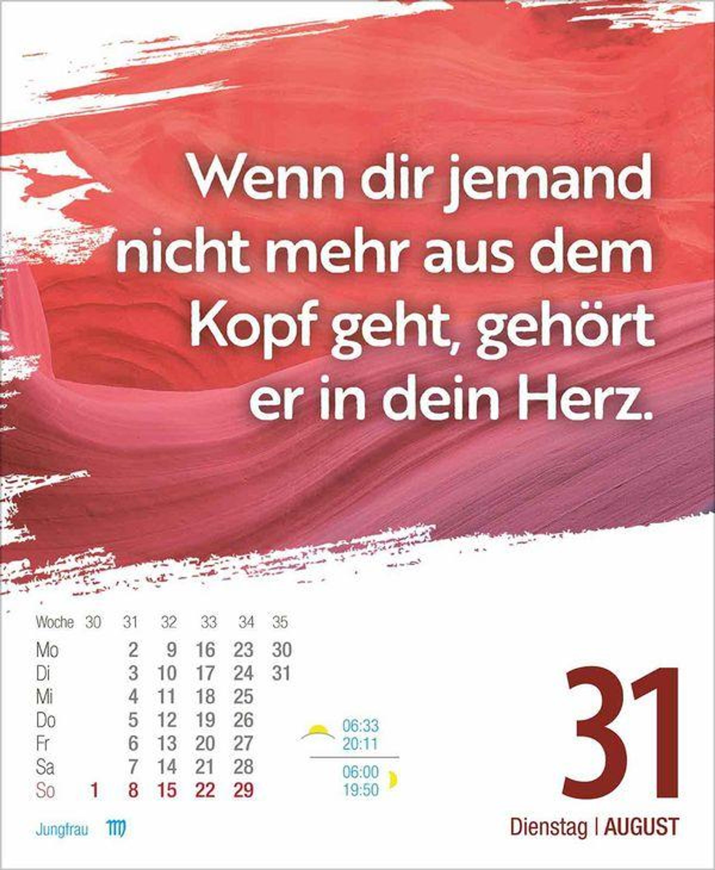 Kalender zum Aufstellen oder Aufhängen. Je Wochentag ein Kalenderblatt, Samstag / Sonntag auf einem Blatt.