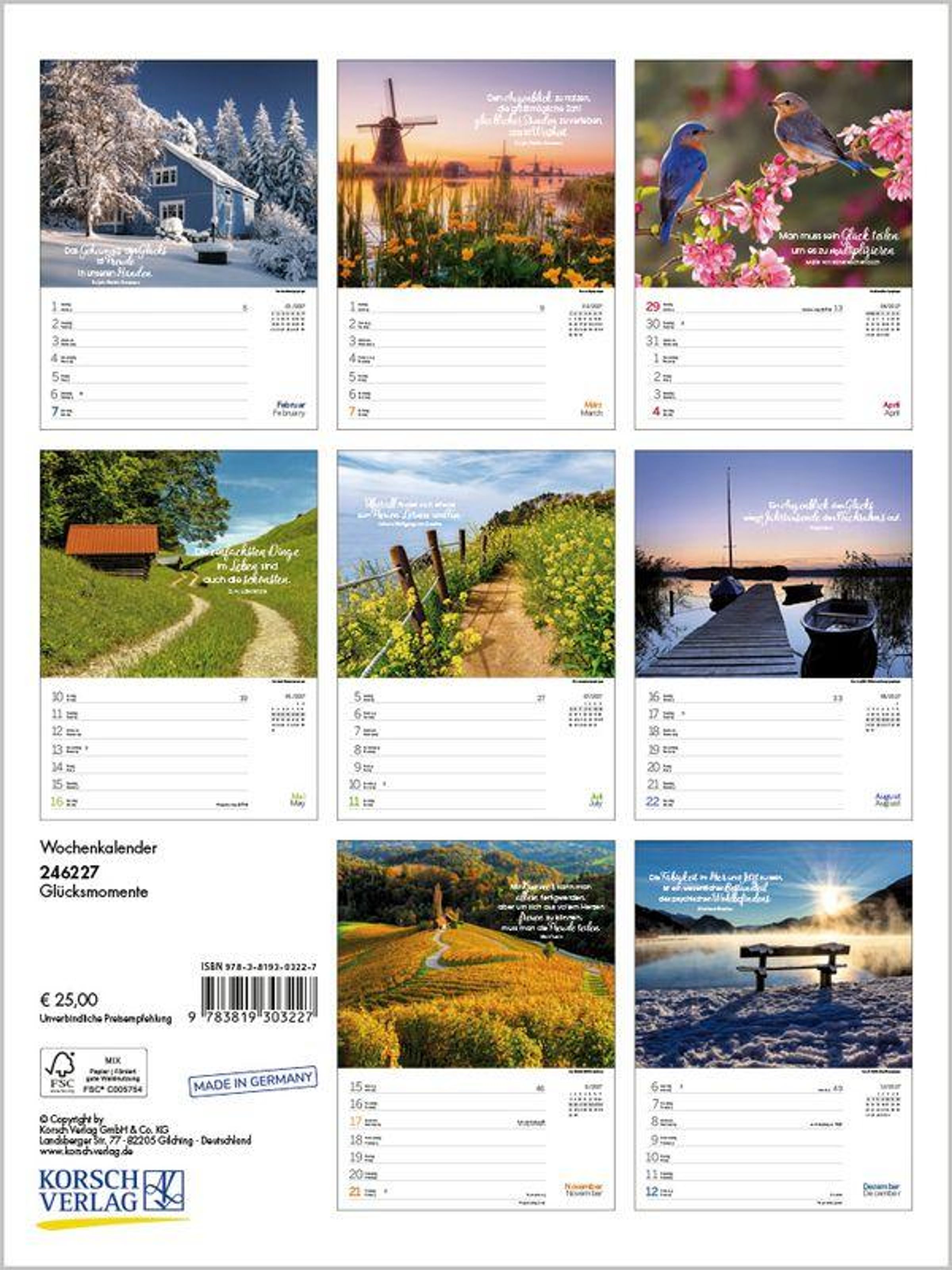 Glücksmomente mit traumhaften Fotos und Zitaten kann man mit diesem Wochenkalender auf 53 Blatt das ganze Jahr genießen. Das übersichtliche Kalendarium bietet zudem Platz für Eintragungen und Termine. Mit Klimabeitrag hergestellt auf nachhaltig produziertem Papier.