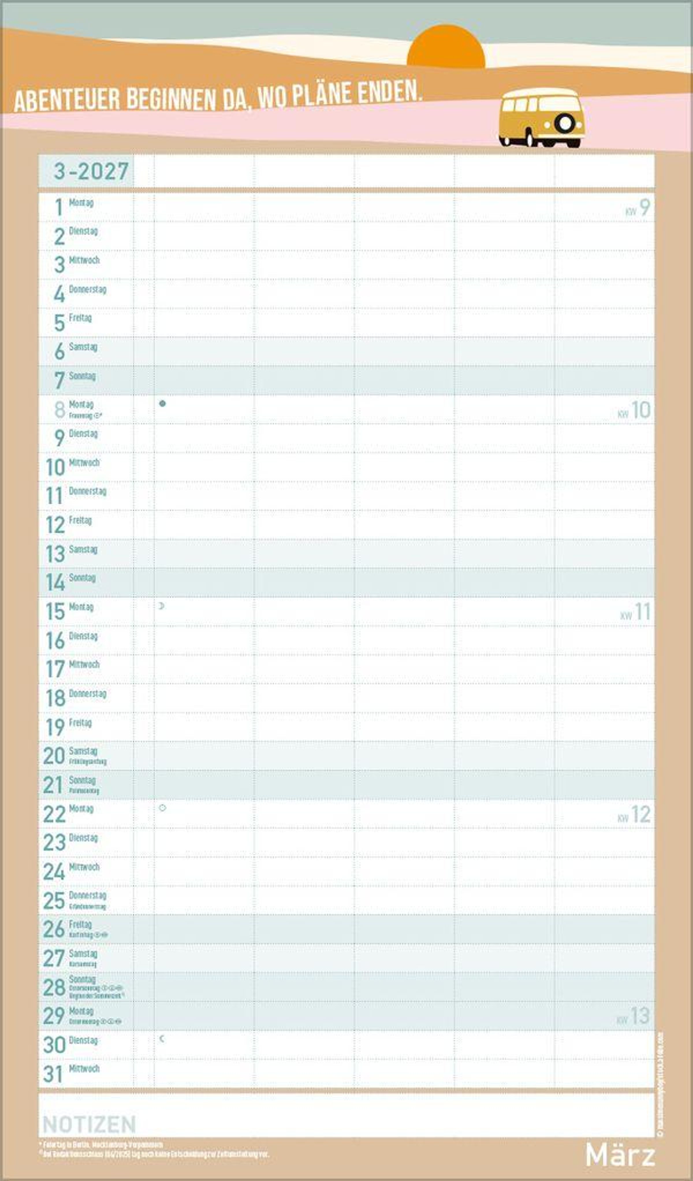 - Farblich hervorgehobene Sonn- und Feiertage sowie Anzeige der Zeitumstellung