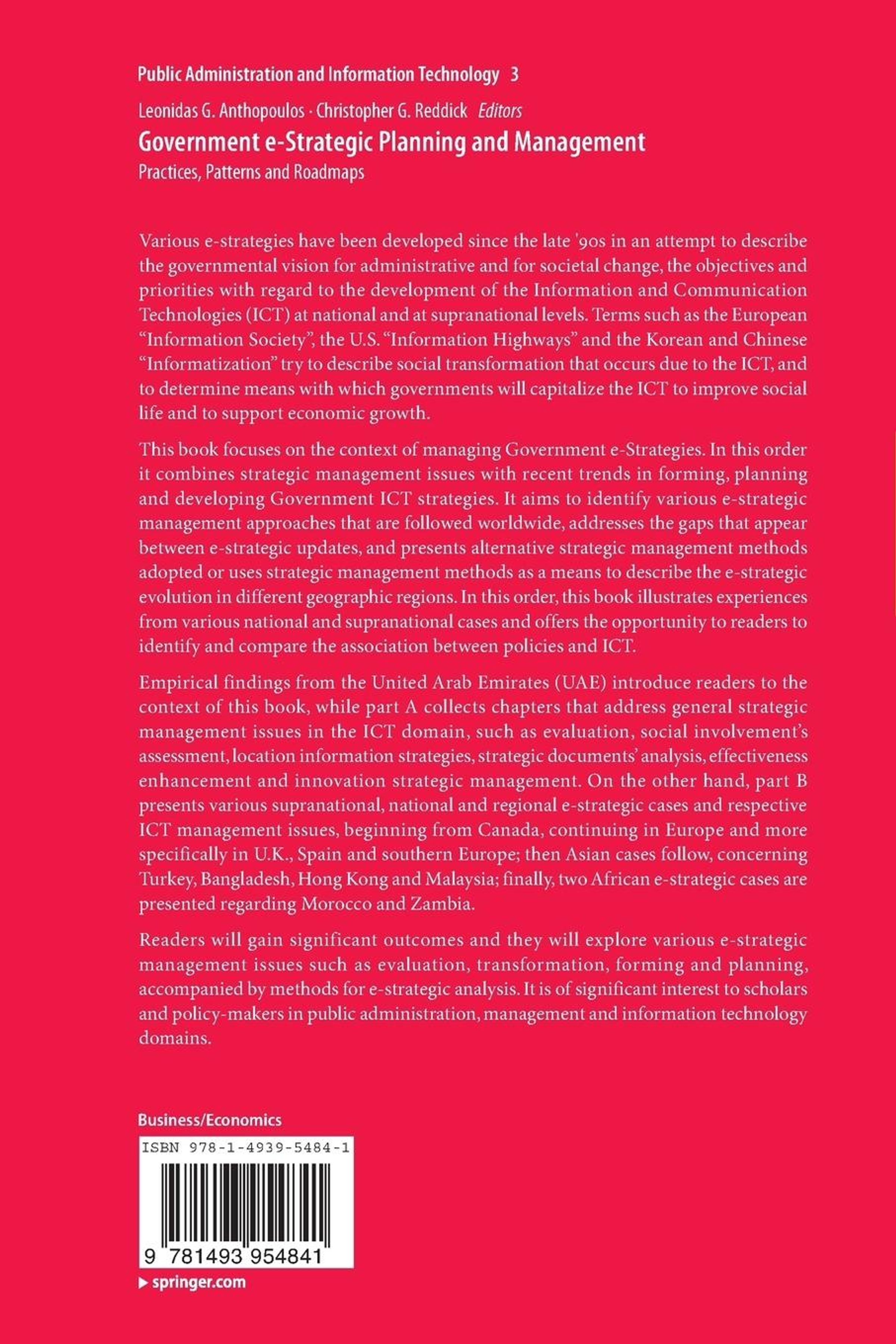 Various e-strategies have been developed since the late '90s in an attempt to describe the governmental vision for administrative and for societal change, the objectives and priorities with regard to the development of the Information and Communication Technologies (ICT) at national and at supranational levels. Terms such as the European Information Society, the U. S. Information Highways and the Korean and Chinese Informatization try to describe social transformation that occurs due to the ICT, and to determine means with which governments will capitalize the ICT to improve social life and to support economic growth. This book focuses on the e-strategic management approaches that are followed worldwide, addresses the gaps that appear between e-strategic updates, and presents alternative strategic management methods adopted or to use strategic management methods as a means to describe the e-strategic evolution in their geographic areas. Each chapter evaluates e-strategic management approaches, to define multi-criteria decision-making systems for e-strategic transformation and Indicative methods for e-strategic analysis. This book also illustrates experiences from national and supranational cases, which come from different geographic areas regarding e-strategic planning and management, and demonstrates e-strategic initiation and development across different countries and continents, and the association between policies and ICT. It also seeks to perform a systematic analysis of various representative cases, in order to capture the realized e-Strategic transformation. It will be of interest to scholars and policy-makers in public administration, management, and information technology.