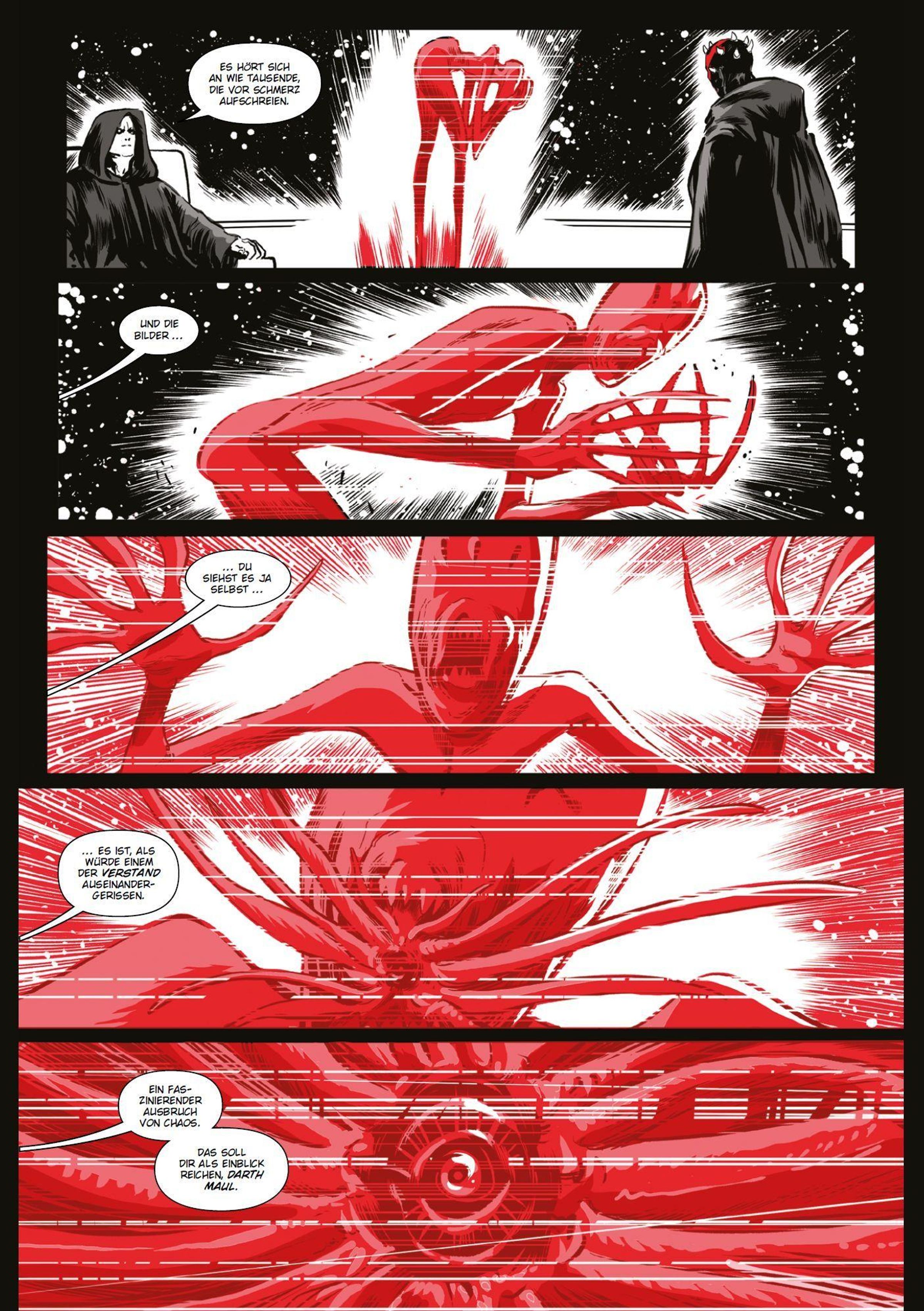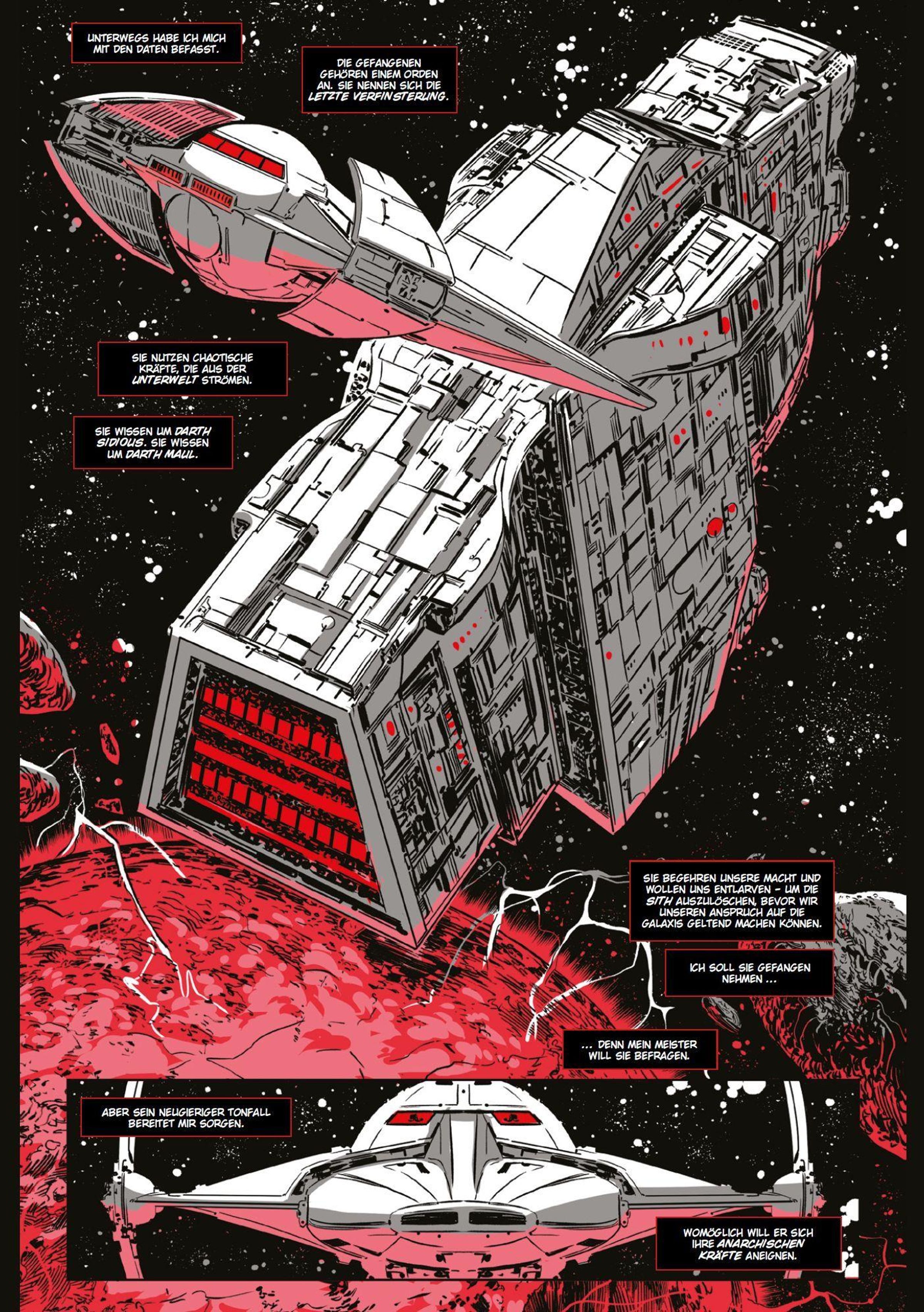 DARTH MAUL IST ZURÜCK! Wer könnte sich besser in die düstere "Schwarz, Weiß & Rot"-Serie einreihen als Darth Maul, der berüchtigte Sith-Lord mit den schwarzen Tätowierungen auf seiner roten Haut? Und deshalb bekommt Maul nach Darth Vader nun auch seine eigene schaurige Anthologie. Unter anderem schickt Imperator Palpatine seinen Schüler aus, um auf einem Gefängnisschiff nach dem Rechten zu sehen, das eine Fehlfunktion hat - und eine gefährliche Sekte transportiert. Was er an Bord vorfindet, ist der Stoff, aus dem Albträume sind!