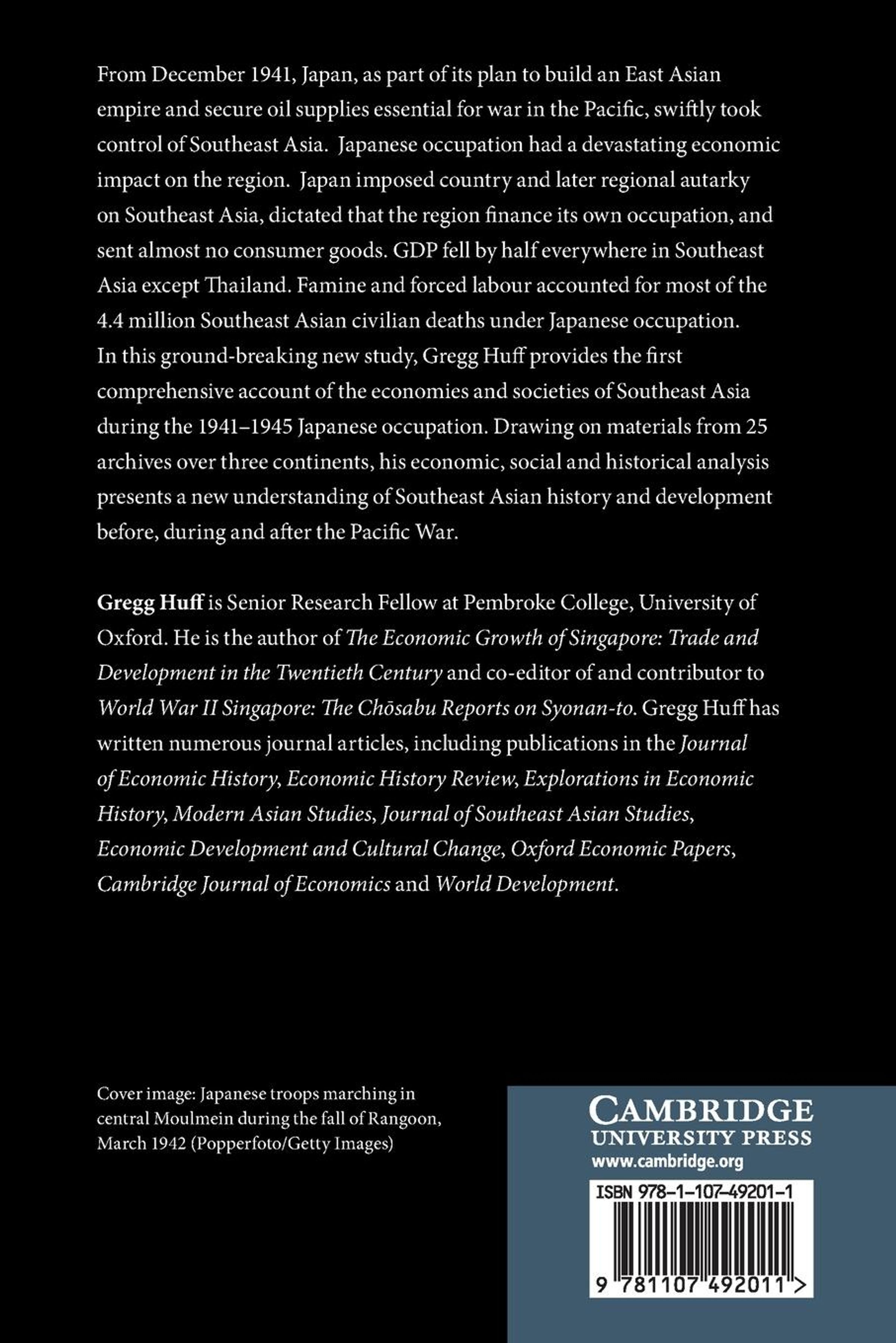 From December 1941, Japan, as part of its plan to build an East Asian empire and secure oil supplies essential for war in the Pacific, swiftly took control of Southeast Asia. Japanese occupation had a devastating economic impact on the region. Japan imposed country and later regional autarky on Southeast Asia, dictated that the region finance its own occupation, and sent almost no consumer goods. GDP fell by half everywhere in Southeast Asia except Thailand. Famine and forced labour accounted for most of the 4.4 million Southeast Asian civilian deaths under Japanese occupation. In this ground-breaking new study, Gregg Huff provides the first comprehensive account of the economies and societies of Southeast Asia during the 1941-1945 Japanese occupation. Drawing on materials from 25 archives over three continents, his economic, social and historical analysis presents a new understanding of Southeast Asian history and development before, during and after the Pacific War.