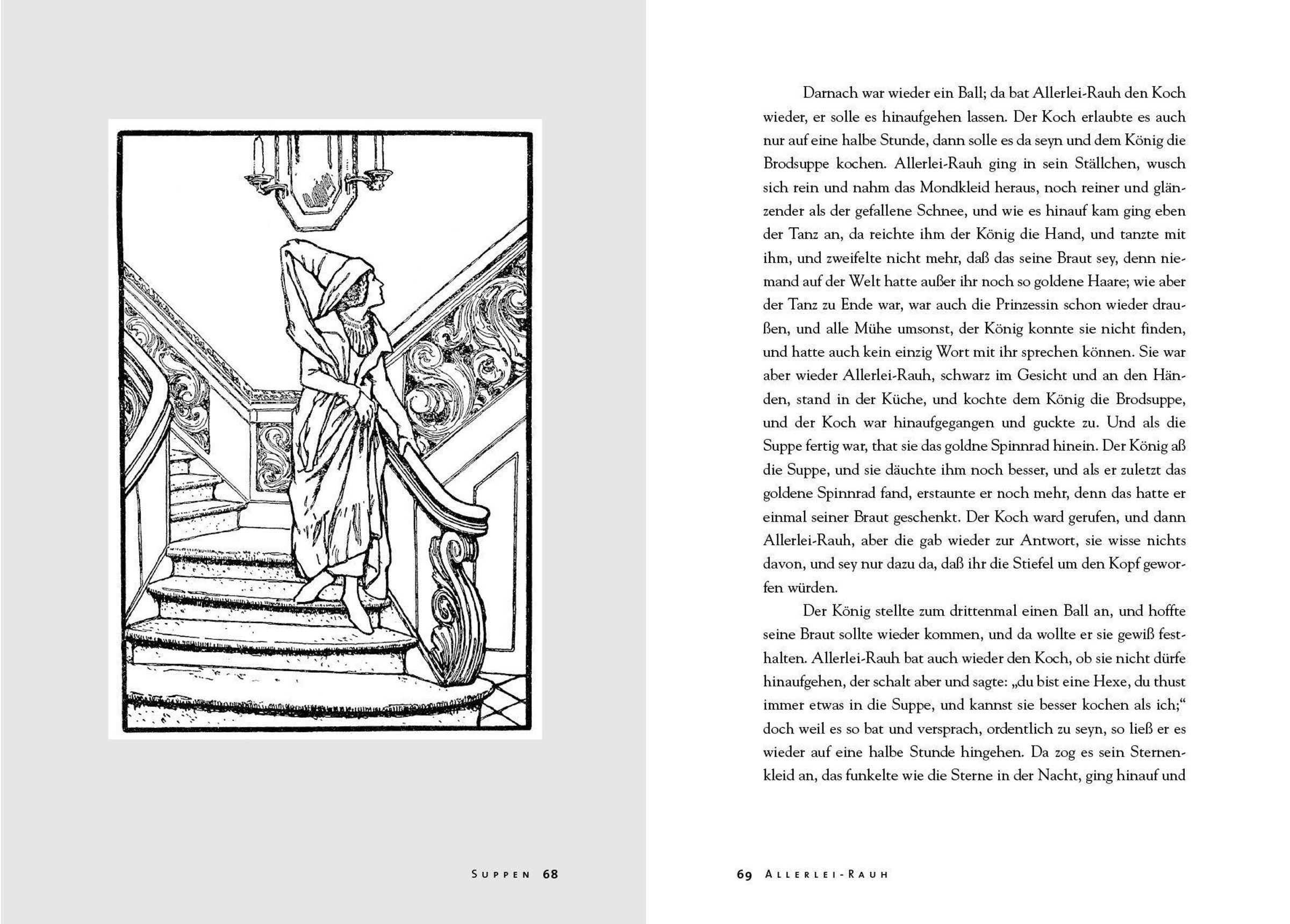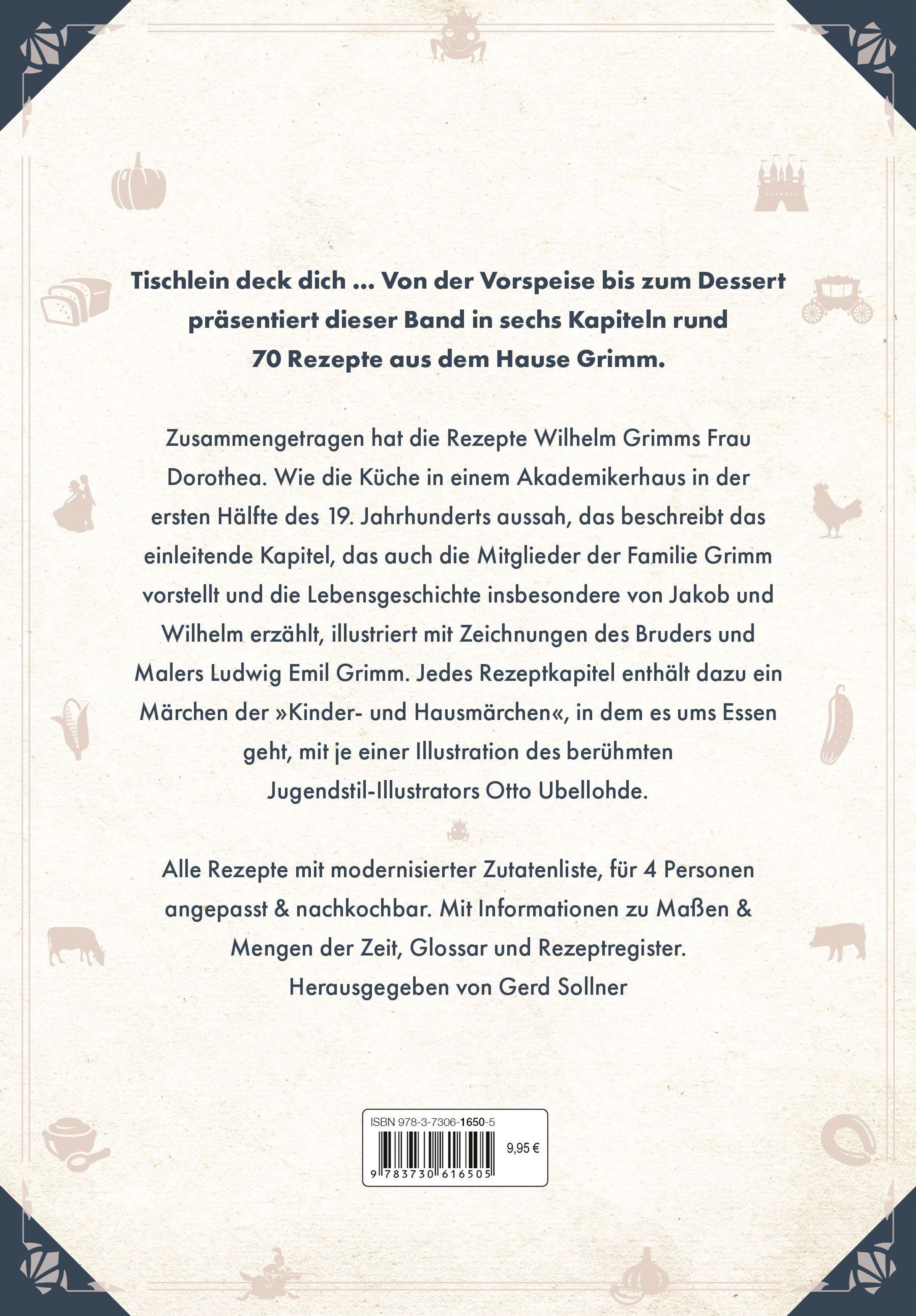 Tischlein deck dich ... Von der Vorspeise bis zum Dessert präsentiert dieser Band in sechs Kapiteln rund 70 Rezepte aus dem Hause Grimm. Zusammengetragen hat die Rezepte Wilhelm Grimms Frau Dorothea. Wie die Küche in einem Akademikerhaus in der ersten Hälfte des 19. Jahrhunderts aussah, das beschreibt das einleitende Kapitel, das auch die Mitglieder der Familie Grimm vorstellt und die Lebensgeschichte insbesondere von Jakob und Wilhelm erzählt, illustriert mit Zeichnungen des Bruders und Malers Ludwig Emil Grimm. Jedes Rezeptkapitel enthält dazu ein Märchen der 'Kinder- und Hausmärchen', in dem es ums Essen geht, mit je einer Illustration des berühmten Jugendstil Illustrators Otto Ubellohde.
