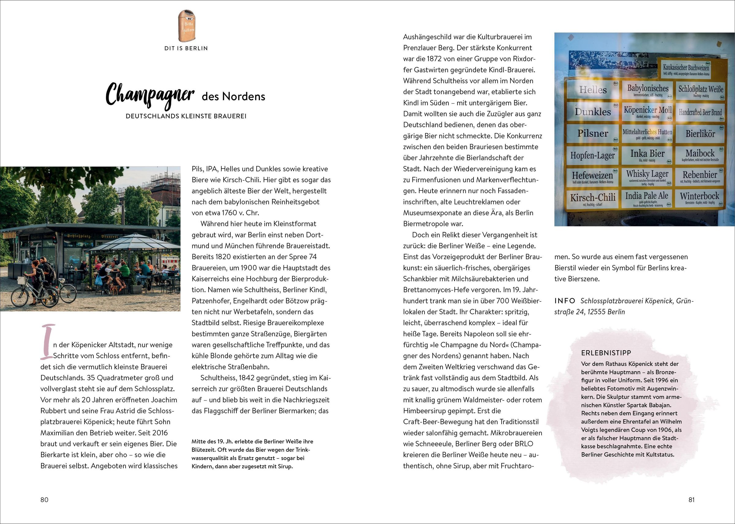 Berlin ist nicht nur Hauptstadt und beliebtestes deutsches Reiseziel, sondern auch eine riesige Schatzkiste an unentdeckten Juwelen. Wer genug von 08 / 15-Sehenswürdigkeiten hat oder glaubt, darüber alles zu wissen, wird hier eines Besseren belehrt. Ob Brückenmeer, japanische Kirschblüte oder Weinberge inmitten der Großstadt, Hollywood-Drehorte und Western-Stadt, verlassene Orte in und um Berlin oder Streetart aller Art - dit is Berlin.