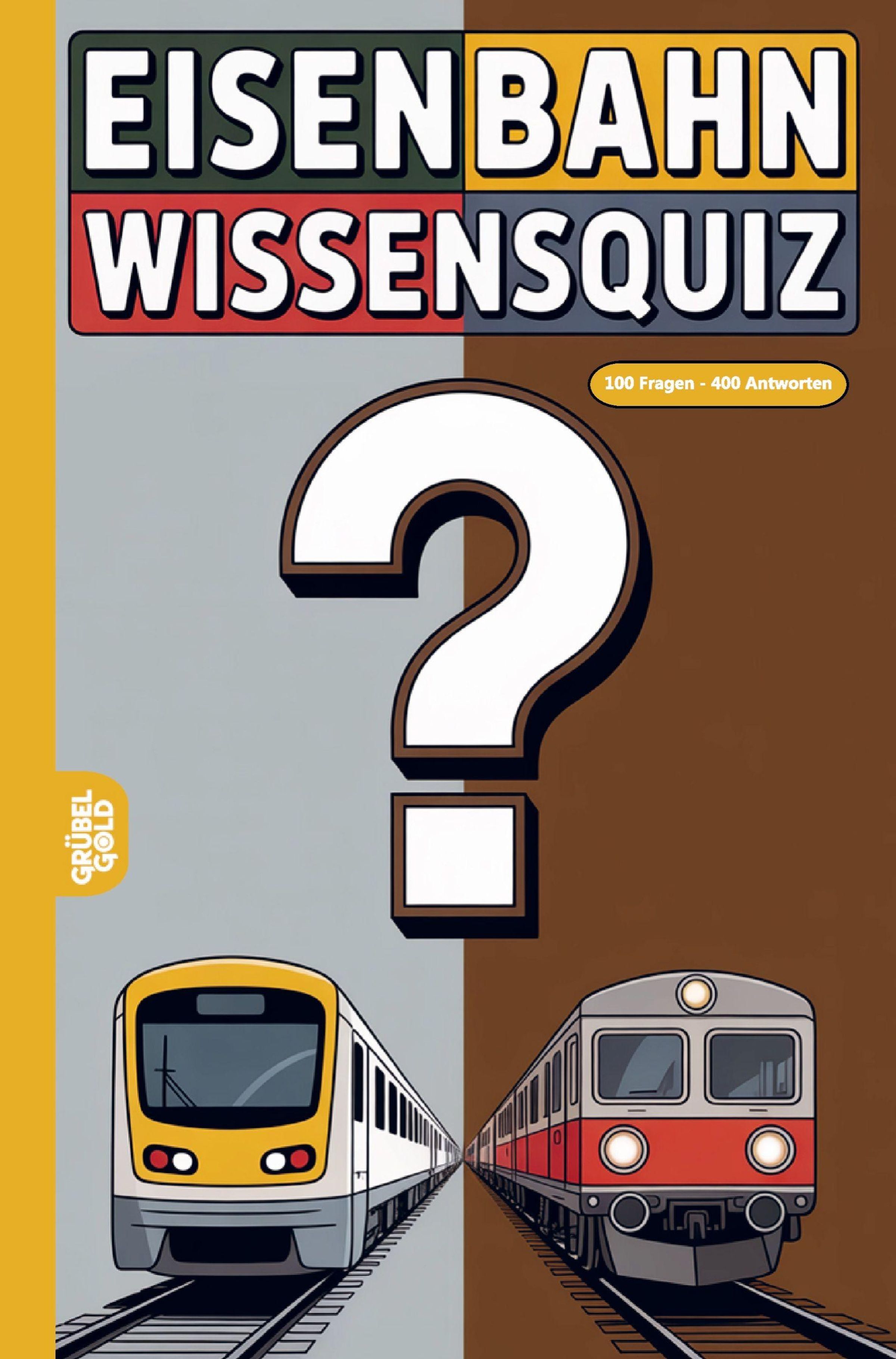 "Eisenbahn Wissensquiz". Illustration: Moderne und alte Züge auf parallelen Gleisen, großes Fragezeichen im Fokus., Buch