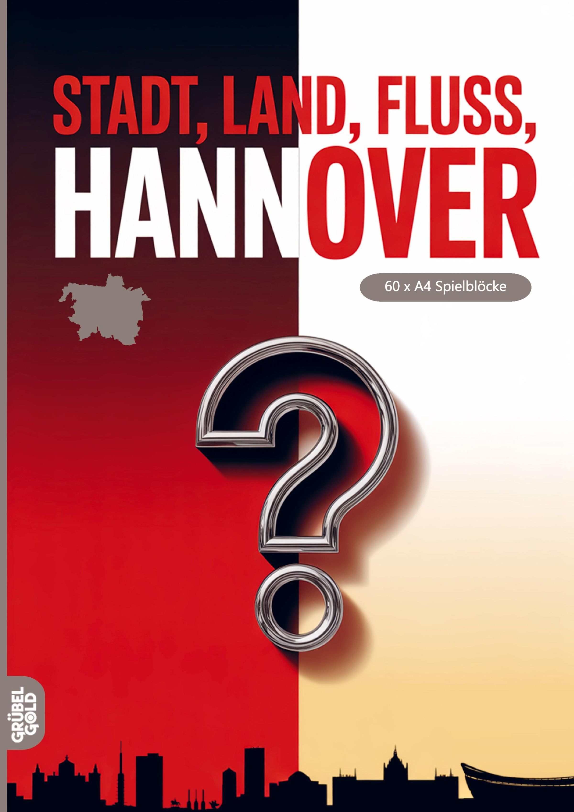 Text: "STADT, LAND, FLUSS, HANNOVER" und "60 x A4 Spielblöcke". Eine Illustration mit Fragezeichen und Silhouetten., Buch