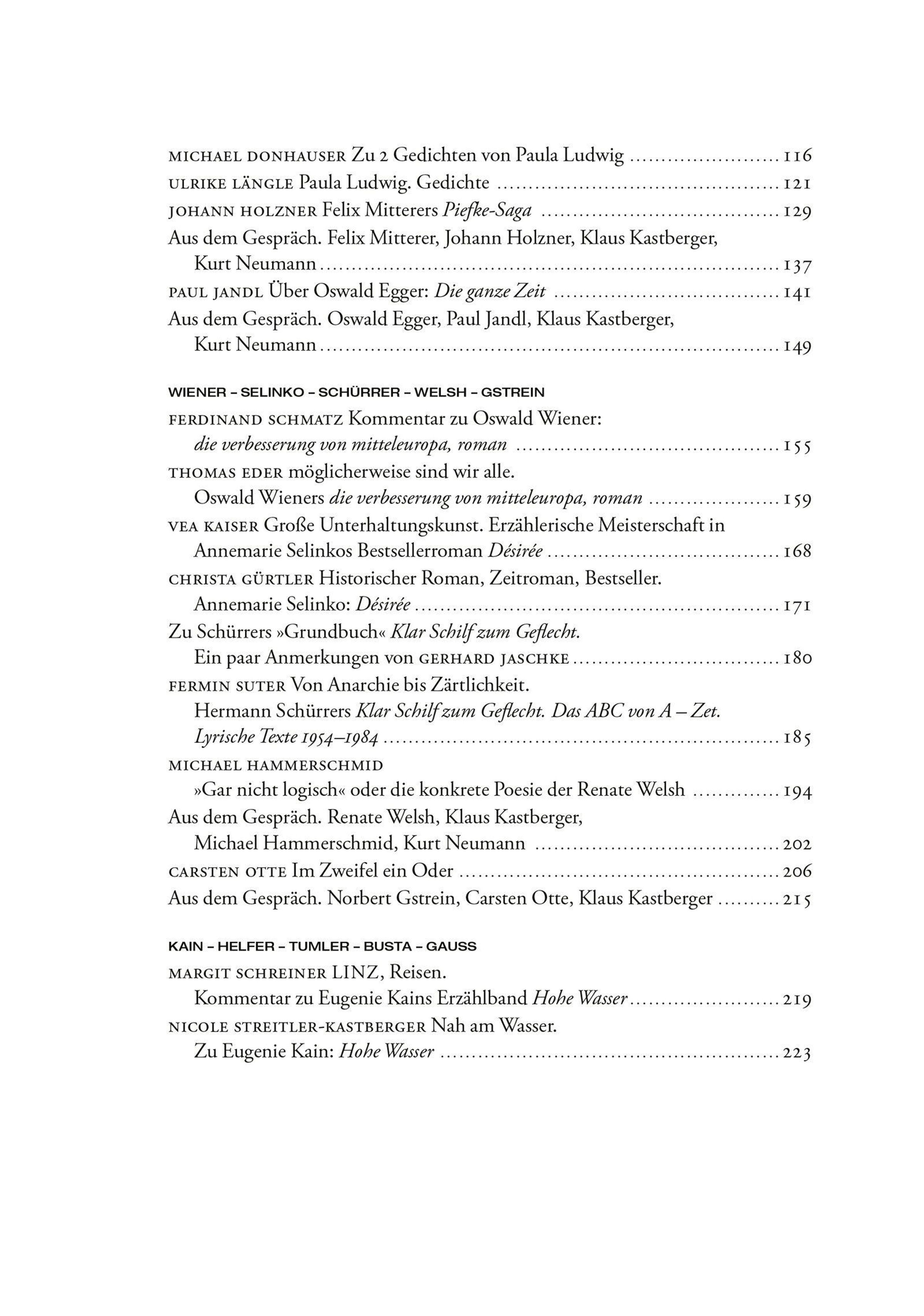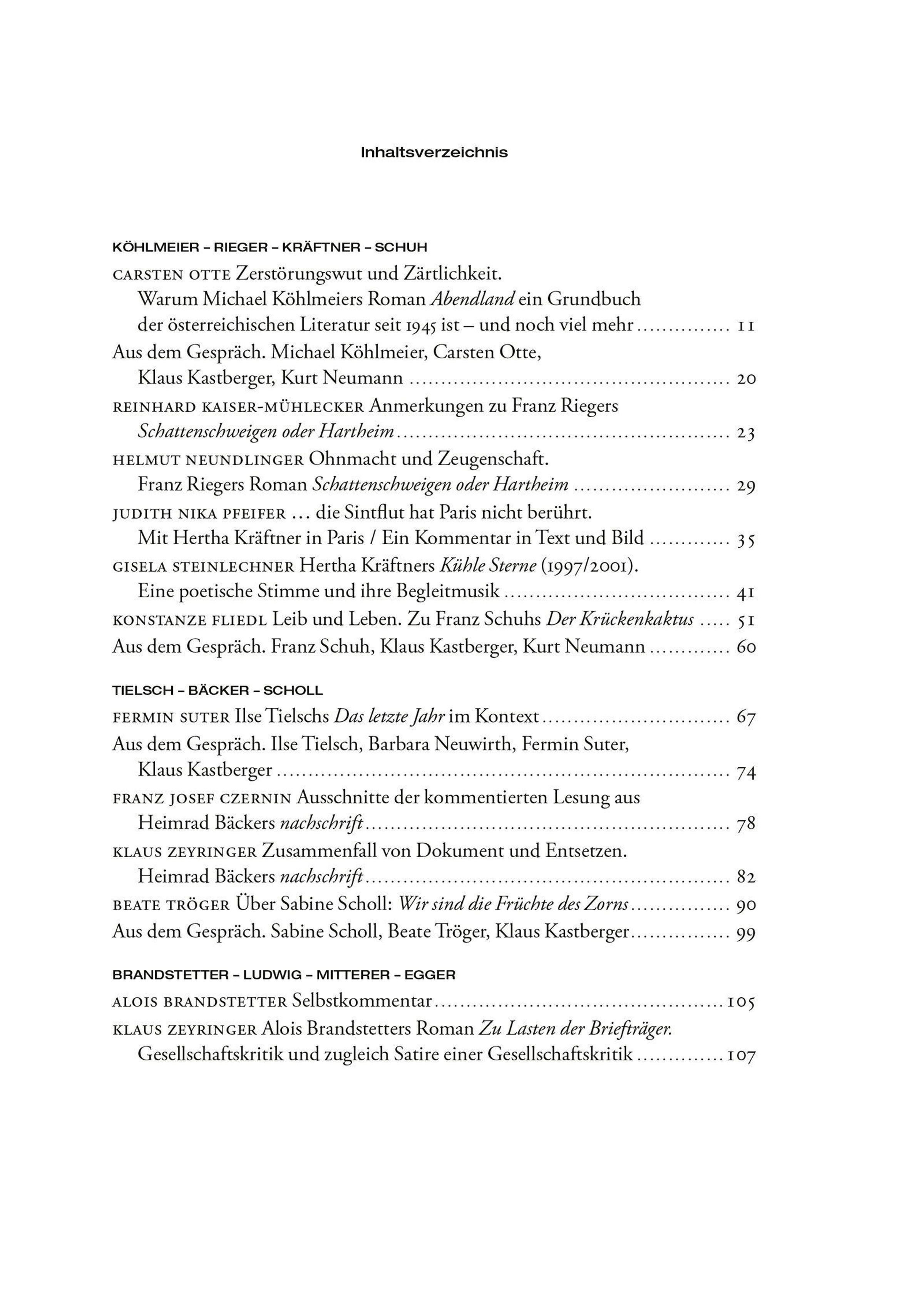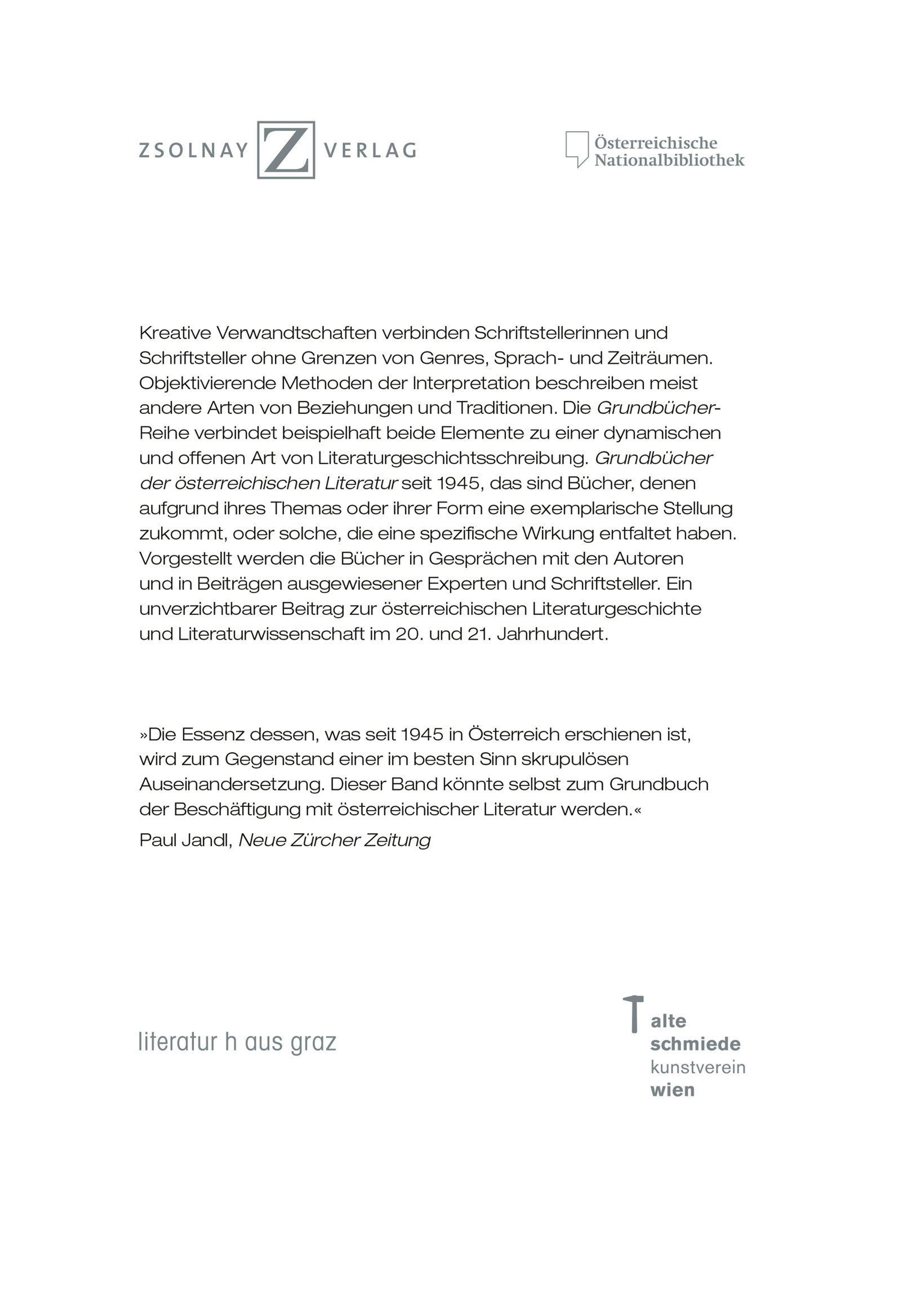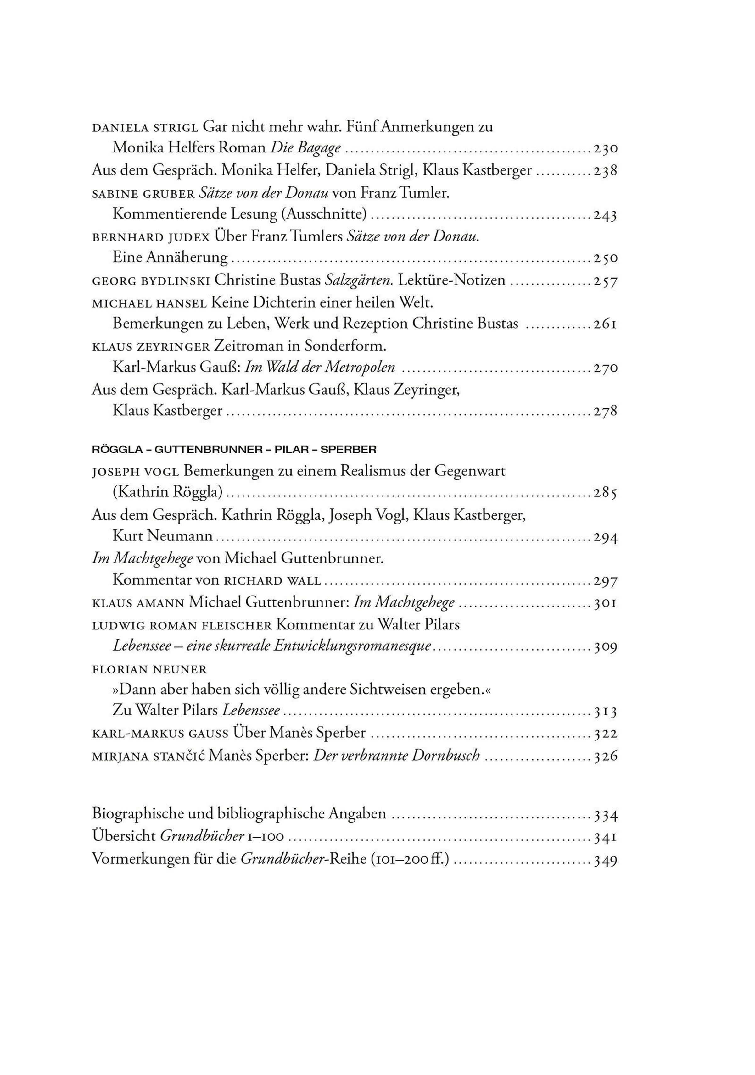 Mit Beiträgen u. a. von Klaus Amann, Alois Brandstetter, Konstanze Fliedl, Karl-Markus Gauß, Christa Gürtler, Monika Helfer, Vea Kaiser, Michael Köhlmeier, Felix Mitterer, Carsten Otte, Kathrin Röggla, Mirjana Stan¿i¿, Daniela Strigl, Joseph Vogl, Renate Welsh und Klaus Zeyringer.