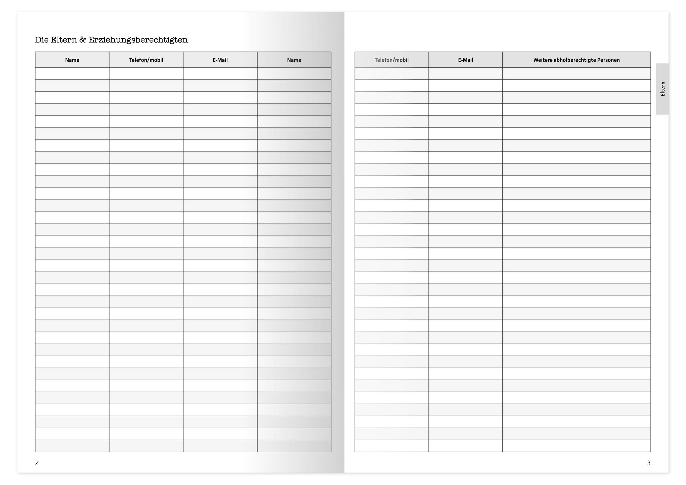 ¿ Wichtige Informationen zu jedem Kind und seinen Eltern: Namen, Adressen, Geburtstage, Arztpraxis, Einschulungstermine sowie Besonderheiten können übersichtlich erfasst werden. Zusätzlich gibt es Platz für Kontaktmöglichkeiten zu den Eltern bzw. Erziehungsberechtigten - so sind wichtige Daten jederzeit griffbereit.