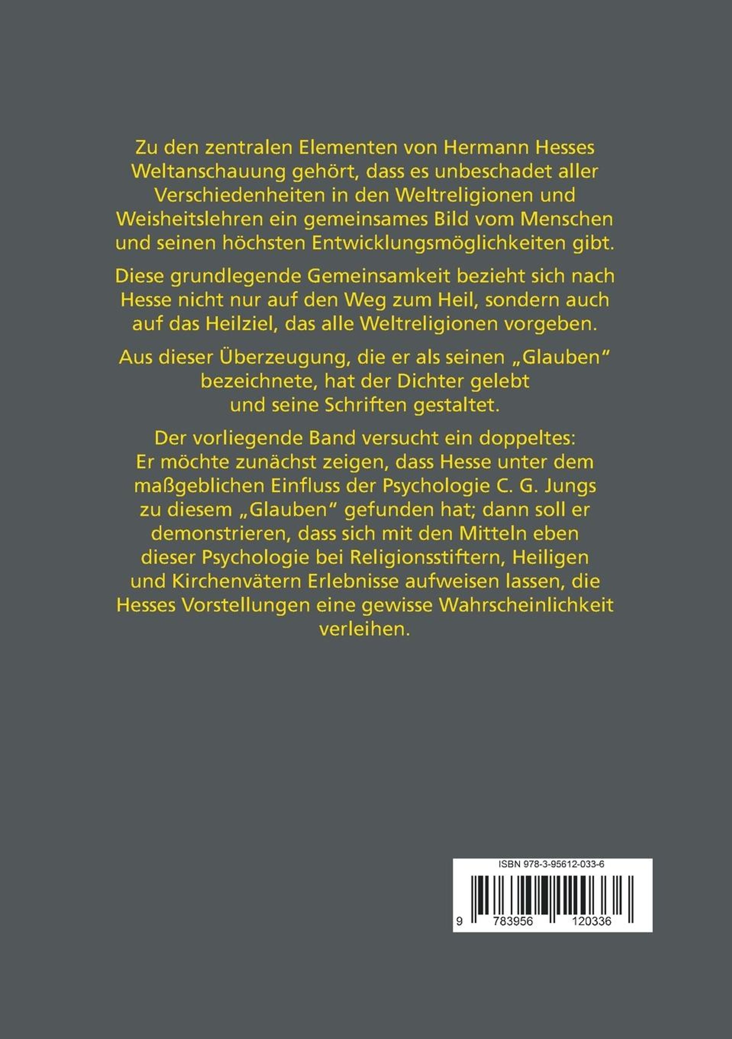 Zu den zentralen Elementen von Hermann Hesses Weltanschauung gehört, dass es unbeschadet aller Verschiedenheiten in den Weltreligionen und Weisheitslehren ein gemeinsames Bild vom Menschen und seinen höchsten Entwicklungsmöglichkeiten gibt. Diese grundlegende Gemeinsamkeit bezieht sich nach Hesse nicht nur auf den Weg zum Heil, sondern auch auf das Heilziel, das alle Weltreligionen vorgeben. Aus dieser Überzeugung, die er als seinen "Glauben" bezeichnete, hat der Dichter gelebt und seine Schriften gestaltet. Der vorliegende Band versucht ein doppeltes: Er möchte zunächst zeigen, dass Hesse unter dem maßgeblichen Einfluss der Psychologie C. G. Jungs zu diesem "Glauben" gefunden hat; dann soll er demonstrieren, dass sich mit den Mitteln eben dieser Psychologie bei Religionsstiftern, Heiligen und Kirchenvätern Erlebnisse aufweisen lassen, die Hesses Vorstellungen eine gewisse Wahrscheinlichkeit verleihen.