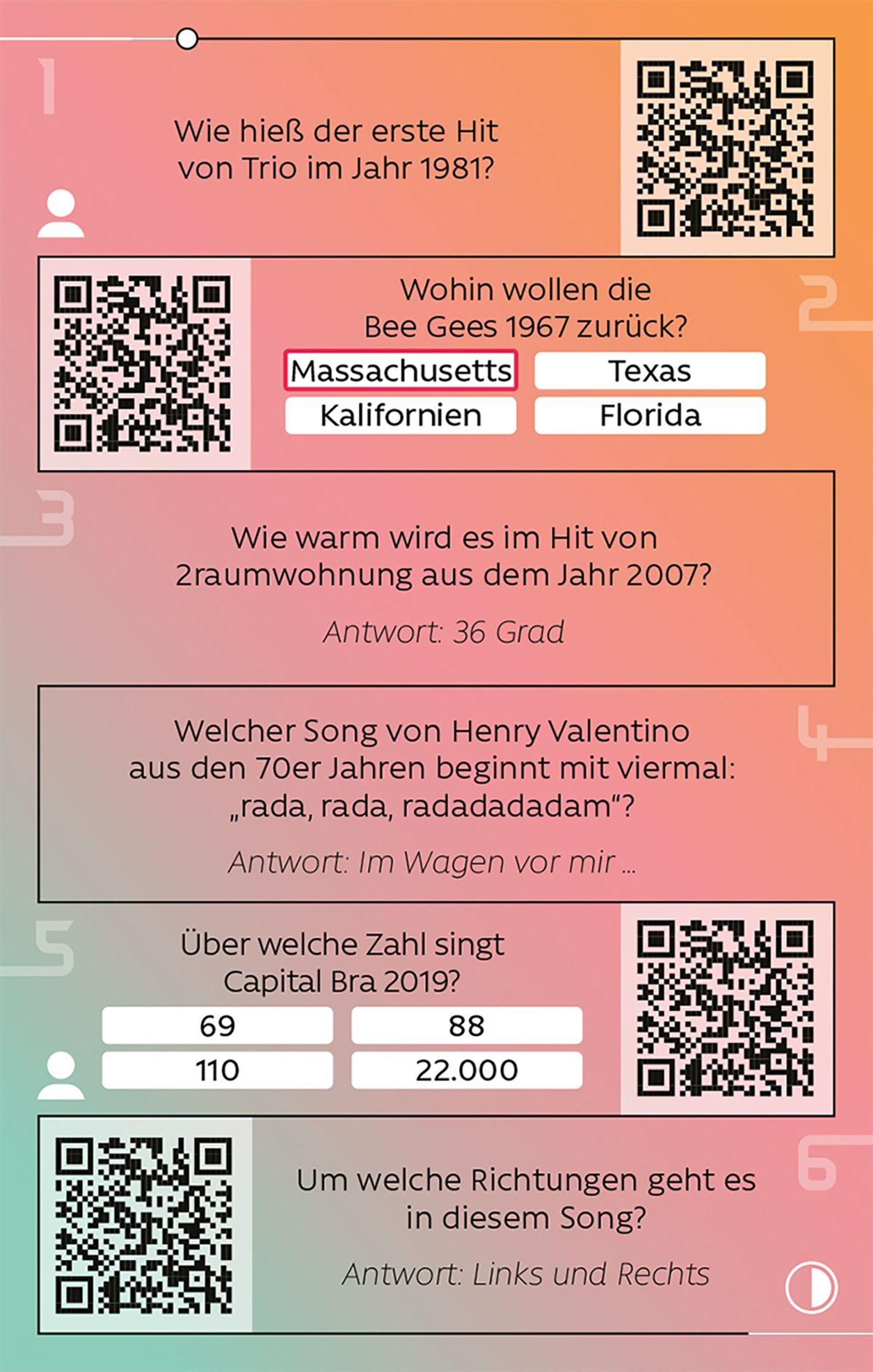 Eine Person zieht eine Fragenkarte und verteilt die Aufgaben an die Mitspielenden. Wer kennt sich mit den Beatles aus? Wer hört ständig Schlager? Wer erkennt den neuesten K-Pop-Song? Jede richtige Antwort bringt Punkte für den Quizmaster und denjenigen oder diejenige, die richtig geantwortet hat.