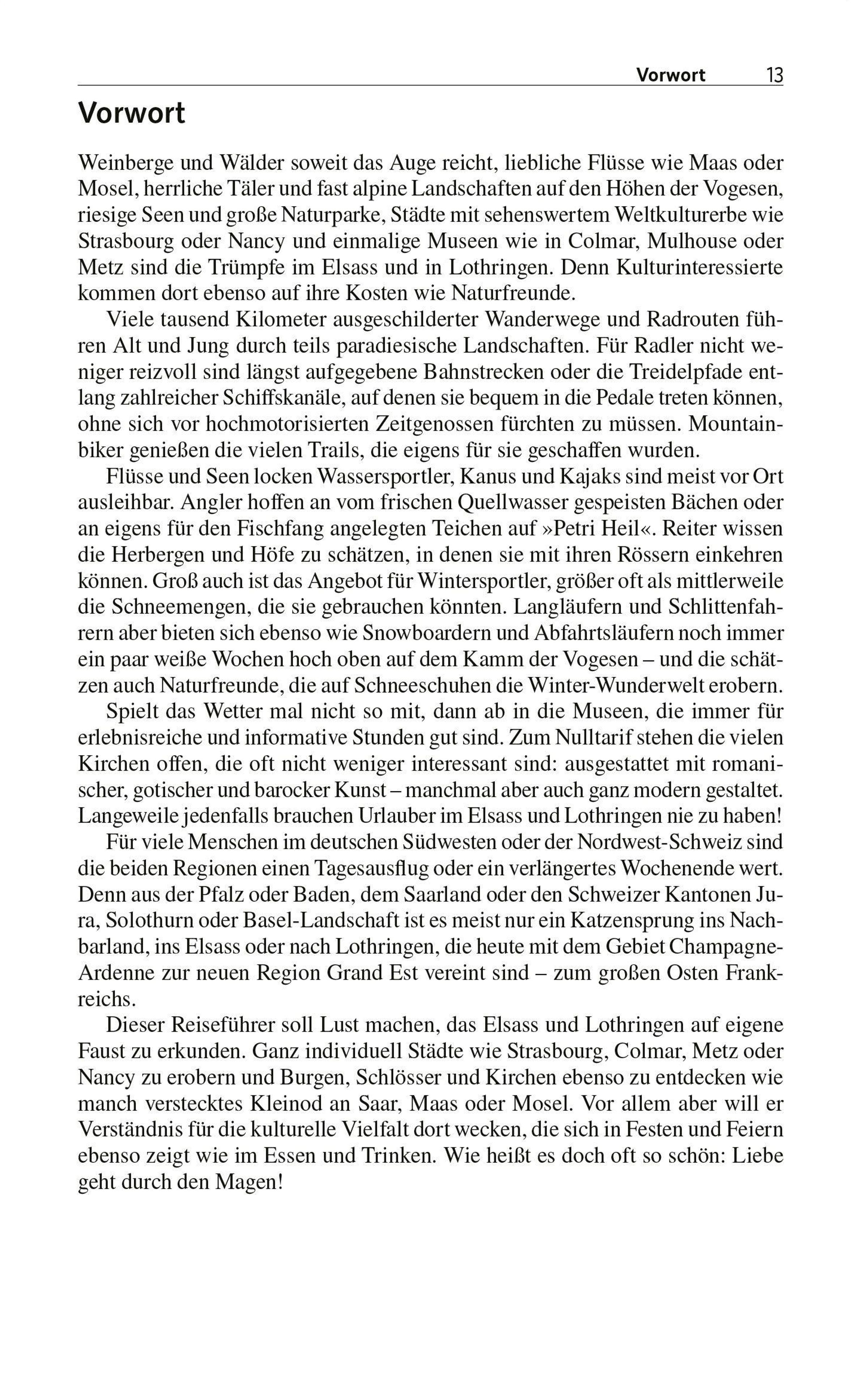 Im Elsass und in Lothringen gibt es sowohl für Natur- als auch für Kulturfreunde viel zu entdecken: Weinberge und Wälder, Flüsse und Seen, Städtchen wie aus dem Bilderbuch und Weltkulturerbestätten. Ausgiebige Besichtigungen lohnen sich vor allem in Nancy, Metz, Colmar oder Strasbourg. Viele tausend Kilometer Wanderwege und Radrouten führen durch traumhafte Landschaften mit sehenswerten Schlössern, Burgen und Kirchen. Wassersport und Reiten sind weitere beliebte Aktivitäten in der Region. Und nicht zuletzt sorgt die kulturelle und kulinarische Vielfalt für einen abwechslungsreichen Urlaub.