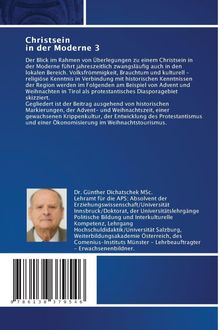 Der Blick im Rahmen von Überlegungen zu einem Christsein in der Moderne führt jahreszeitlich zwangsläufig auch in den lokalen Bereich. Volksfrömmigkeit, Brauchtum und kulturell - religiöse Kenntnis in Verbindung mit historischen Kenntnissen der Region werden im Folgenden am Beispiel von Advent und Weihnachten in Tirol als protestantisches Diasporagebiet skizziert. Gegliedert ist der Beitrag ausgehend von historischen Markierungen, der Advent- und Weihnachtszeit, einer gewachsenen Krippenkultur, der Entwicklung des Protestantismus und einer Ökonomisierung im Weihnachtstourismus.