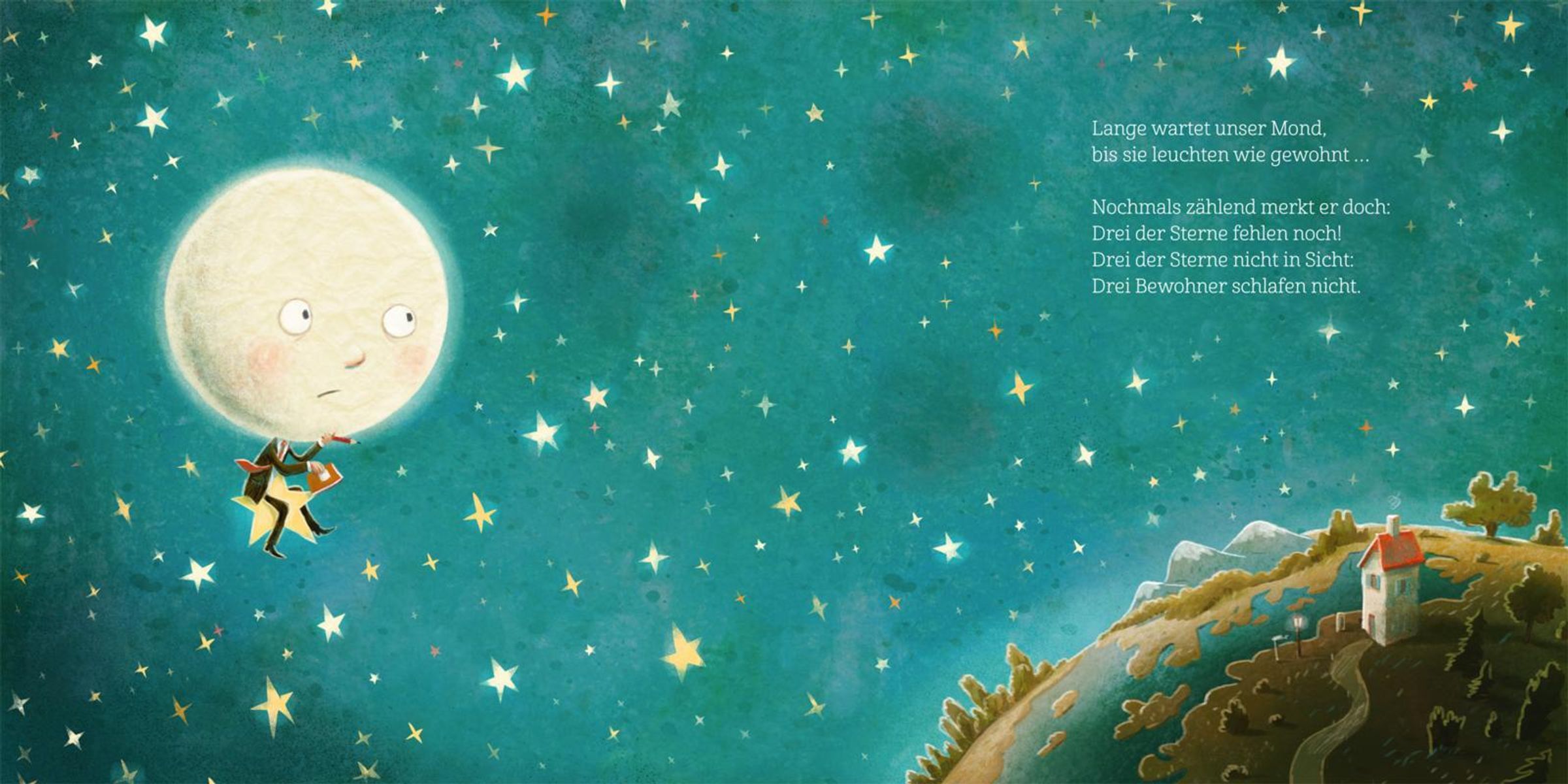 Jeden Abend zählt der Mond die Sterne. Denn für jedes Tierjunge und für jedes Menschenkind, das schläft, strahlt ein Stern am Himmelszelt. Doch heute fehlen drei Sterne. Wer ist noch nicht eingeschlummert? Hier begleiten Kinder den Mond bei seiner Suche nach den drei ruhelosen Tierkindern und erleben mit, wie er jedem auf eine andere Art beim Einschlafen hilft.