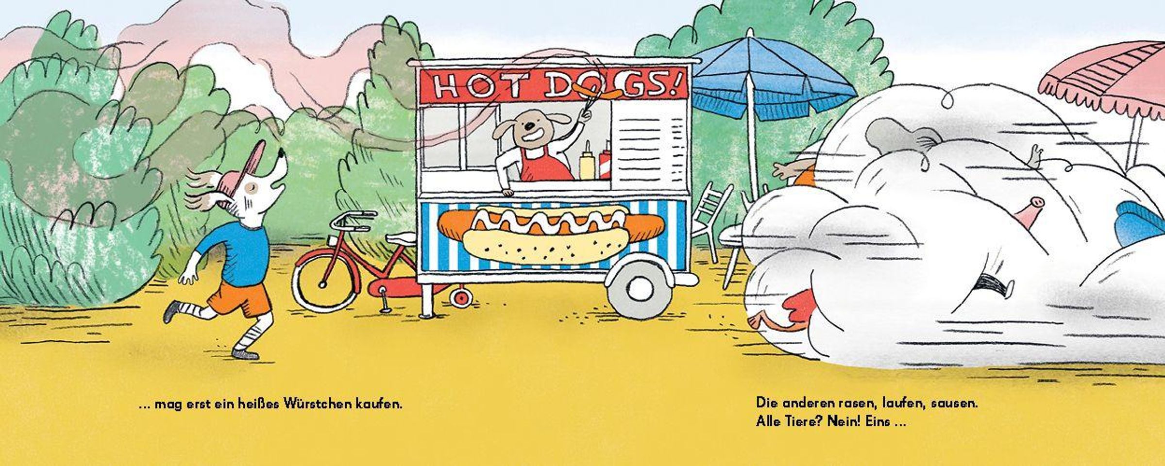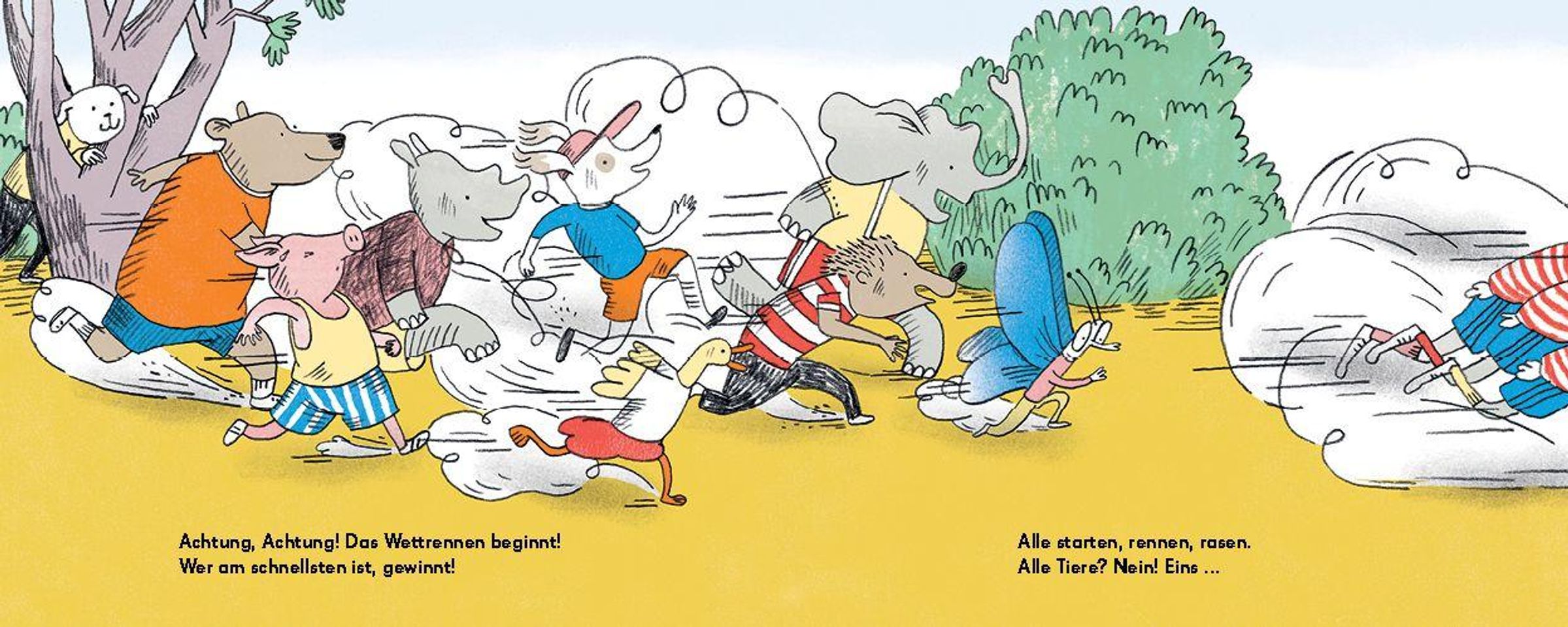Titel: "ALLE RENNEN, RASEN, SAUSEN!". Tiere in Sportkleidung stehen an einer Startlinie. Fröhliche Atmosphäre., Buch