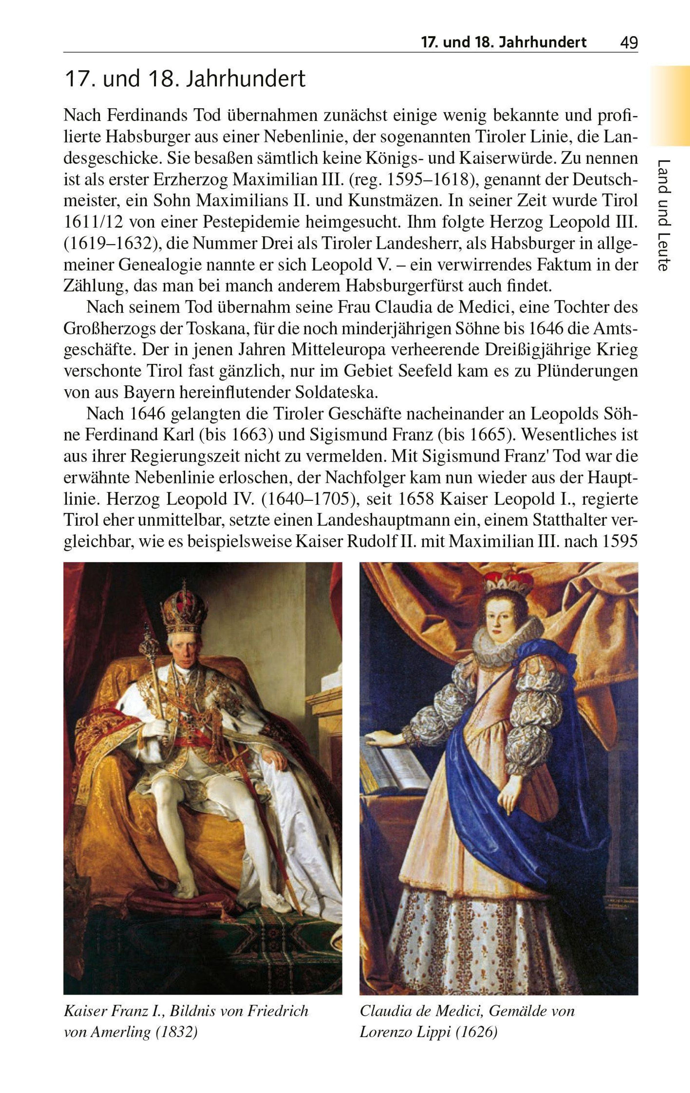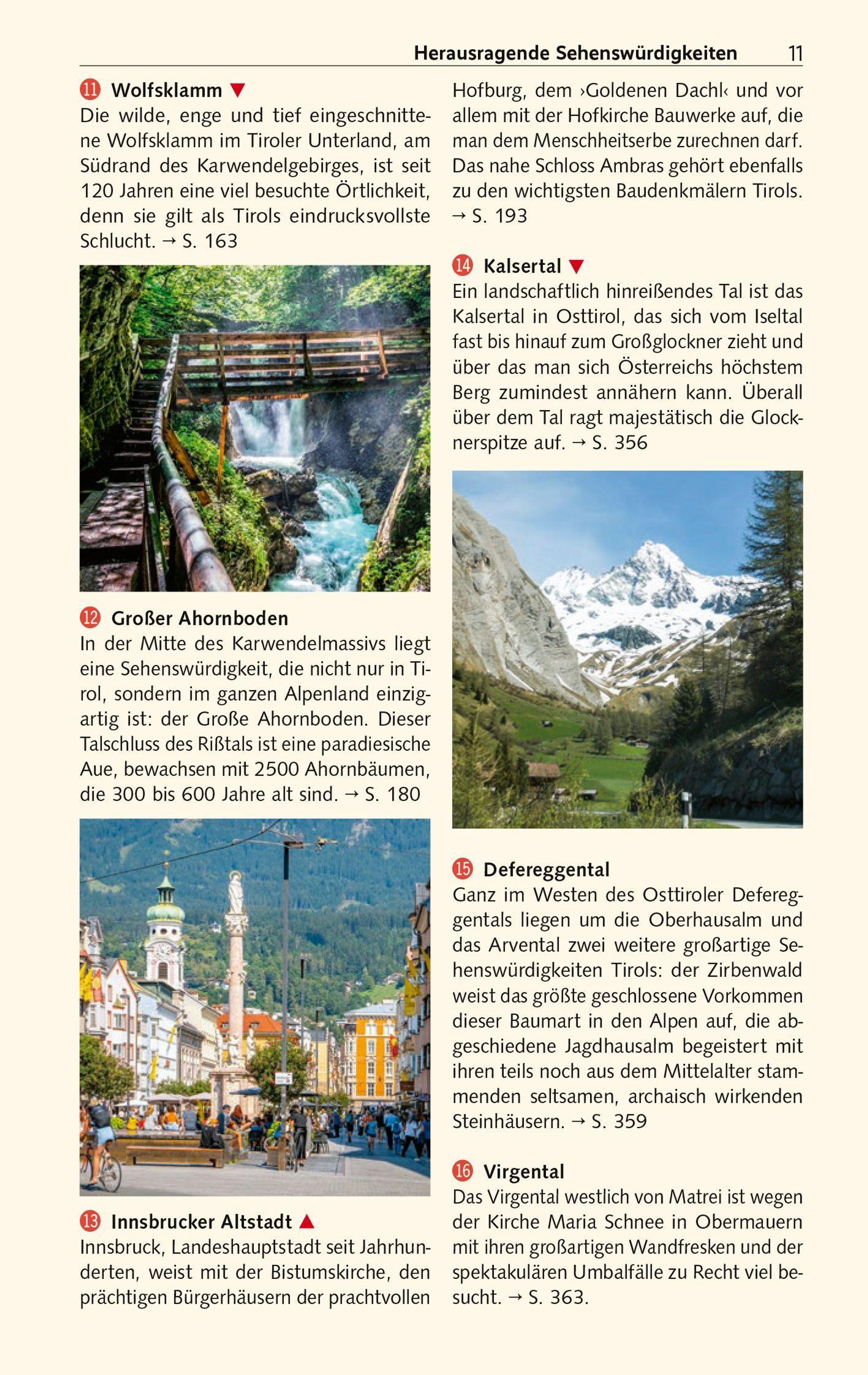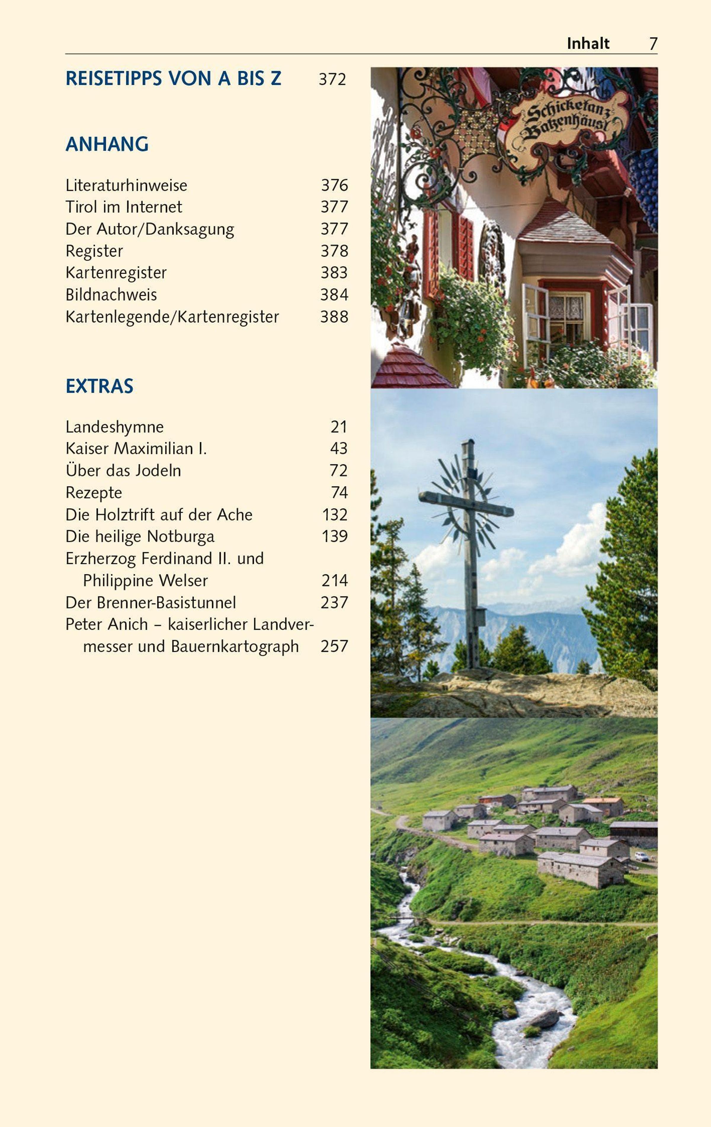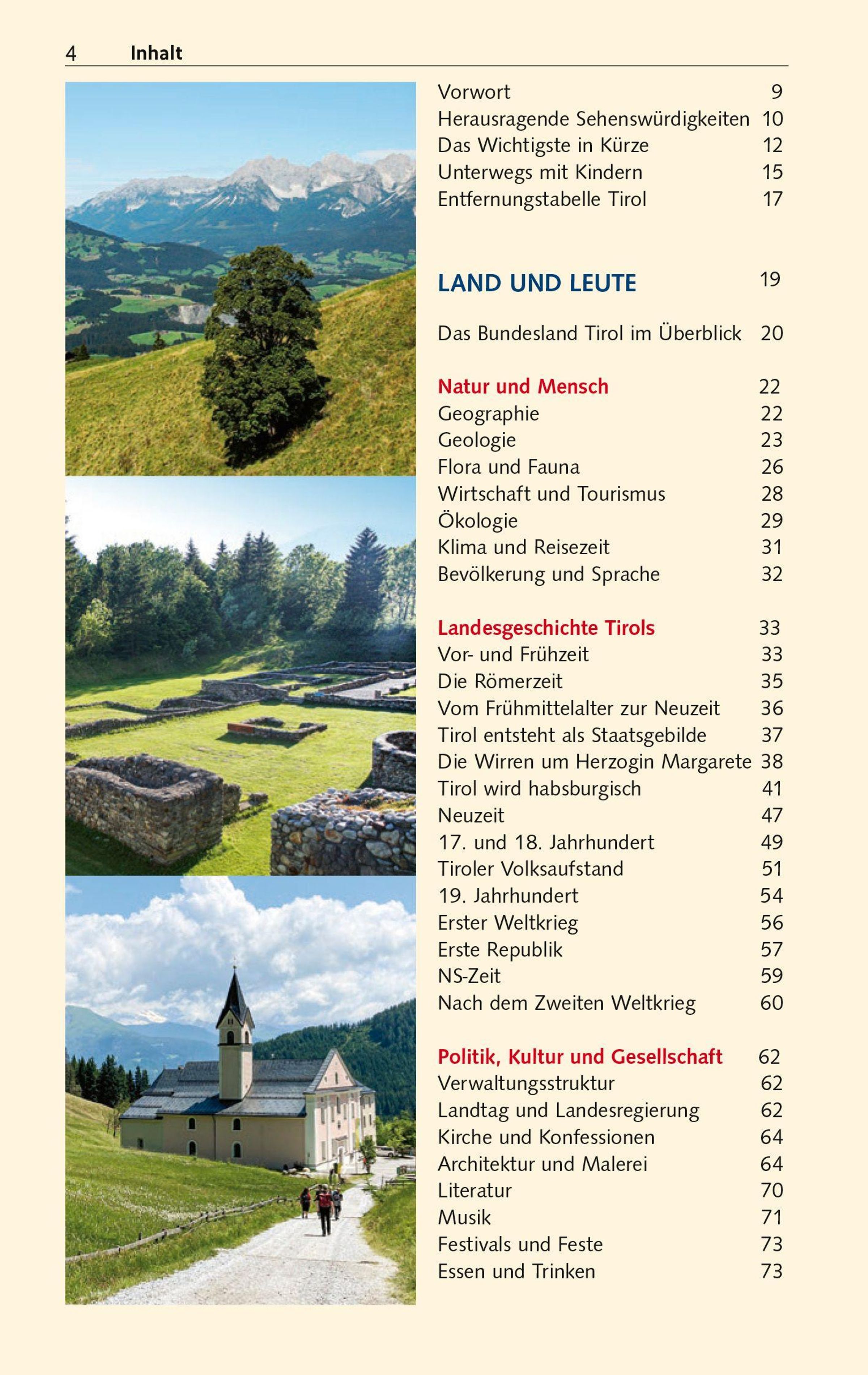 Pittoreske Kleinstädte wie Kufstein oder die alte Salz- und Münzstadt Hall zeugen von Tirols reicher Geschichte. Innsbruck vor den Zacken des Karwendelgebirges gleicht gar einem Gesamtkunstwerk. Mit der kaiserlichen Hofburg, dem Dom und der Hofkirche, zierreichen Bürgerhäusern und dem "Goldenen Dachl" als Wahrzeichen ist die Tiroler Landeshauptstadt einen ausgedehnten Aufenthalt wert. Ob Schloss Ambras, ob Museen, Klöster und Wallfahrtskirchen - der ganze Reichtum Tirols wird von Autor Gunnar Strunz differenziert und detailreich beschrieben. Der Reiseleiter und intime Kenner der Alpenrepublik würdigt die Herzlichkeit der Tiroler und ihre lebendigen Traditionen. Und auch die Köstlichkeiten aus Küche und Keller kommen bei ihm nicht zu kurz.