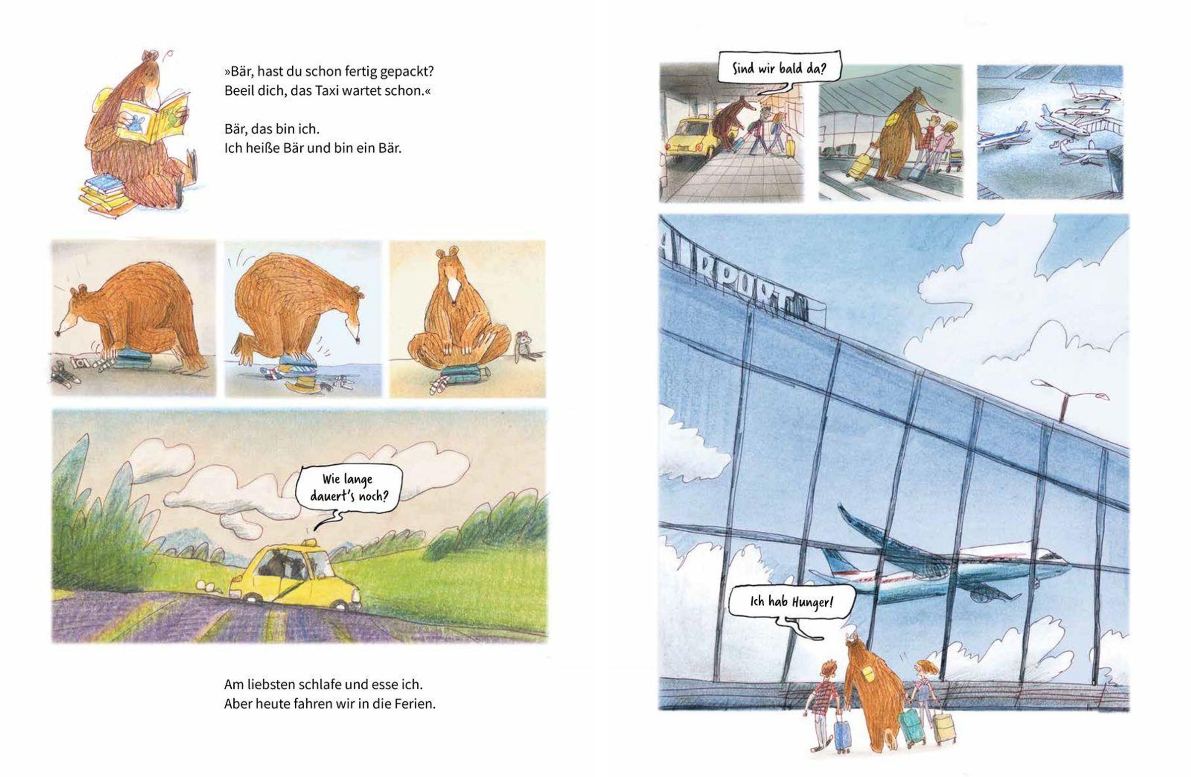 Bär will verreisen. Was passt alles in den Koffer? Wann geht es endlich los? Ui, der Flughafen ist ein großer Spielplatz und Rolltreppe fahren will gelernt sein. Bär staunt über so viele Menschen. Alle müssen ihre Pässe zeigen und sich bei der Sicherheitskontrolle kitzeln lassen. Aber warum dauert das so lange? Auch Bär muss geduldig in der langen Schlange stehen. Als sie endlich im Flugzeug sitzen, heißt es: bitte anschnallen. Aber Bär muss dringend aufs Klo!