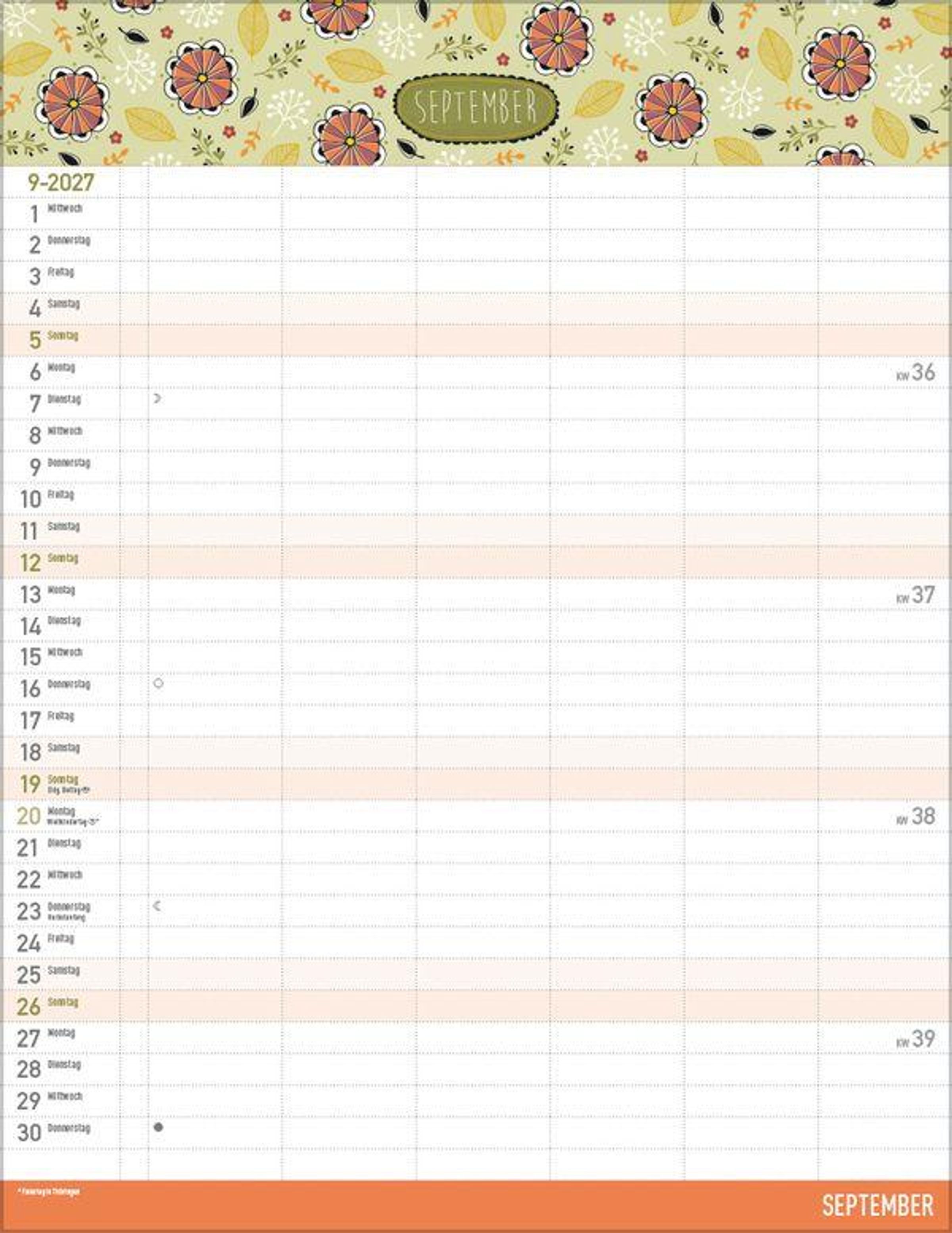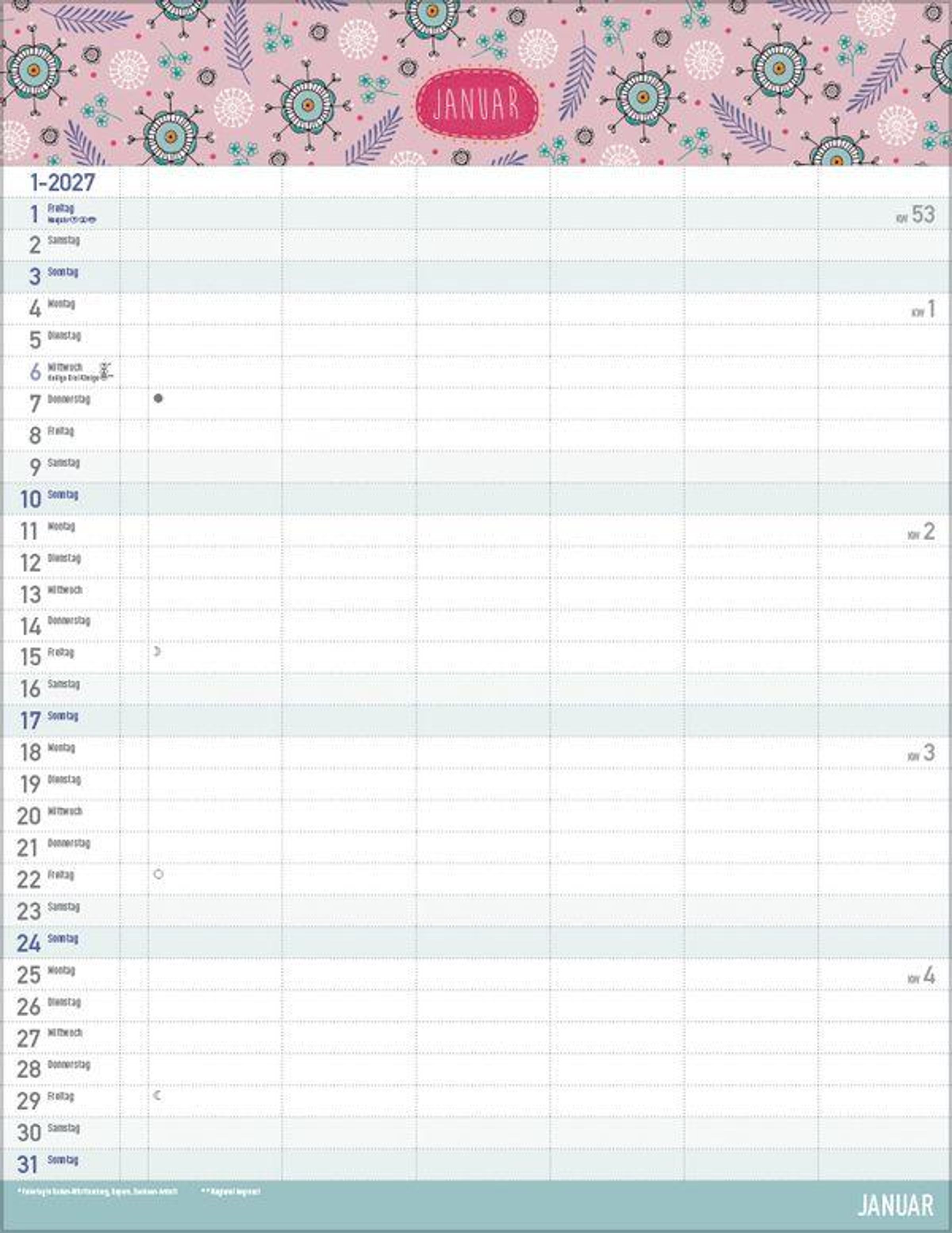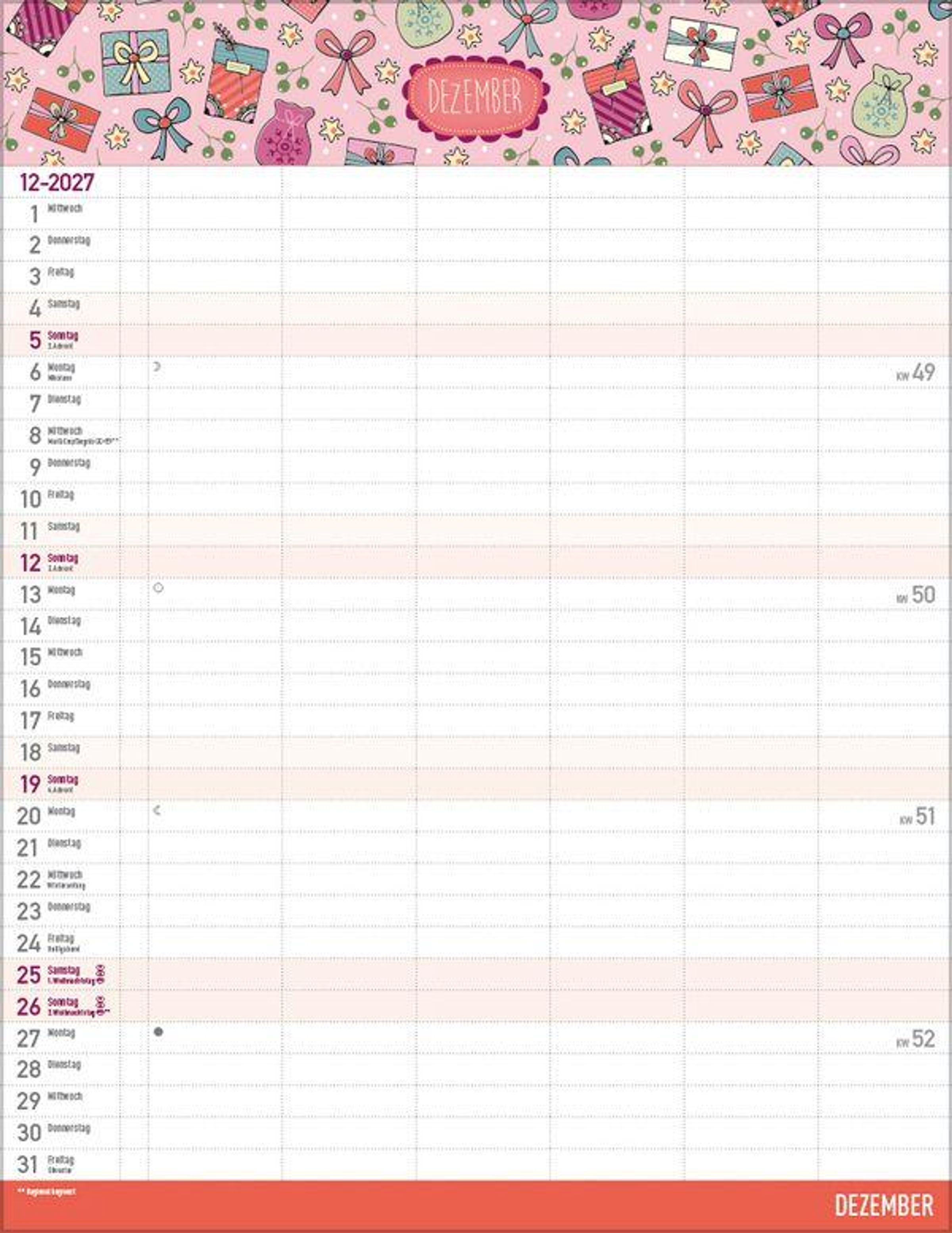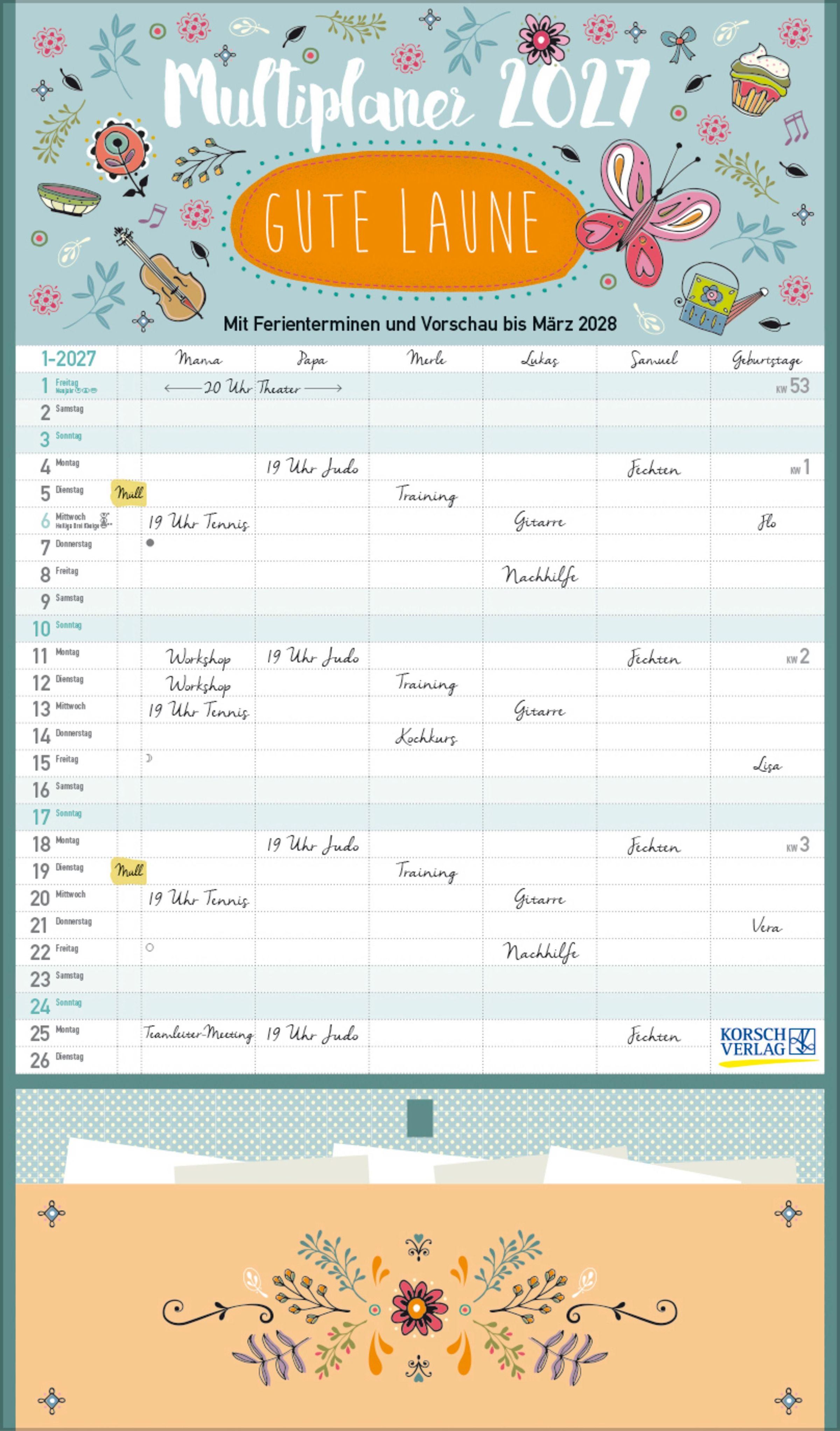 - Familientimer - 6 große Spalten mit viel Platz. Hochwertiger Familienkalender mit Zettelfach und Vorschau bis März 2027. 27 x 46 cm.