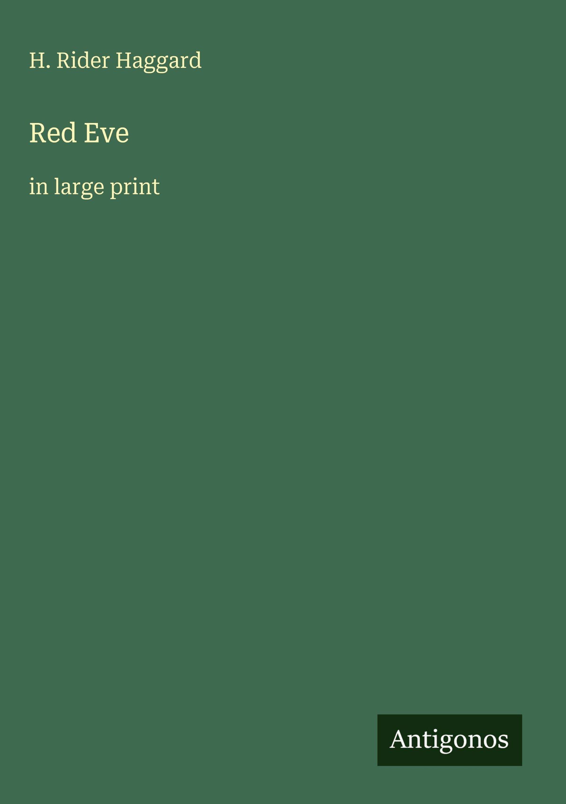 Text: "H. Rider Haggard, Red Eve, in large print, Antigonos." Einfache grüne Buchhülle ohne Bilder., Buch