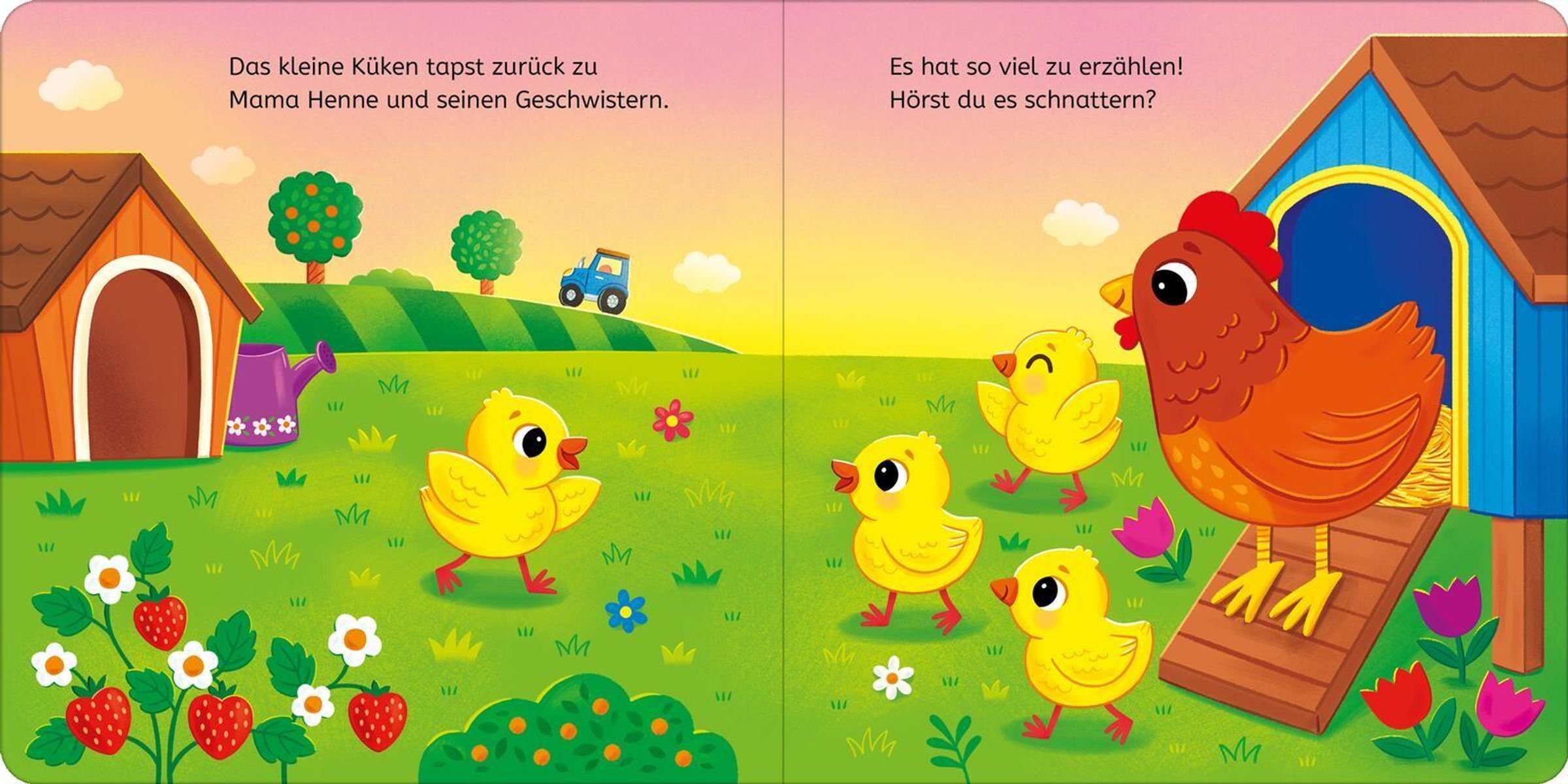 Nanu, wer ist denn da so früh aufgewacht? Es ist das kleine Küken, das sich neugierig aufmacht, um all seine tierischen Freunden auf dem Bauernhof zu begrüßen. Bei den Schweinen lässt es sich so schön im Matsch spielen und mit den Schafen kann man um die Wette laufen. Aber am schönsten ist es bei Mama Henne und den Geschwistern!