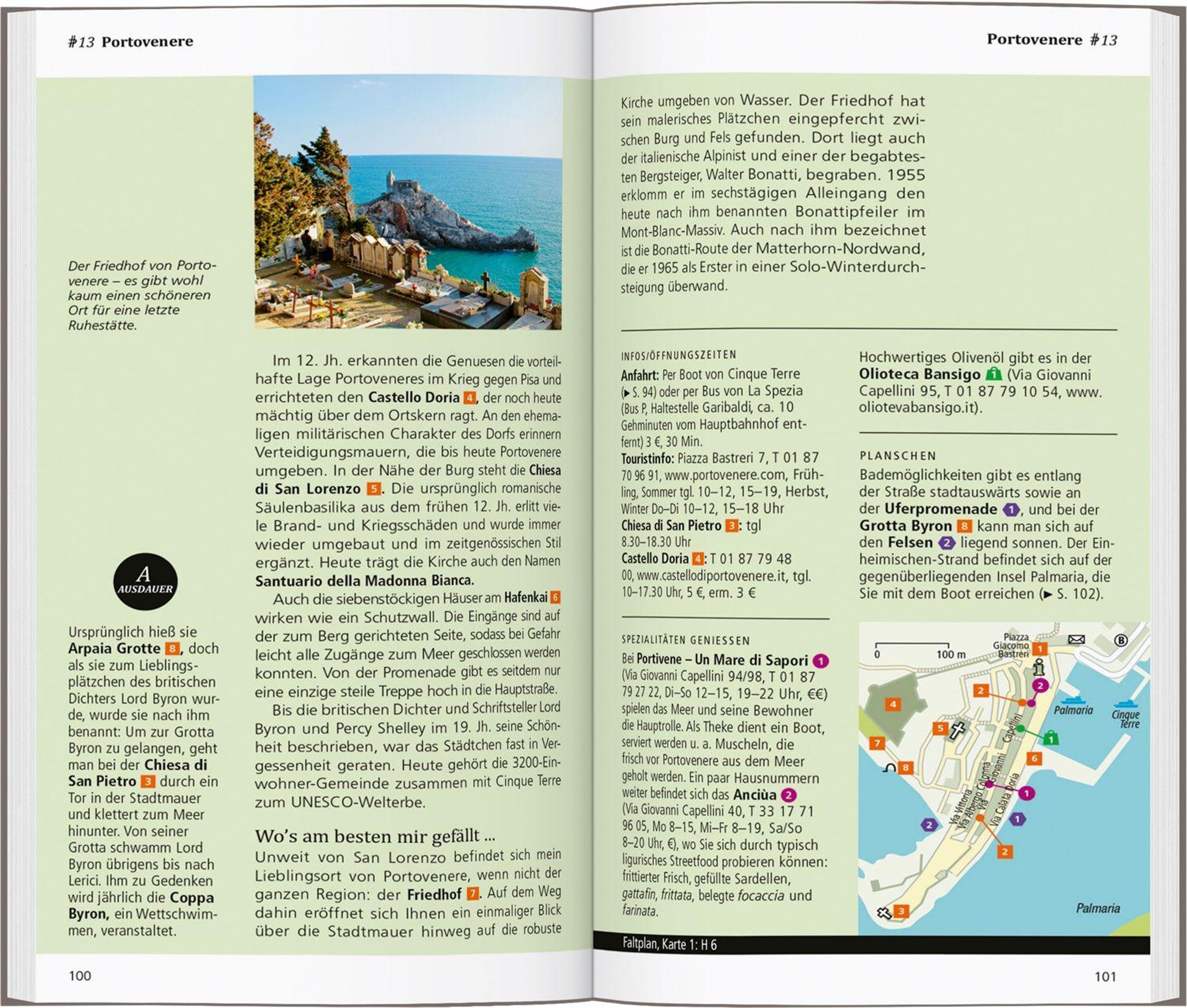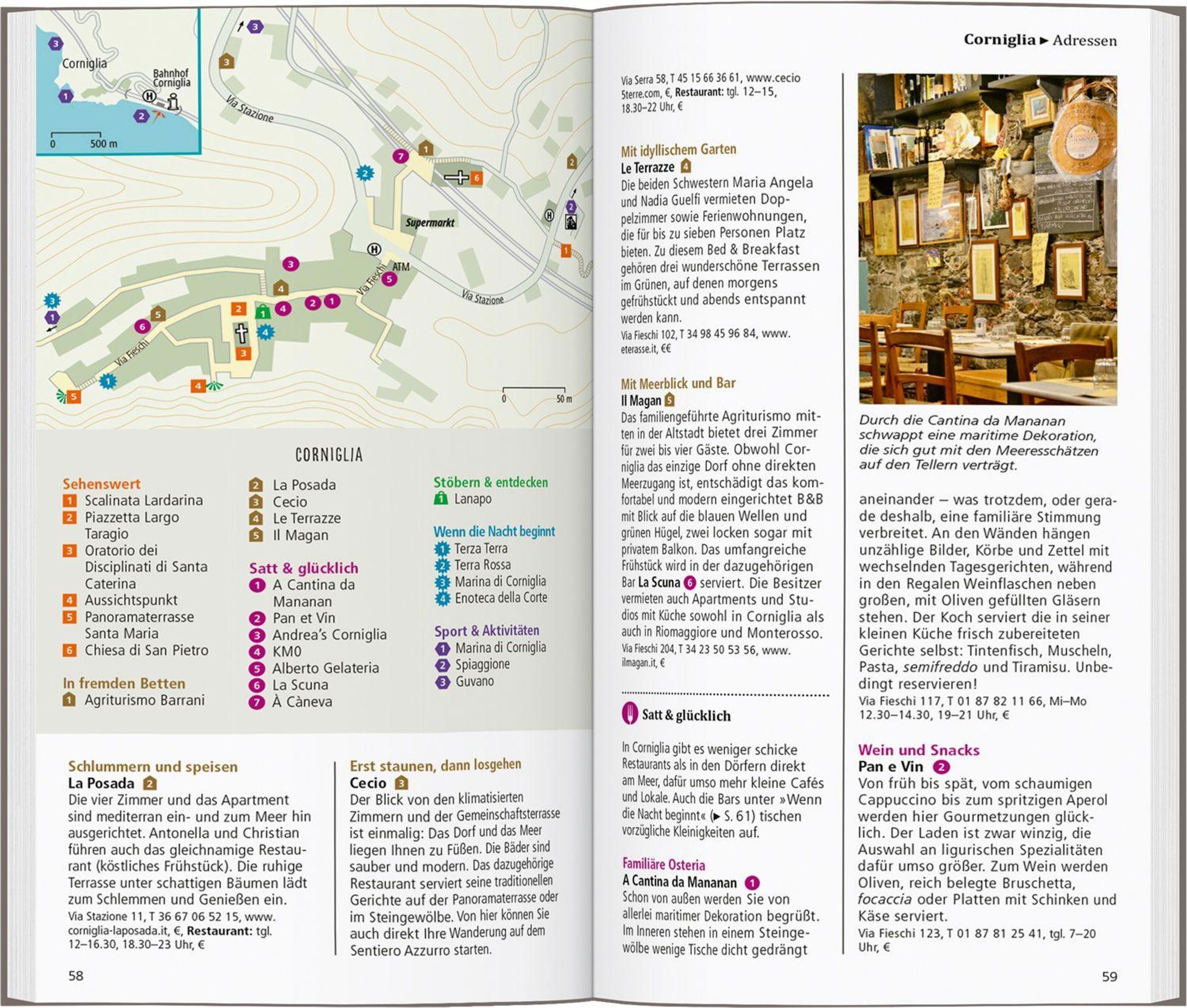 Dank vieler Tipps und Adressen erfahren Sie, wo es sich in fremden Betten gut schläft, wo Sie glücklich satt werden, wohin die Menschen in Cinque Terre zum Stöbern und Entdecken gehen und wohin es sie zieht, wenn die Nacht beginnt.