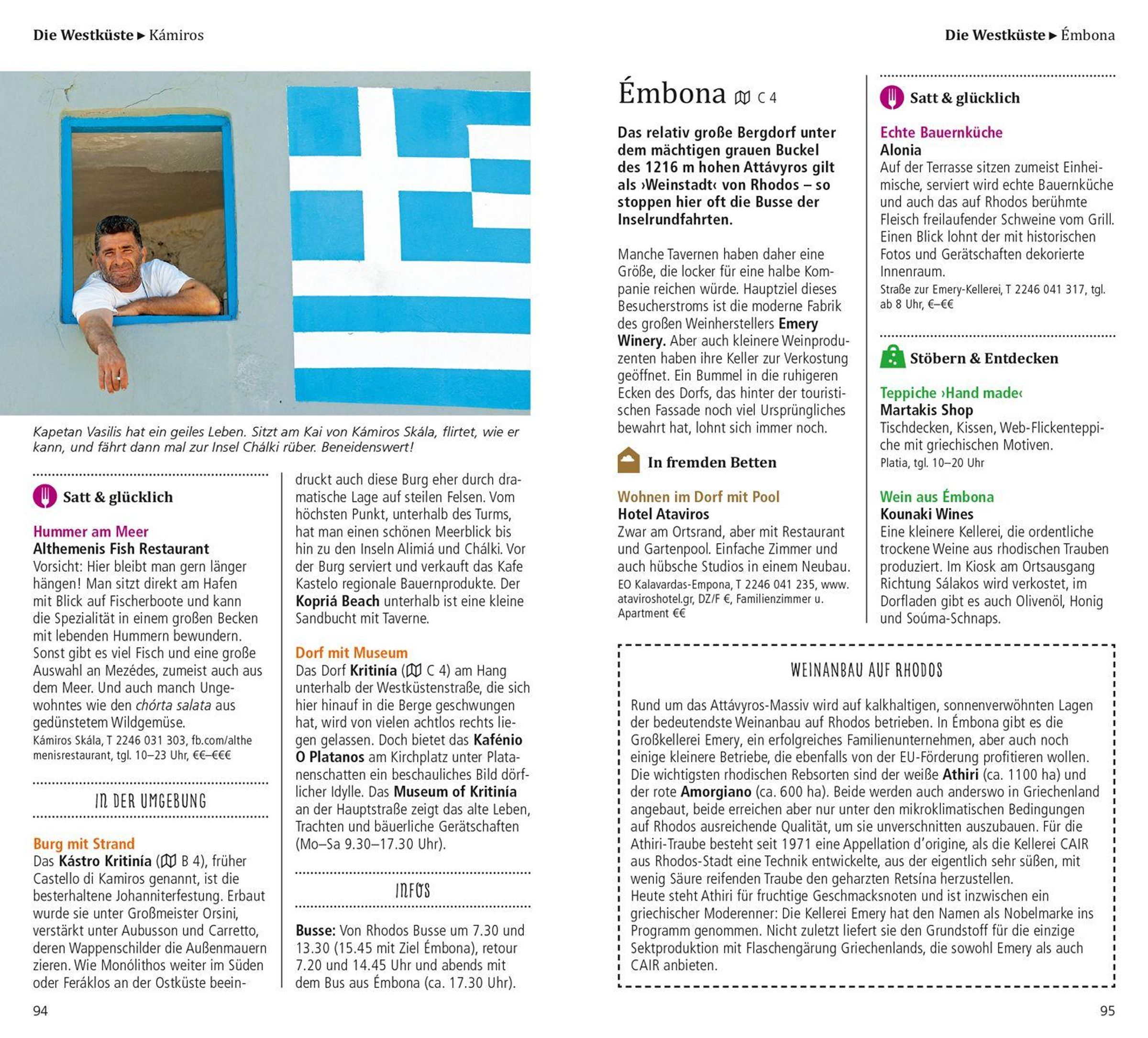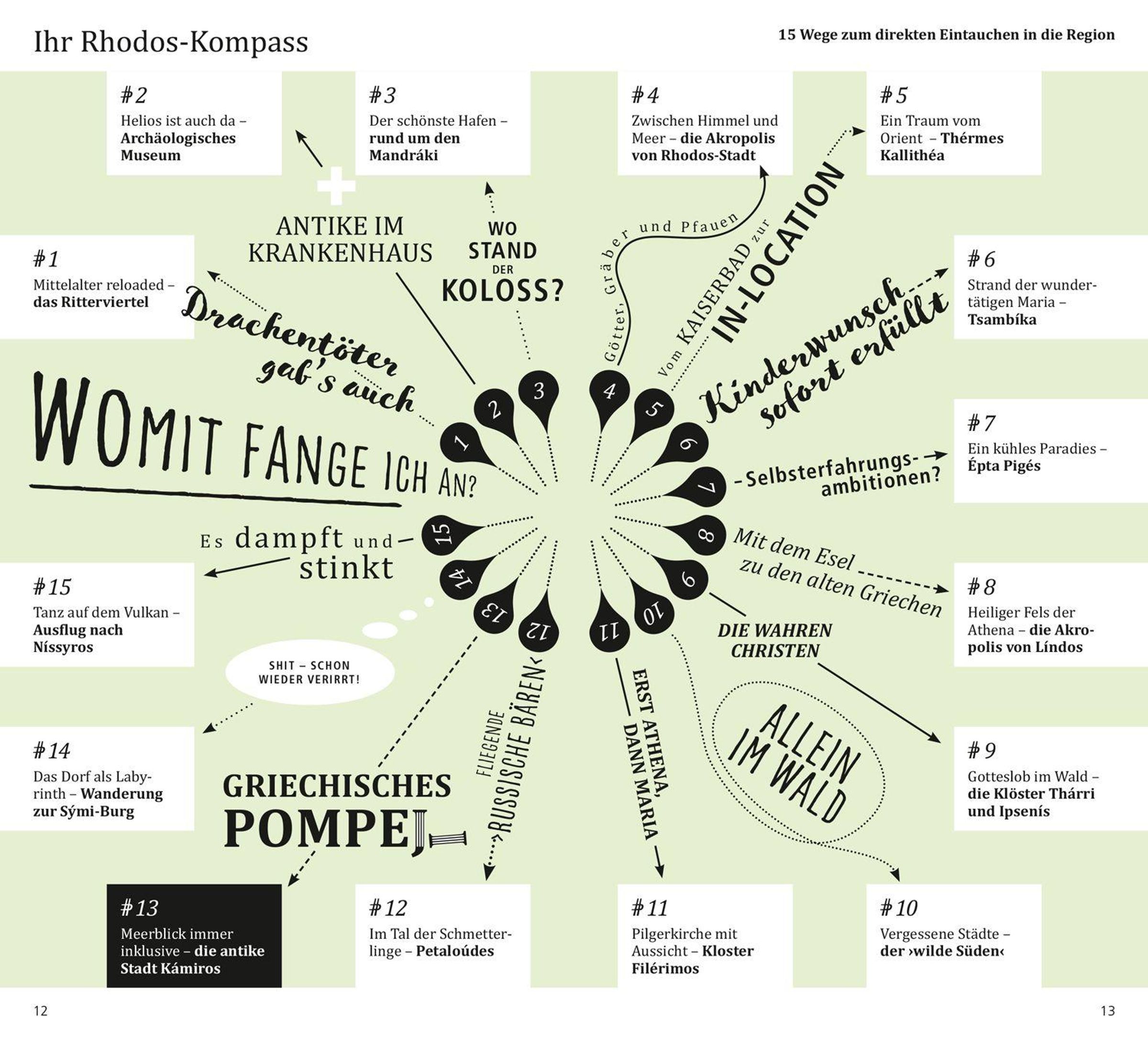 Das griechische Lebensmotto 'sigá-sigá', immer mit der Ruhe, prägt auch das Leben auf Rhodos. Mit den 15 'Direkt-Kapiteln' des Reiseführers von Hans E. Latzke können Sie sich zwanglos unter die Rhodier mischen, direkt in das Lebensgefühl in der griechischen Ägäis eintauchen, aktiv in der Natur entspannen und die Highlights kennenlernen: das Ritterviertel von Rhodos-Stadt und die Akropolis von Líndos, die Thermen von Kallithéa und den Urlaubsort Faliráki, alte Klöster und stille Dörfer, das Schmetterlingstal, feine Sandstrände und urige Fischertavernen. Dank vieler Tipps und Adressen erfahren Sie, wo es sich in fremden Betten gut schläft, wo Sie glücklich satt werden, wohin die Menschen auf Rhodos zum Stöbern und Entdecken gehen und wohin es sie zieht, wenn die Nacht beginnt. Mit den Übersichtskarten, genauen Stadtplänen und dem separaten großen Faltplan können Sie nach Lust und Laune Rhodos erkunden.