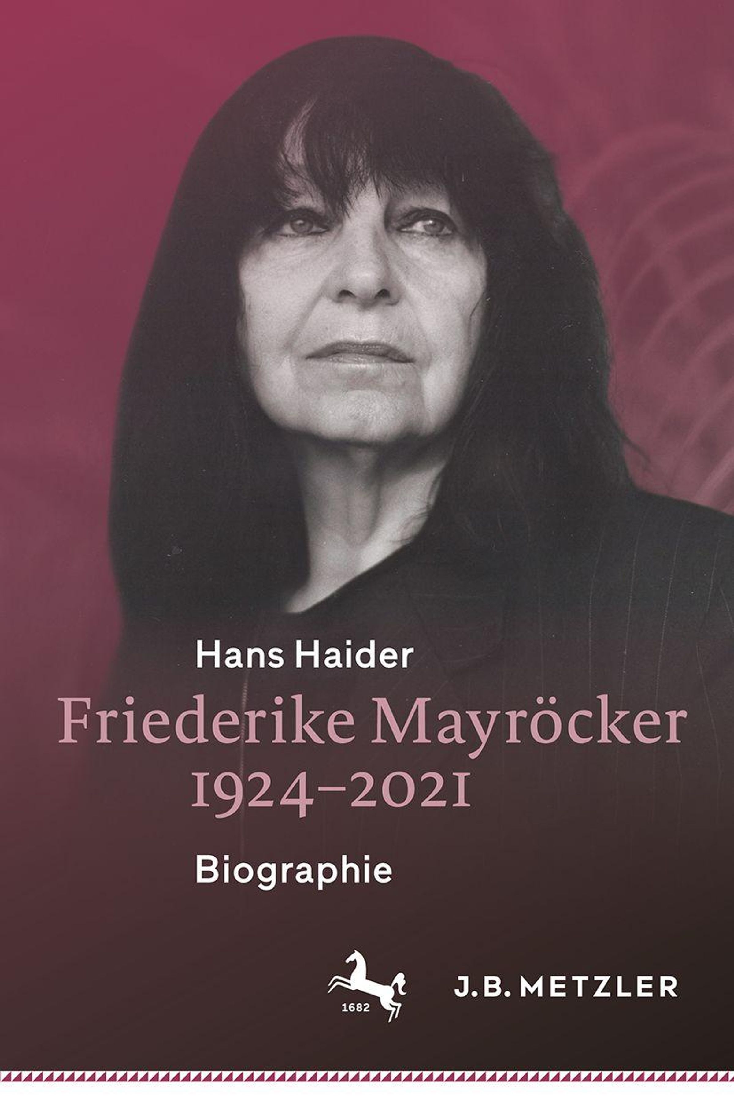 Titel: Hans Haider. Friederike Mayröcker 1924-2021. Biographie. Ein Schwarz-Weiß-Foto einer Frau vor rotem Hintergrund., Buch