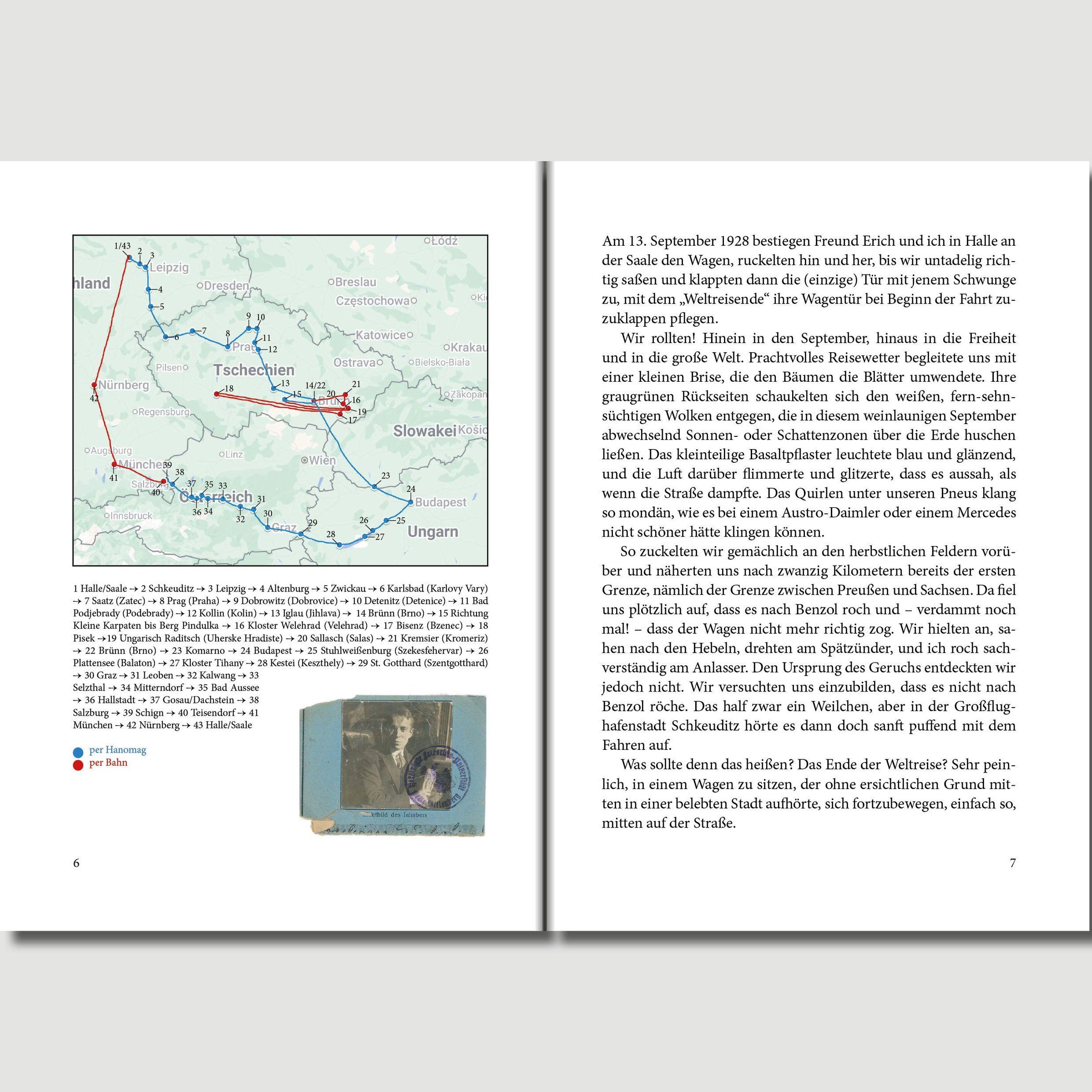 Mit viel Mut, wenig Geld und einem gebraucht erworbenen, notdürftig reparierten Hanomag Typ 2 / 10 gingen mein Vater und sein Studienfreund 1928 auf "Weltreise". Weder der Jurastudent noch der angehende Agrarwissenschaftler hatten viel Fahrpraxis. Dennoch starteten sie mit dem in Hannover-Linden gebauten kleinen Hanomag, liebevoll "Kommissbrot" genannt, von Halle / Saale aus dieses Wagnis. Schwierige Straßenverhältnisse, Pannen, mühsame Ersatzteilbeschaffung und Beinah-Unfälle waren häufige Begleiter auf ihrer Fahrt. Dank einiger Empfehlungsschreiben der Universität wurde den beiden "Weltreisenden" in den fremden Ländern manche Tür geöffnet. So trat der Ernstfall auch nie ein, mangels eines Bettes unter dem Auto nächtigen zu müssen. Dafür gab es genügend andere Abenteuer, vergnügliche und unangenehme, und nicht zuletzt auch einige amouröse. Leider nahm die Reise nach knapp fünf Wochen ein jähes Ende. Das treue Kommissbrot hat Halle nie wiedergesehen.