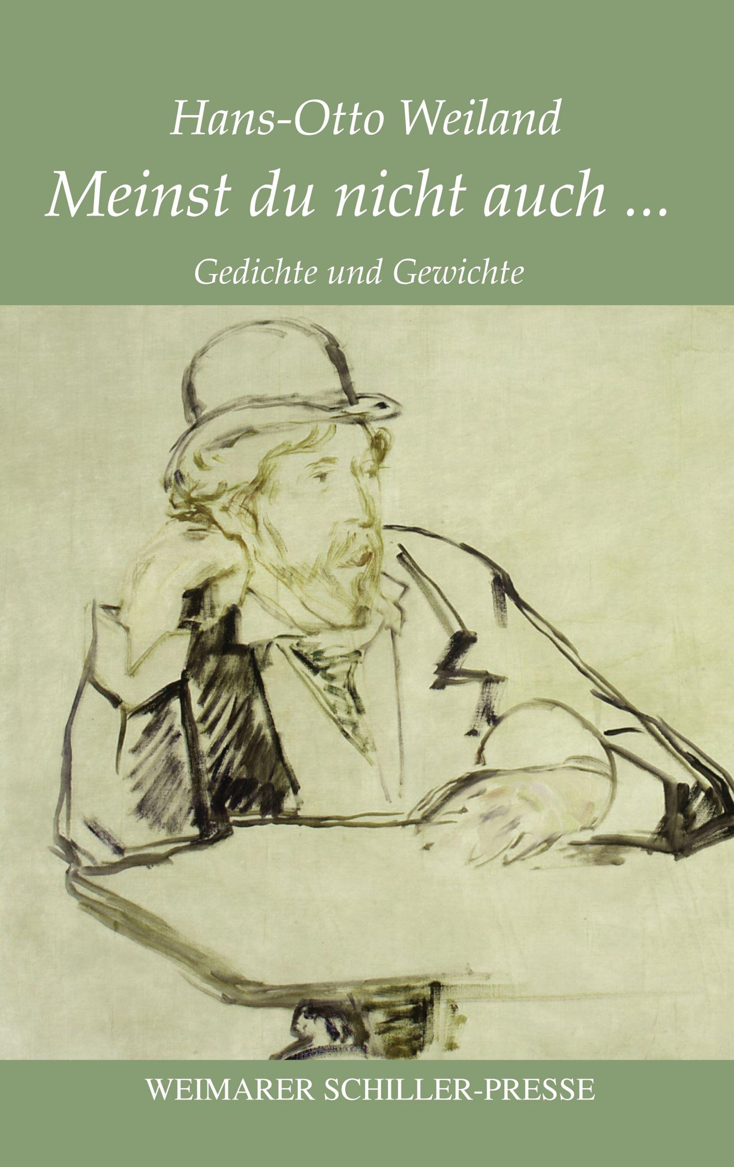 Titel: "Meinst du nicht auch ..." von Hans-Otto Weiland. Skizze eines Mannes mit Hut, gedankenverloren an einem Tisch sitzend., Buch