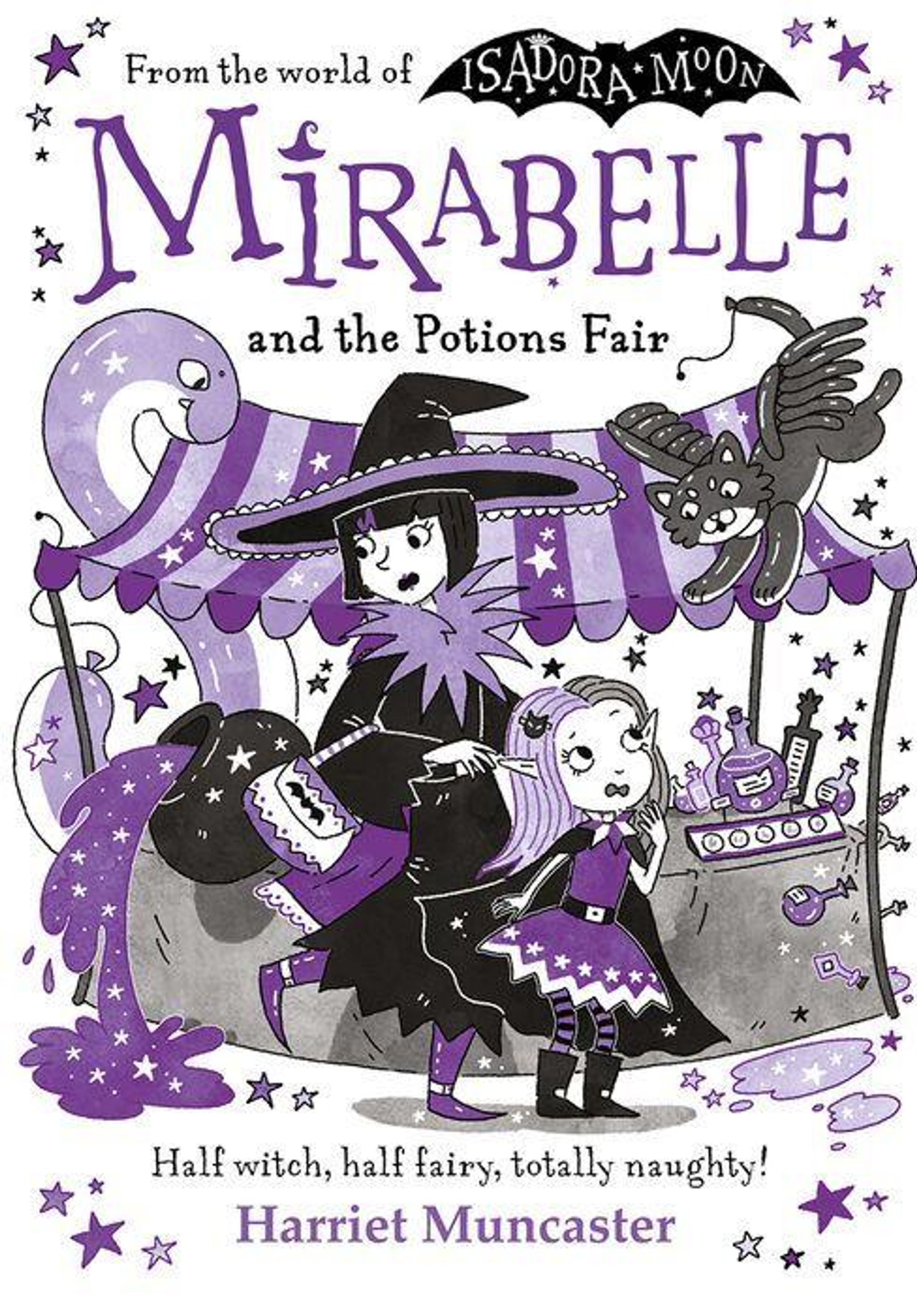 „Mirabelle and the Potions Fair“: Illustration zweier Mädchen, eins in Hexenkostüm, umgeben von Zaubertränken und Sternen., Buch