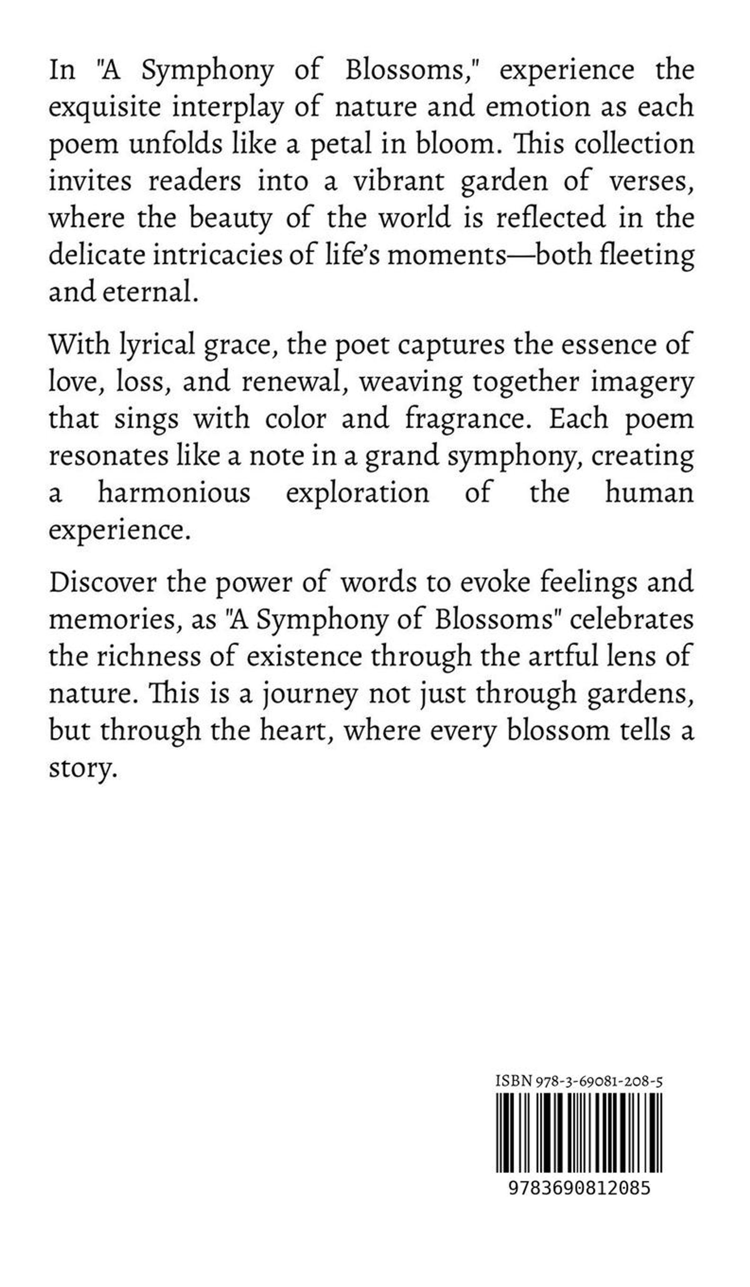 In "A Symphony of Blossoms," experience the exquisite interplay of nature and emotion as each poem unfolds like a petal in bloom. This collection invites readers into a vibrant garden of verses, where the beauty of the world is reflected in the delicate intricacies of life's moments-both fleeting and eternal. With lyrical grace, the poet captures the essence of love, loss, and renewal, weaving together imagery that sings with color and fragrance. Each poem resonates like a note in a grand symphony, creating a harmonious exploration of the human experience. Discover the power of words to evoke feelings and memories, as "A Symphony of Blossoms" celebrates the richness of existence through the artful lens of nature. This is a journey not just through gardens, but through the heart, where every blossom tells a story.
