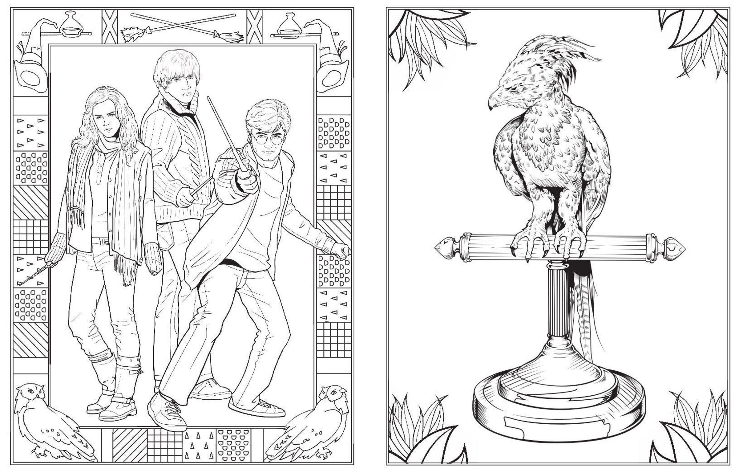 - Schwarz-weiß Illustrationen zum Ausmalen sowie farbige Szenenfotos und Konzeptentwürfe aus den Harry Potter-Filmen