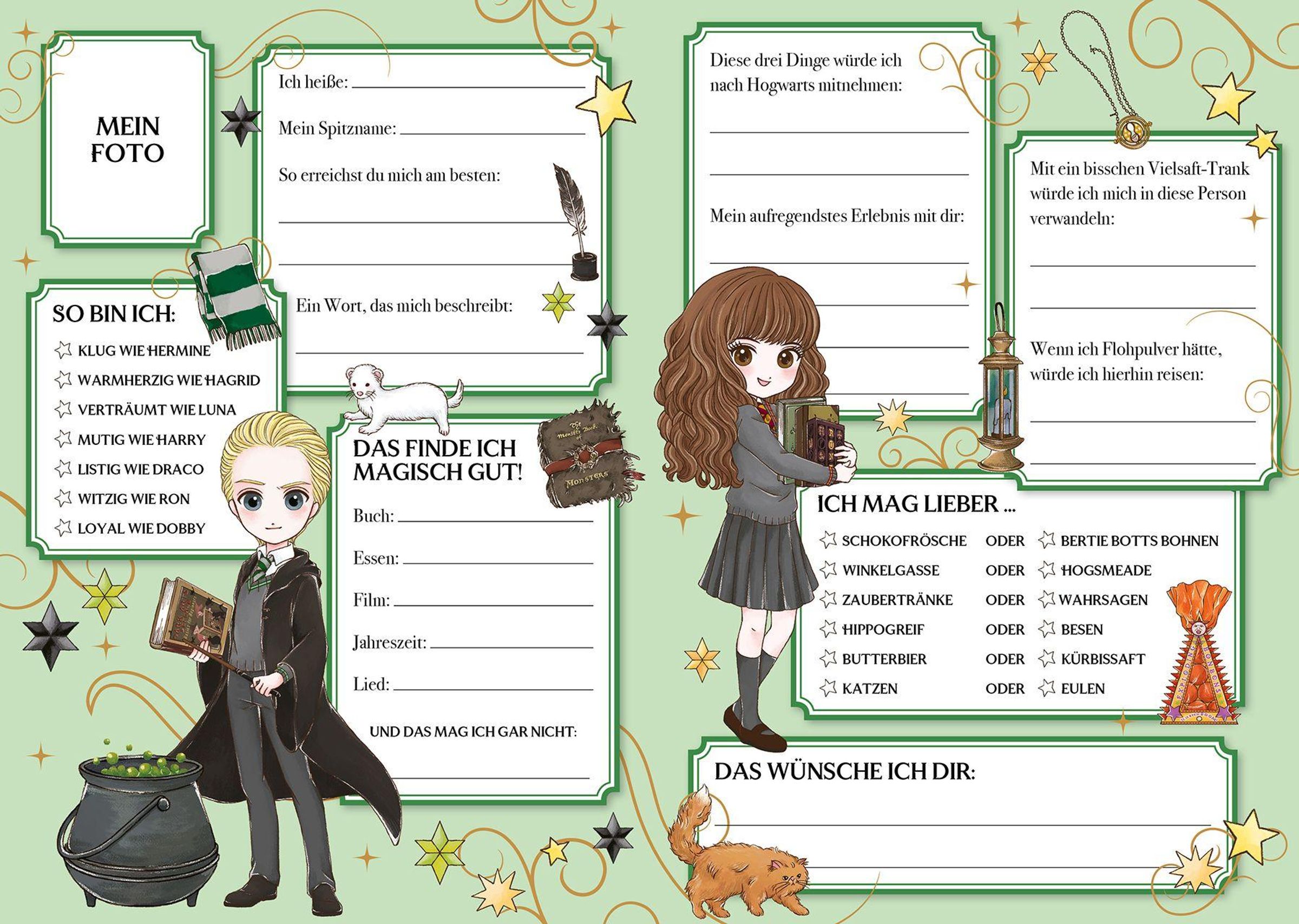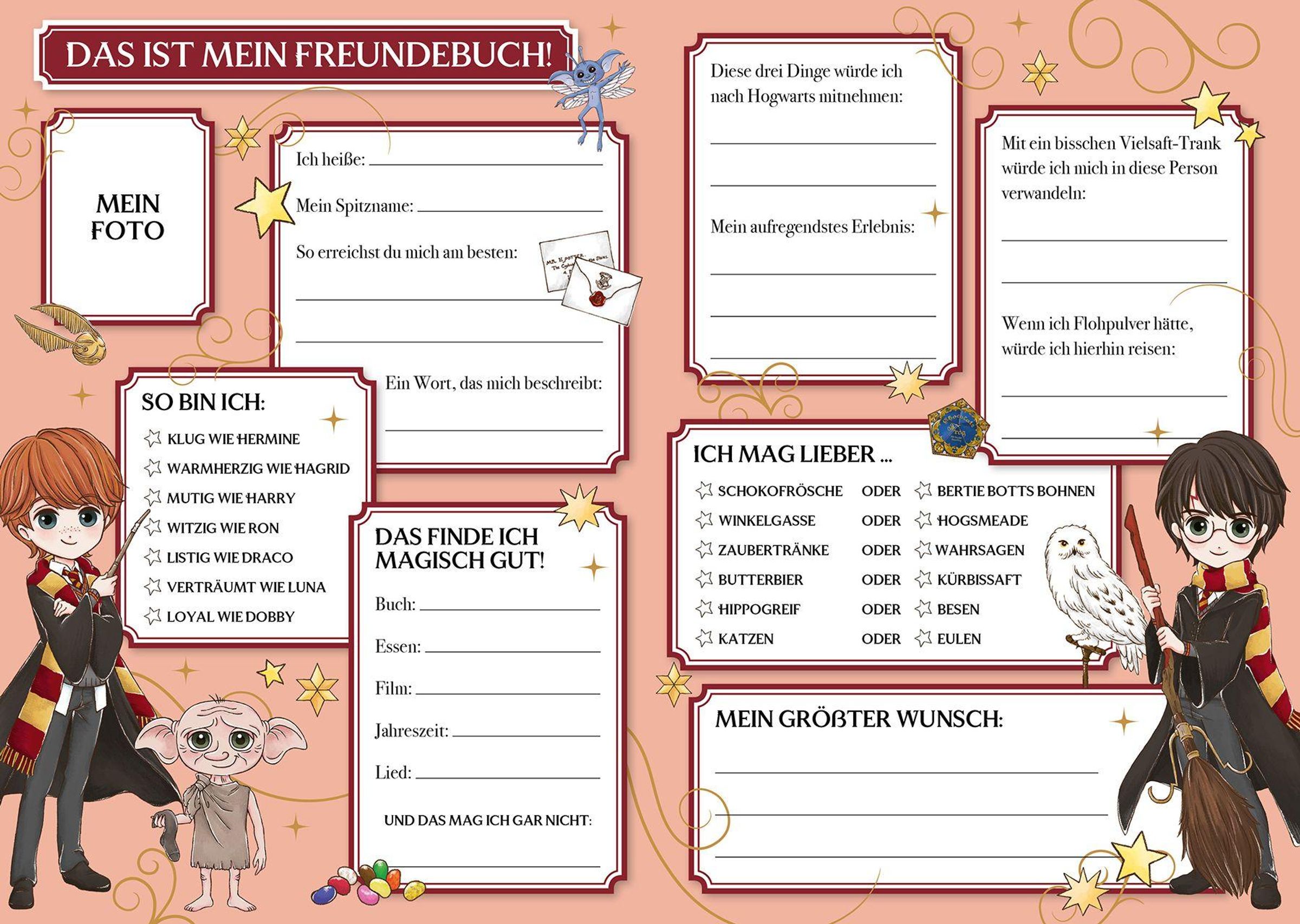 Freundschaft ist einfach magisch! Und Harry, Ron und Hermine wissen genau, wie wertvoll treue Begleiter sind. In diesem besonderen Erinnerungsalbum kannst du deine besten Freunde noch mal ganz neu kennenlernen: Welche drei Dingen würden sie nach Hogwarts mitnehmen? Welchen Film finden sie magisch gut? Und in wen würden sie sich mit ein wenig Vielsaft-Trank verwandeln? Außerdem gibt es spannende Fakten aus der Zauberwelt und unterhaltsame Tests zu entdecken. Das perfekte Buch für alle Hexen und Zauberer, die ihre Freundschaften auf besondere Weise feiern möchten.