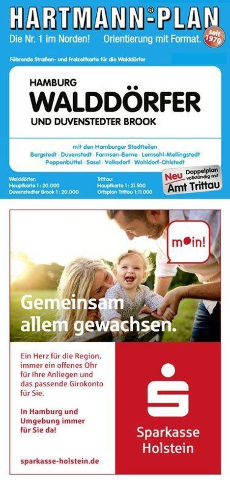 Die führende Straßenkarte und Freizeitkarte für die Walddörfer mit ausgewiesenen Wanderwegen und dem kompletten Duvenstedter Brook. Hauptkarte und Duvenstedter Brook 1: 20.000. Als Doppelplan erstmals auf der Rückseite vollständig mit dem Amt Trittau.