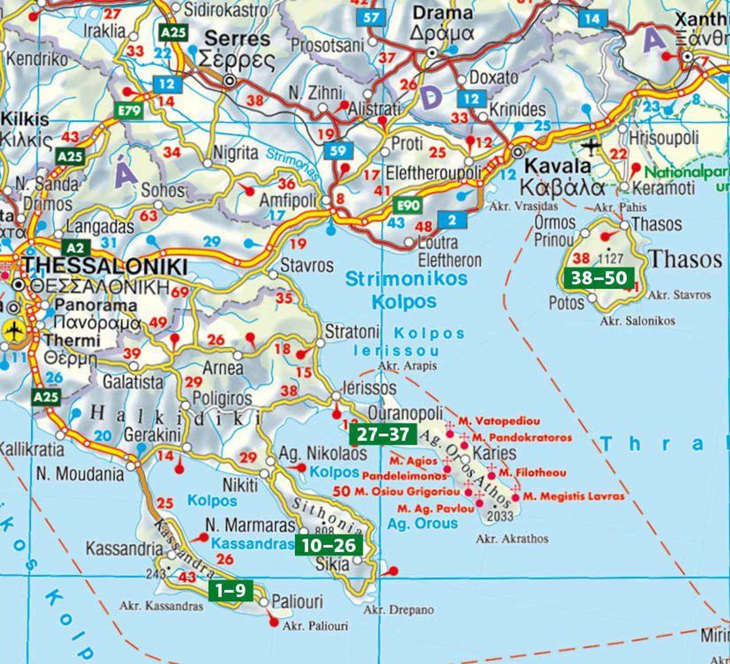 - 47 sorgfältig ausgewählte Wanderungen: Abwechslungsreiches Wandern auf Chalkidiki und Thassos - von entspannten Küstenwegen bis zu alpinen Bergtouren.