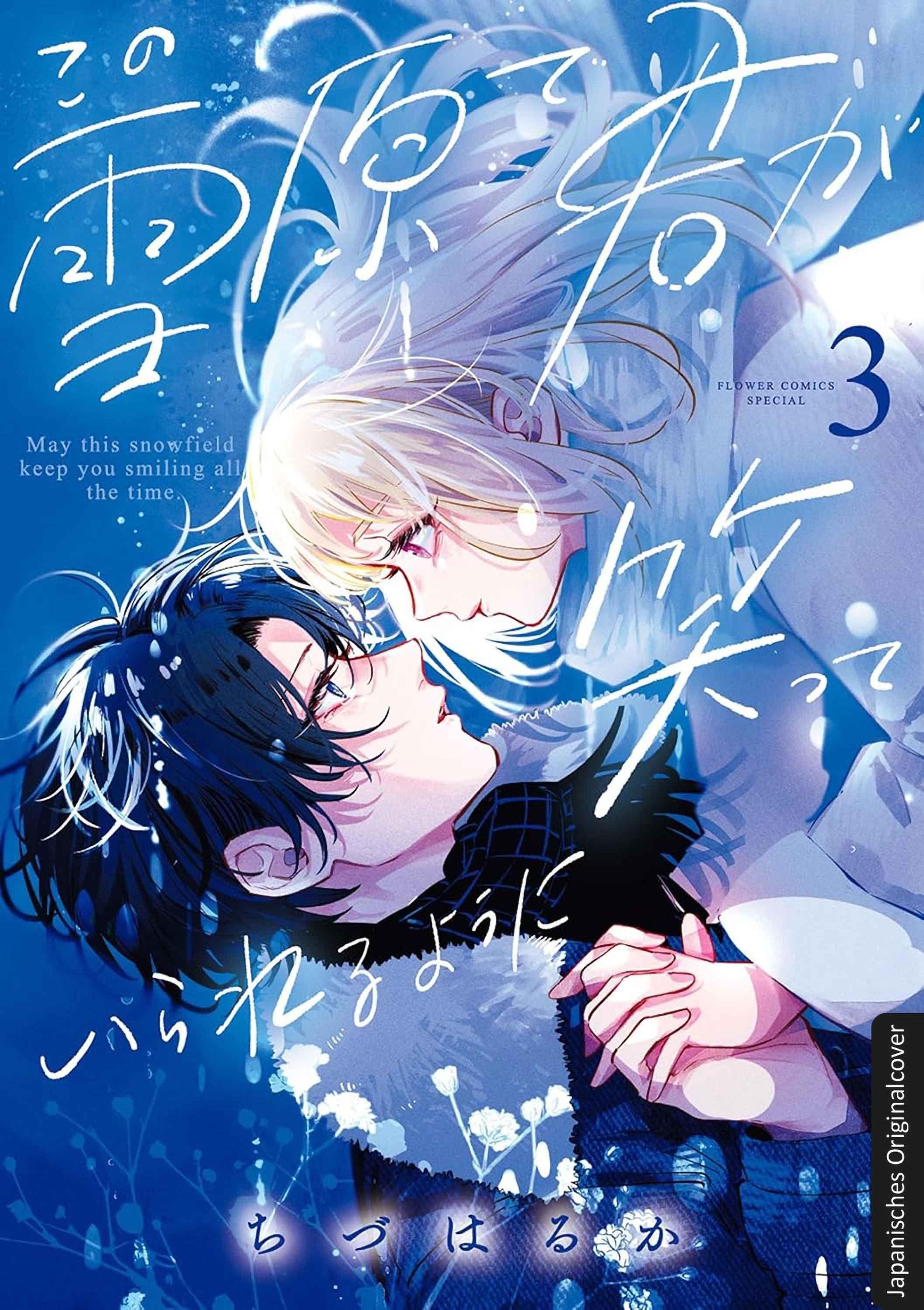 Zwei Personen in inniger Pose, umgeben von Schnee und Blumen. Text: "May this snowfield keep you smiling all the time.", Buch
