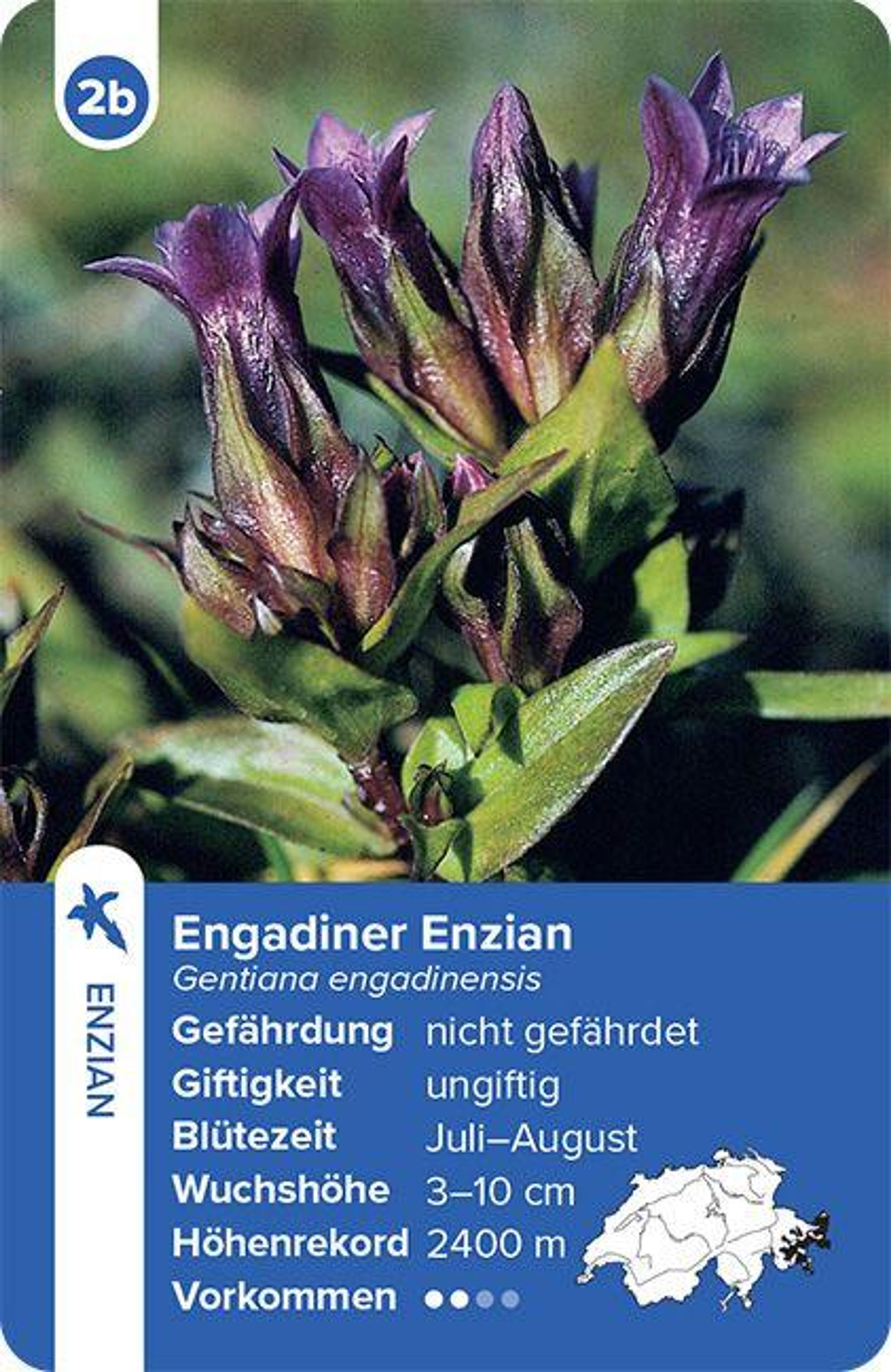 Mit diesem Quartett lernen die Spielenden 32 einheimische Blütenpflanzen kennen und können diese in einem unterhaltsamen, kinderleichten Wettstreit miteinander vergleichen. Es ist ein kurzweiliges Spiel für die Pausen auf Familienwanderungen, botanischen Exkursionen oder für den Hüttenabend.
