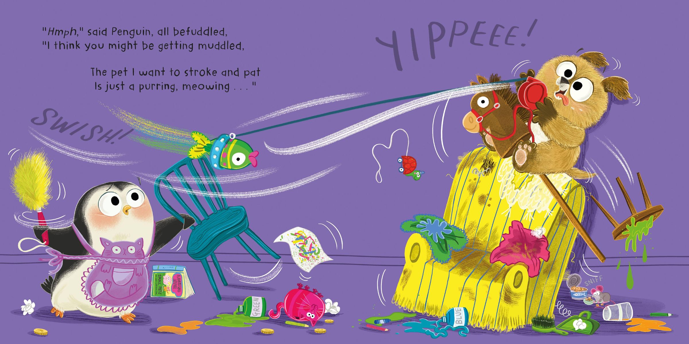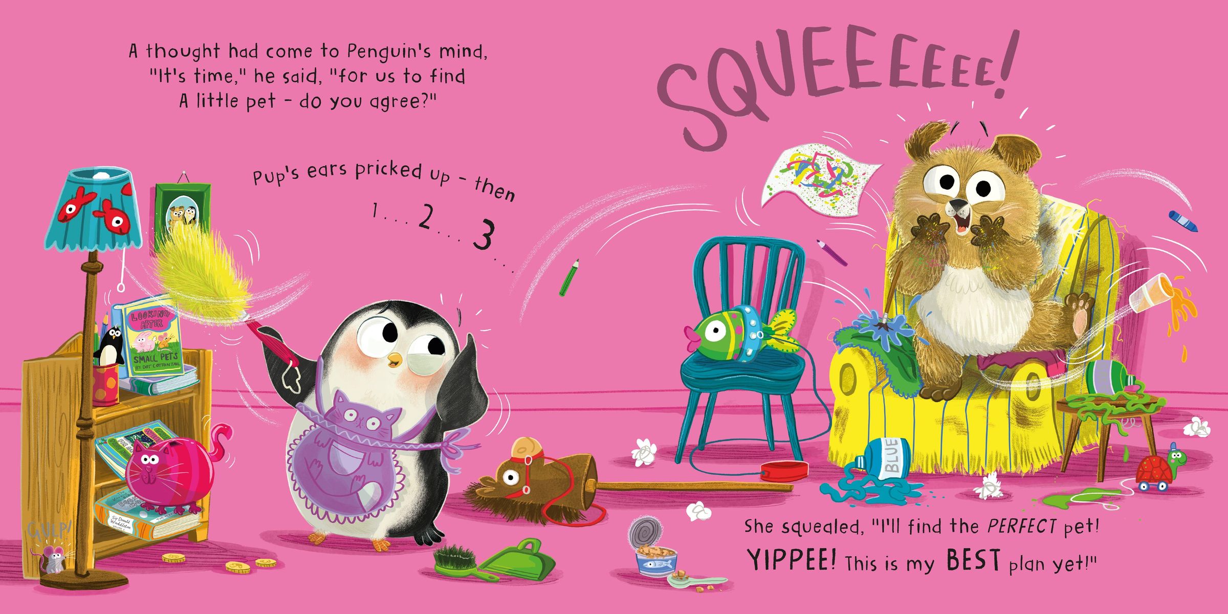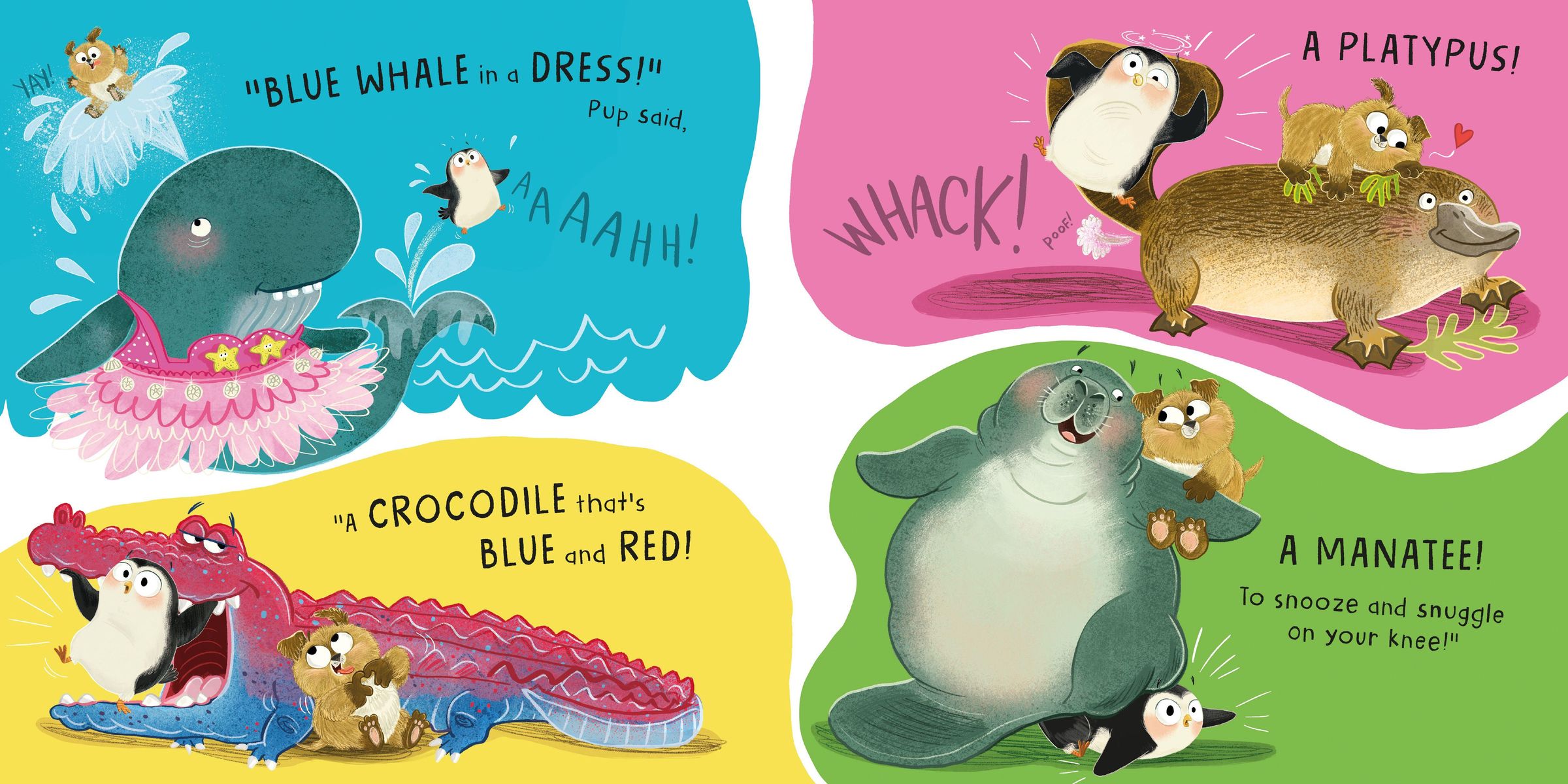 Like lots of friends, Penguin and Pup like VERY different things. Especially when it comes to finding the perfect new addition to their family. All Penguin wants is a something small and fluffy. Pup, in typical Pup fashion, thinks the BIGGER the better. A blue whale in a dress! A giant sloth! A unicorn! It's a recipe for disaster, and LOTS of laughter, but will they ever agree on a perfect pet?