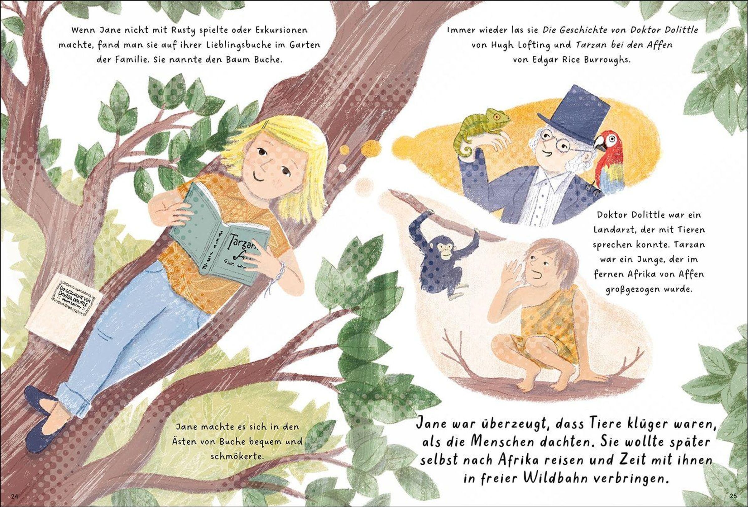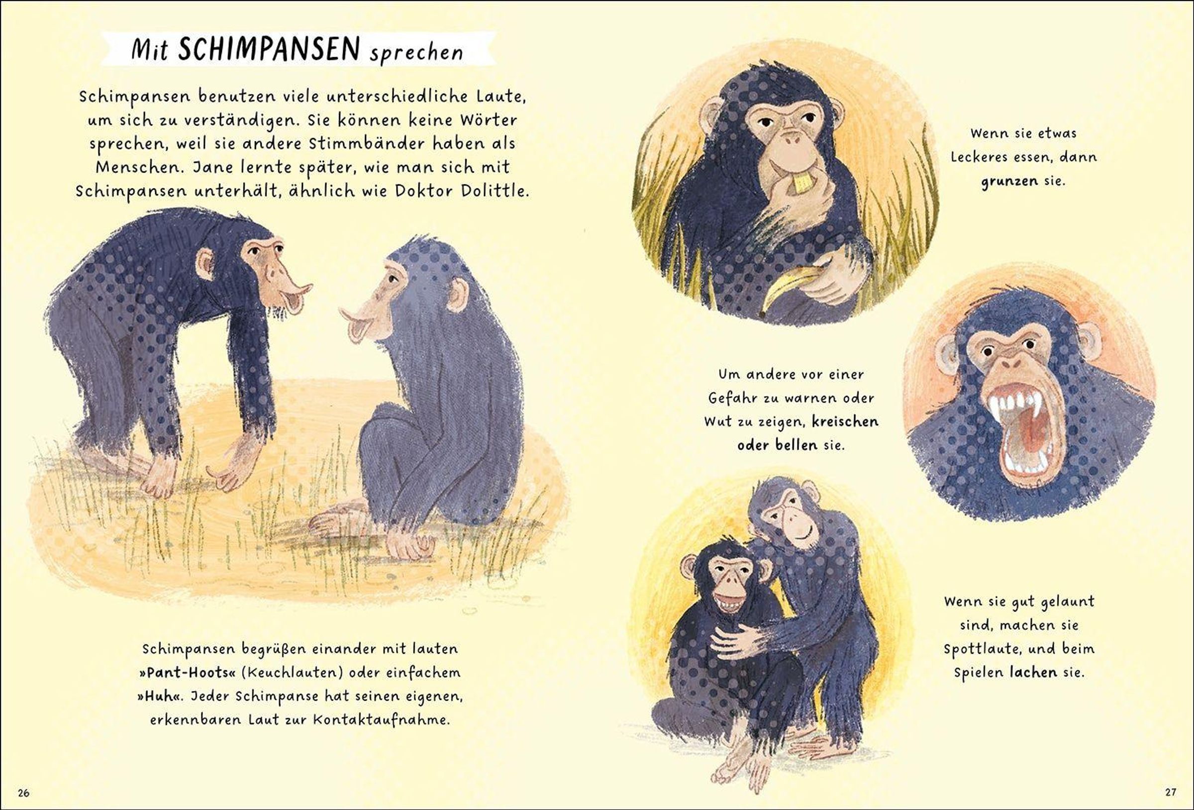 Wünscht ihr euch auch manchmal, ihr könntet mit Tieren sprechen? Jane Goodall war von klein auf fasziniert davon wie Tiere sich verhalten und kommunizieren. Dem Hund Rusty brachte sie Tricks bei und die Hühner im Stall beobachtete sie so lange, dass ihre Eltern dachten sie sei verschwunden. Ihr größter Wunsch war es Tierforscherin zu werden. Deshalb reiste sie als Erwachsene in den Dschungel Tansanias und beobachtete eine Gruppe von wilden Schimpansen. Doch Jane war keine gewöhnliche Forscherin: sie hatte ihre ganz eigene Art mit Tieren zu kommunizieren und gab ihnen als Aktivistin eine Stimme.