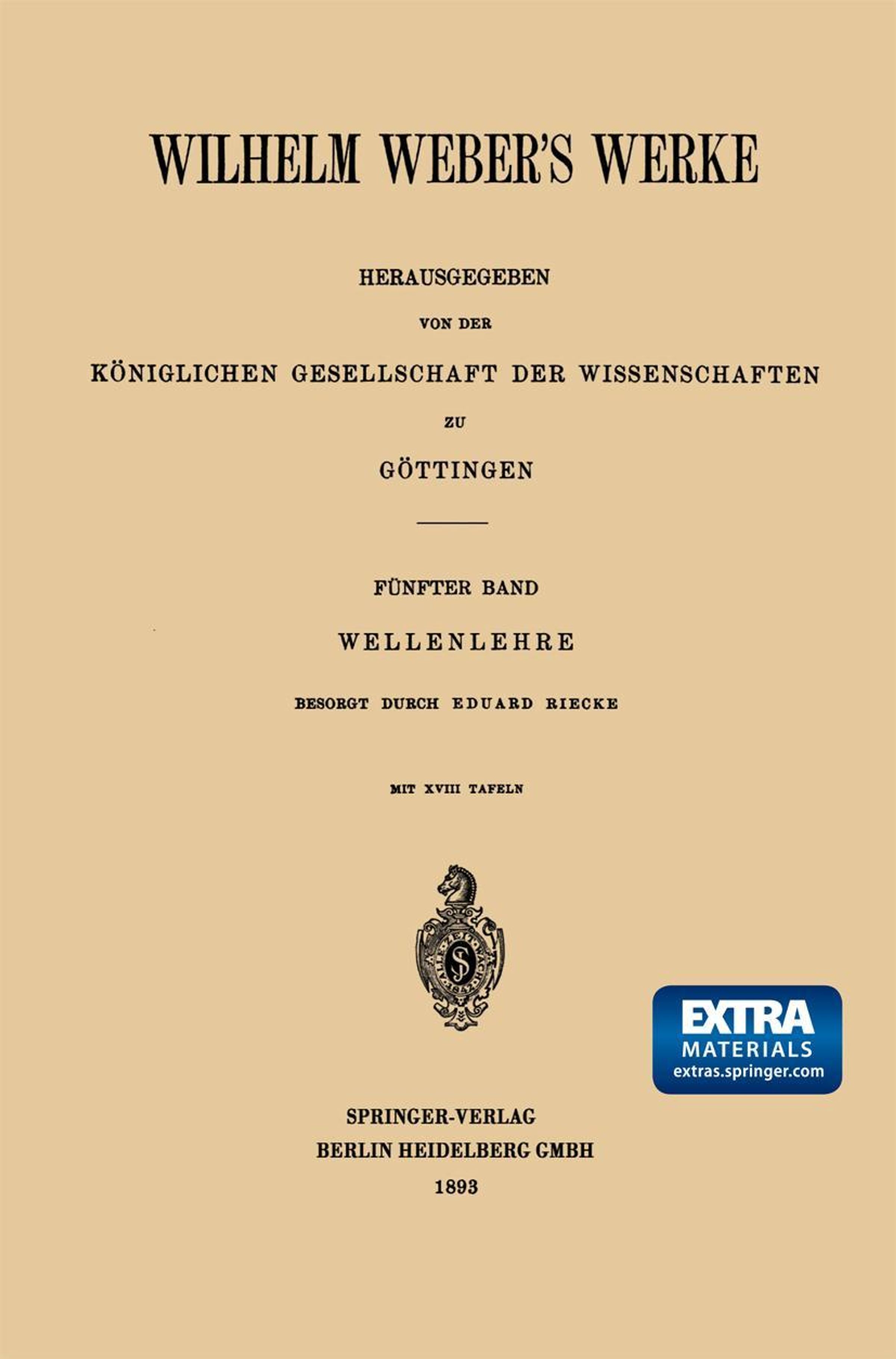 IY heit der beiden Bewegungsarten aufdeckten. Im Zusammenhange des Ganzen durften aber die drei Paragraphen über die Entstehung der Wirbel nicht unterdrückt werden. Der zweite Haupttheil des Werkes behandelt die ,r ellen in Bezug auf Schall und Licht; er tritt dem Umfange nach gegen den ersten zurück und besitzt auch nicht mehr eine so unmittelbare Bedeutung wie jener. An Stelle der Andeutung des § 249 über einen Zusammen hang zwischen dem Klang einer Saite und der Gestalt, die sie bei ihrer Schwingung abwechselnd annimmt, ist die umfassende Theorie der Obertöne und Vokalklänge getreten; neue Methoden der Beobachtung, neue instrumentelle Hülfsmittel von grosseI' Vollkommenheit wurden geschaffen, die Resultate der Forschnng durch ausgezeichnete Werke allgemeiner zugänglich gemacht. Immer aber enthält die WEBER'sche \Vellenlehre auch in ihrem der Akustik gewidmeten Theile eine Reihe von grundlegenden Beobachtungen, auf welche anch jetzt noch jede Darstellung der Akustik zurückgreifen wird. Wir erinnern mit Bezug hierauf an die Messungen der Geschwindigkeit von Seil wellen, an die Untersuchungen über Zungenpfeifen und über die Oerter der Stille in der Umgebung schwingender Stimmgabeln. Der Wellenlehre des Lichts sind nur wenige Paragraphen gewidmet; der eigenen experimentellen Arbeit der Verfasser lag die Optik fern und FRESNEL hatte erst wenige Jahre früher die Reihe seiner Arbeiten eröffnet; im selben Jahre mit der Wellenlehre erschien zum ersten Male die Uebersetzung einer FREsNEL'schen Abhandlung in den POGGEN DORFl
