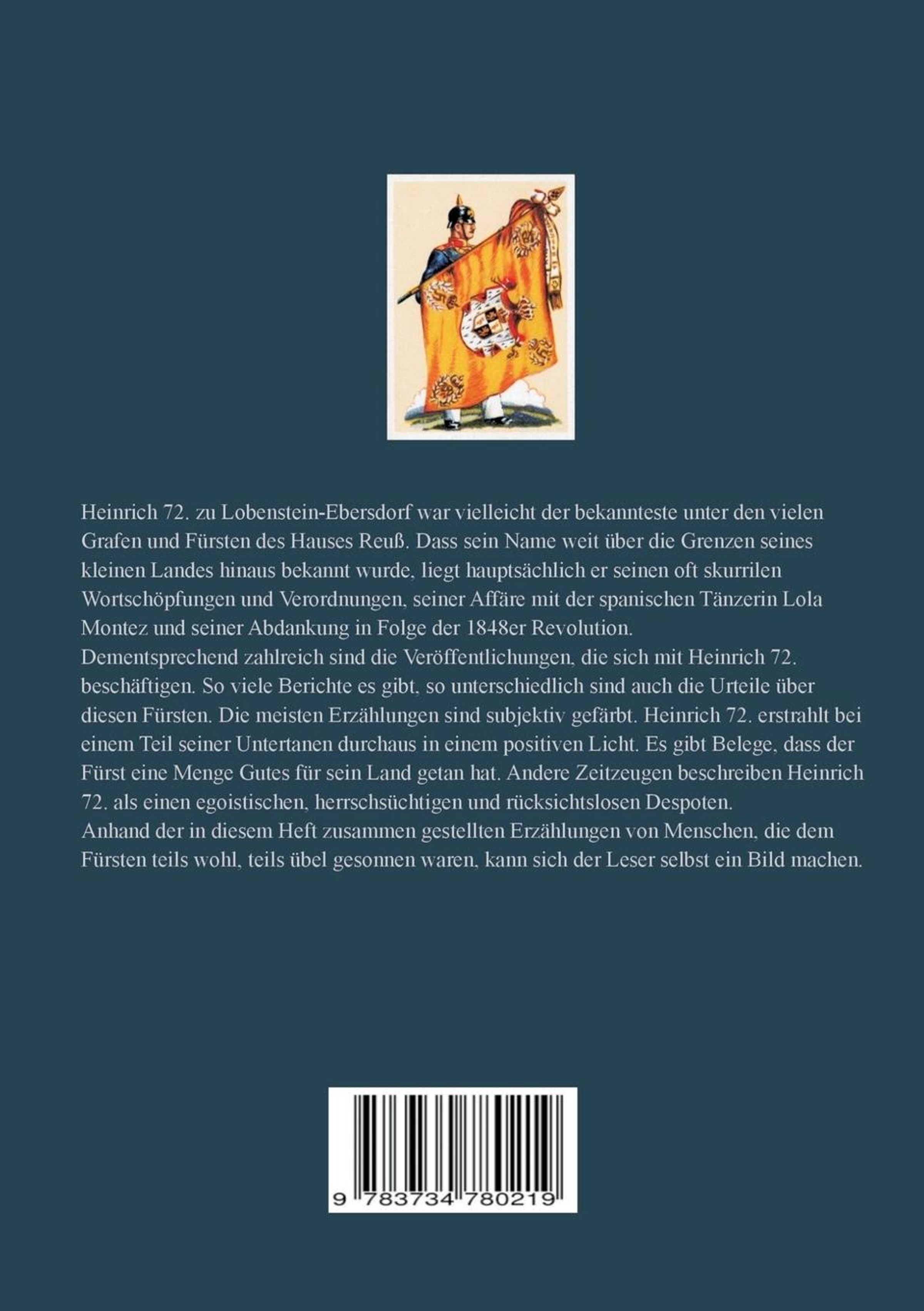 Heinrich 72. zu Lobenstein-Ebersdorf war vielleicht der bekannteste unter den vielen Grafen und Fürsten des Hauses Reuß. Dass sein Name weit über die Grenzen seines kleinen Landes hinaus bekannt wurde, liegt hauptsächlich er seinen oft skurrilen Wortschöpfungen und Verordnungen, seiner Affäre mit der spanischen Tänzerin Lola Montez und seiner Abdankung in Folge der 1848er Revolution. Dementsprechend zahlreich sind die Veröffentlichungen, die sich mit Heinrich 72. beschäftigen. So viele Berichte es gibt, so unterschiedlich sind auch die Urteile über diesen Fürsten. Die meisten Erzählungen sind subjektiv gefärbt. Heinrich 72. erstrahlt bei einem Teil seiner Untertanen durchaus in einem positiven Licht. Es gibt Belege, dass der Fürst eine Menge Gutes für sein Land getan hat. Andere Zeitzeugen beschreiben Heinrich 72. als einen egoistischen, herrschsüchtigen und rücksichtslosen Despoten. Anhand der in diesem Heft zusammen gestellten Erzählungen von Menschen, die dem Fürsten teils wohl, teils übel gesonnen waren, kann sich der Leser selbst ein Bild machen. Daneben wird aber auch der Fürst selbst zu Wort kommen - und eigene Worte sagen bekanntlich viel über den Menschen aus, der sie gesprochen oder niedergeschrieben hat.
