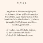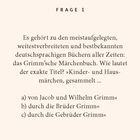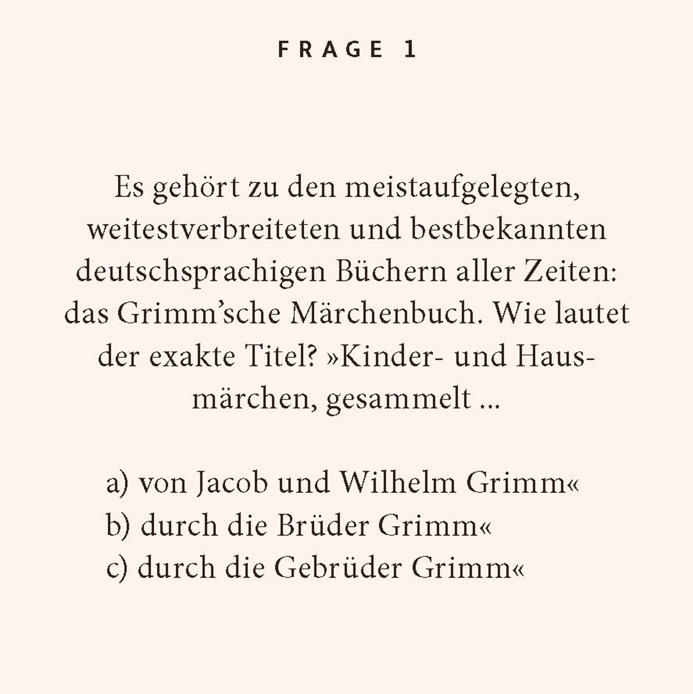 Geschichten von bösen Stiefmüttern, schönen Königstöchtern, tapferen Kämpfern, Hexen, Zauberern, sprechenden Tieren ... Märchen sind wohlvertraute Begleiter unserer Kindheit. Wunder, Verwandlung und der Glaube an das Gute schaffen stets ein glückliches Ende. Das Quiz taucht ein in die sagenhafte Welt der Brüder Grimm, räumt mit Irrtümern auf, spielt mit den Erinnerungen und beschert mitreißende Märchenstunden. Denn wenn sie nicht gestorben sind, dann staunen sie noch heute!