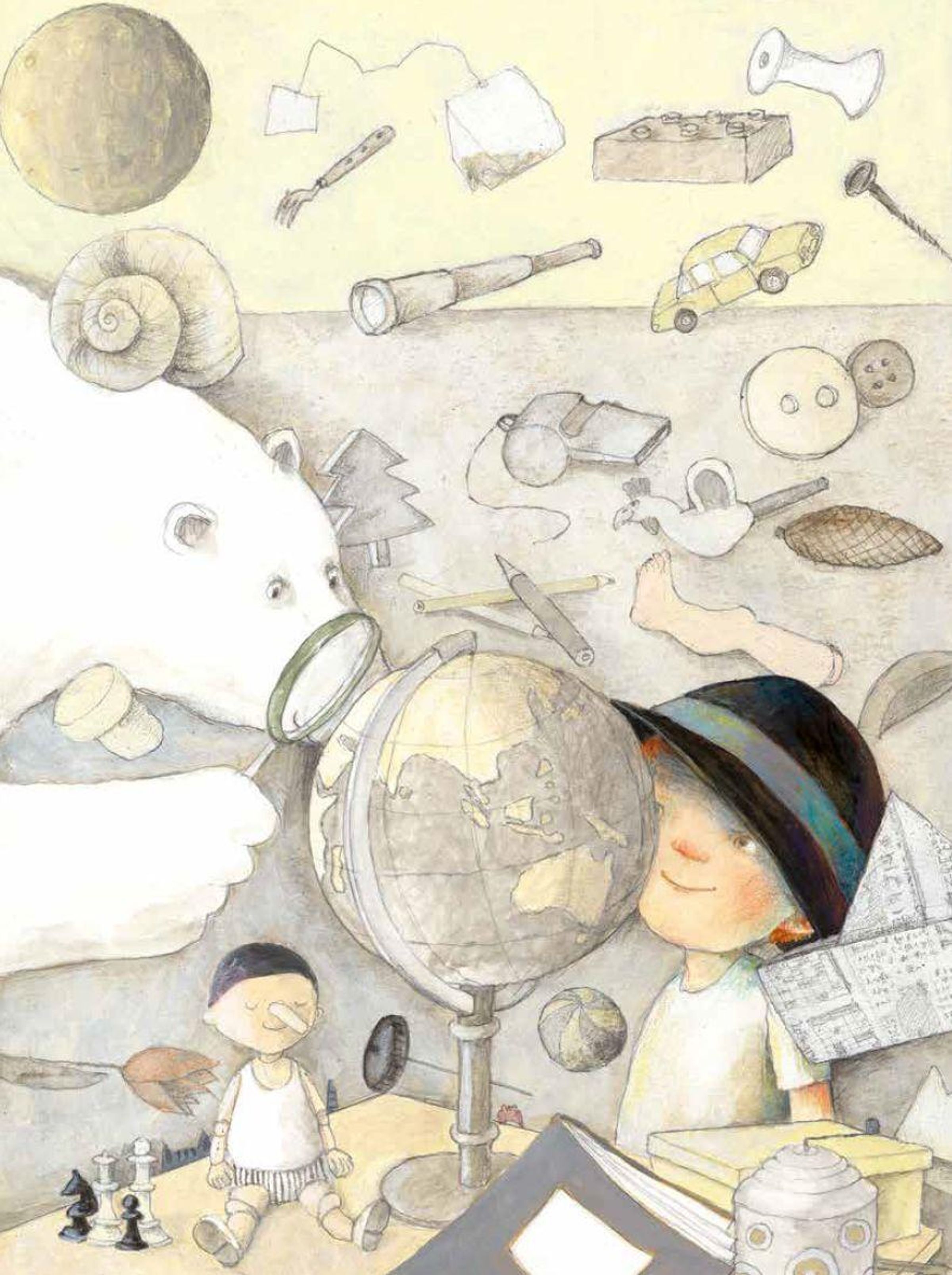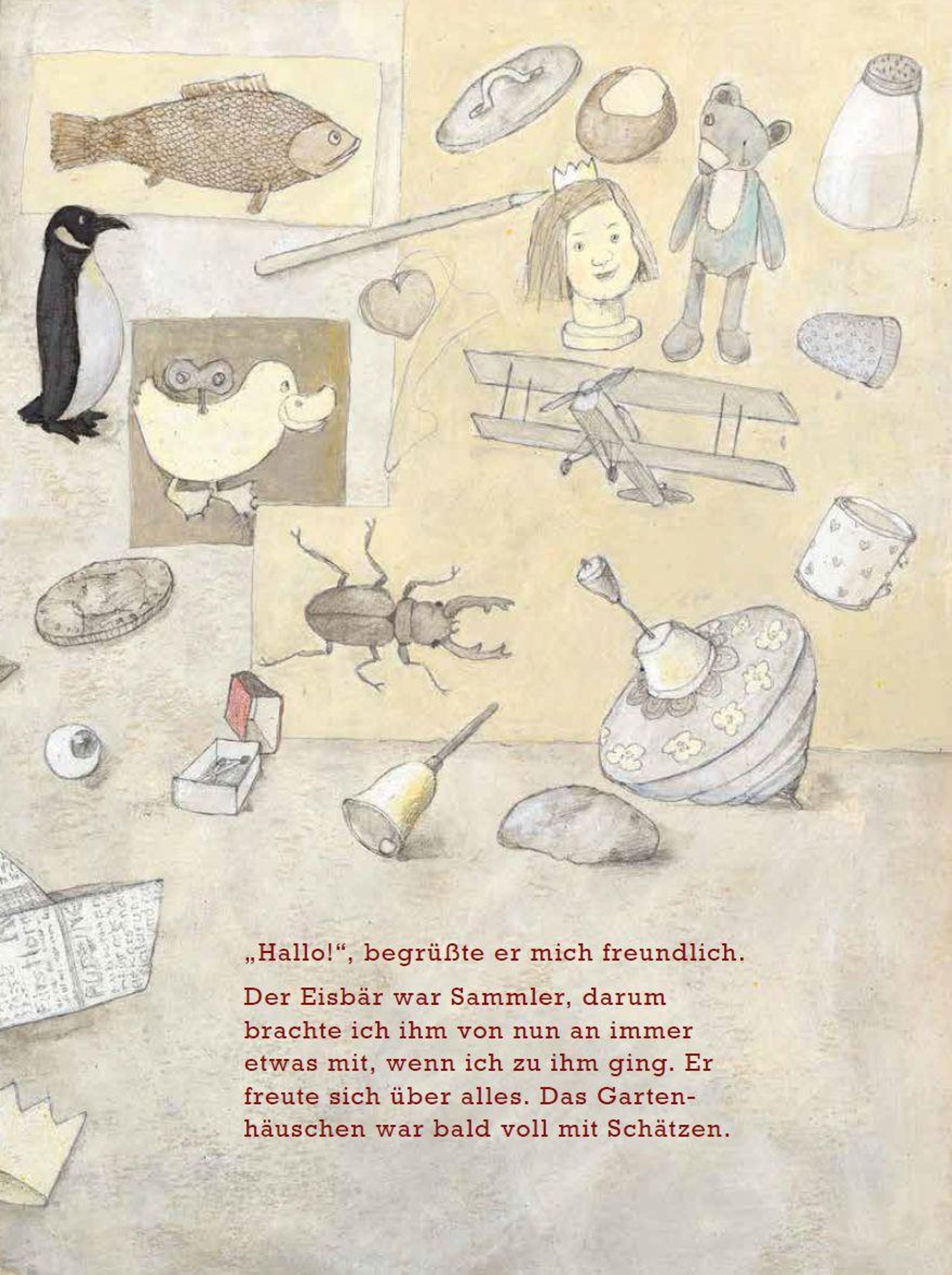 Ich bin umgezogen, und in meinem Gartenhäuschen wohnt ein Eisbär. Er sammelt vieles, bald hat er auch ein Glücksbuch. Je größer der Glücksmoment, desto größer der bunte Punkt im Buch. Drachensteigen ist ein gelber Punkt, hoch oben im Baum sitzen und Kirschen essen ein tiefroter, Schlittschuhlaufen ist türkis. Eines Tages ist er weg, der Eisbär, doch sein Glücksbuch hat er mir dagelassen, zusammen mit den Stiften. Meine neuen Freunde und ich können nun weitersammeln. Der Alltag birgt viele Glücksmomente. Wie gut, mit liebevollen Sätzen und detailreichen Bildern daran erinnert zu werden.