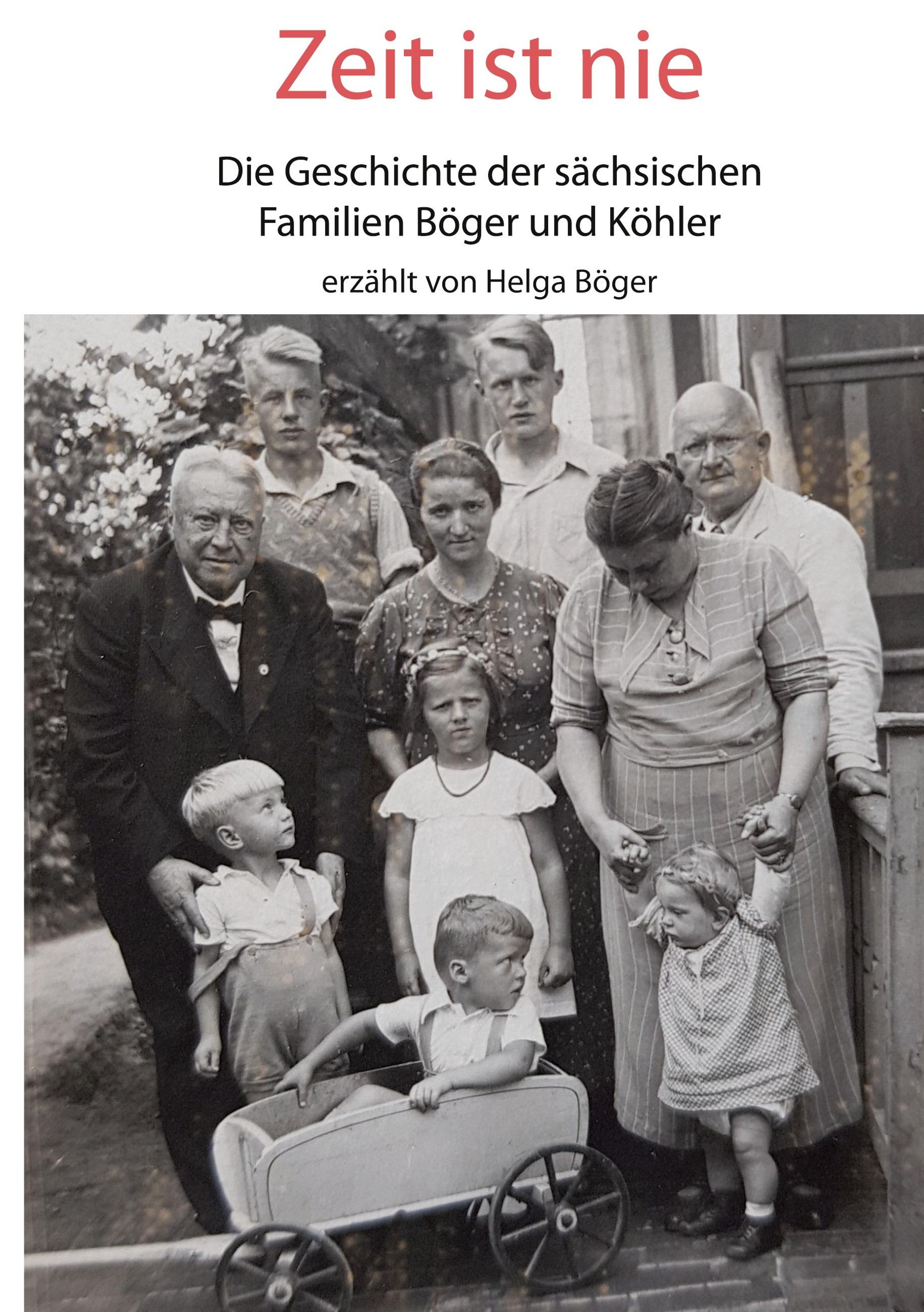 „Zeit ist nie. Die Geschichte der sächsischen Familien Böger und Köhler erzählt von Helga Böger.“ Familienfoto mit neun Personen., Buch
